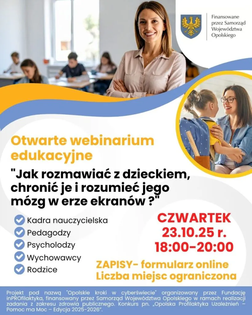 Zaproszenie dla społeczności szkolnej (Kadrę, Rodziców) na bezpłatne spotkanie/szkolenie pt. “Jak rozmawiać z dzieckiem, chronić je i rozumieć jego mózg w erze ekranów?” Szkolenie jest