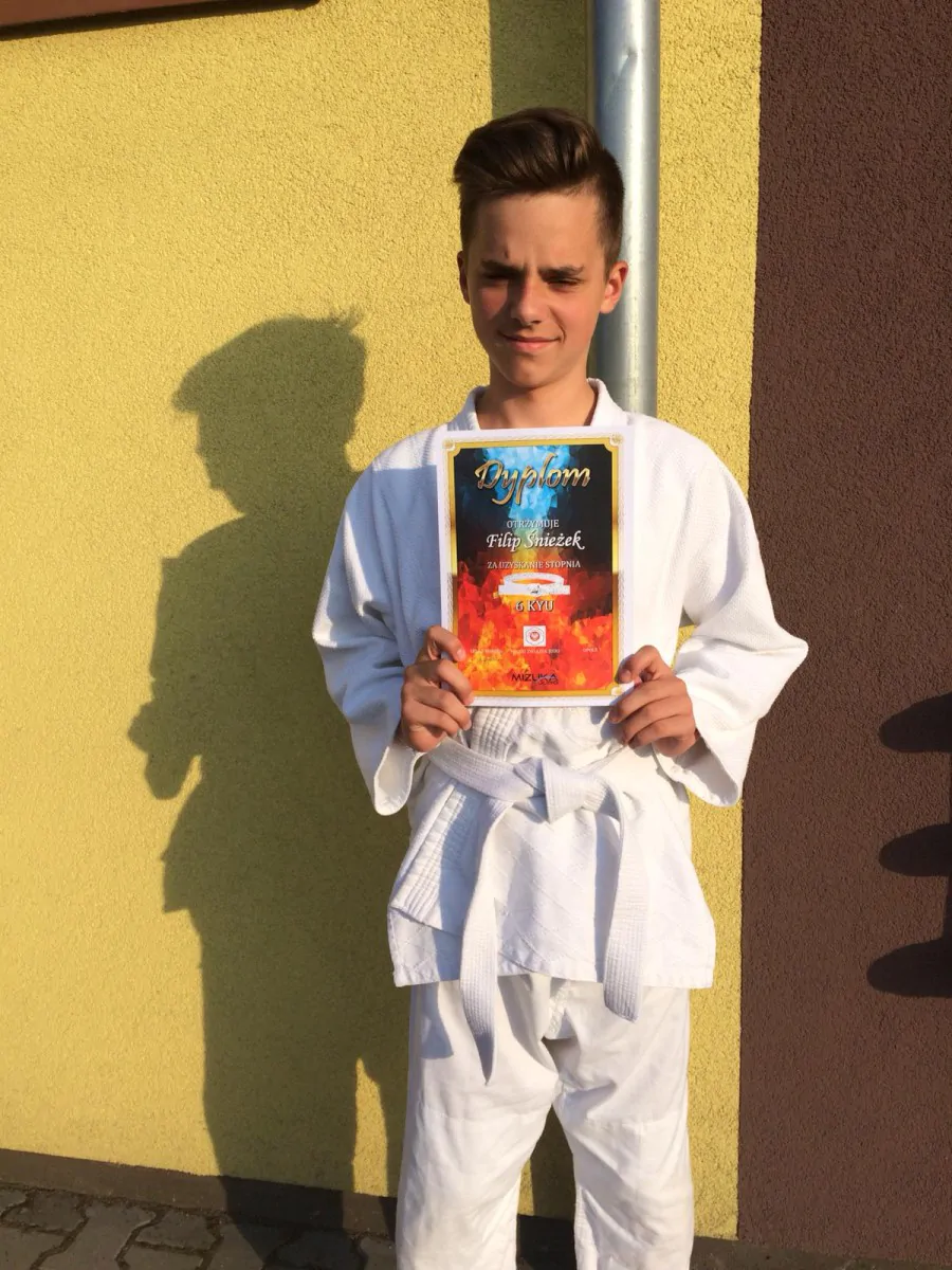 Mówi o sobie tak: Zachęcił mnie mój brat. Trenuję dopiero od lutego tego roku, a już 14 czerwca uzyskałem stopień 6 KYU (czyt. biały pas)