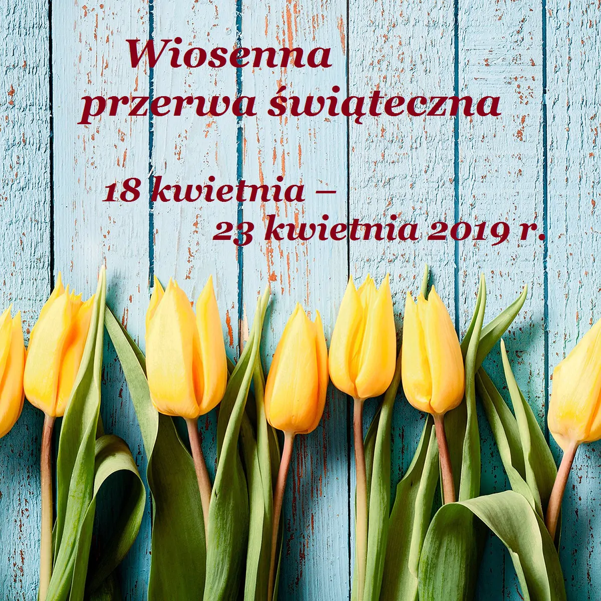 Wiosenna przerwa świąteczna 18 kwietnia – 23 kwietnia 2019 r.Podstawa prawna:§ 3 ust. 1 pkt. 3 rozporządzenia Ministra Edukacji Narodowej i Sportu z dnia 18