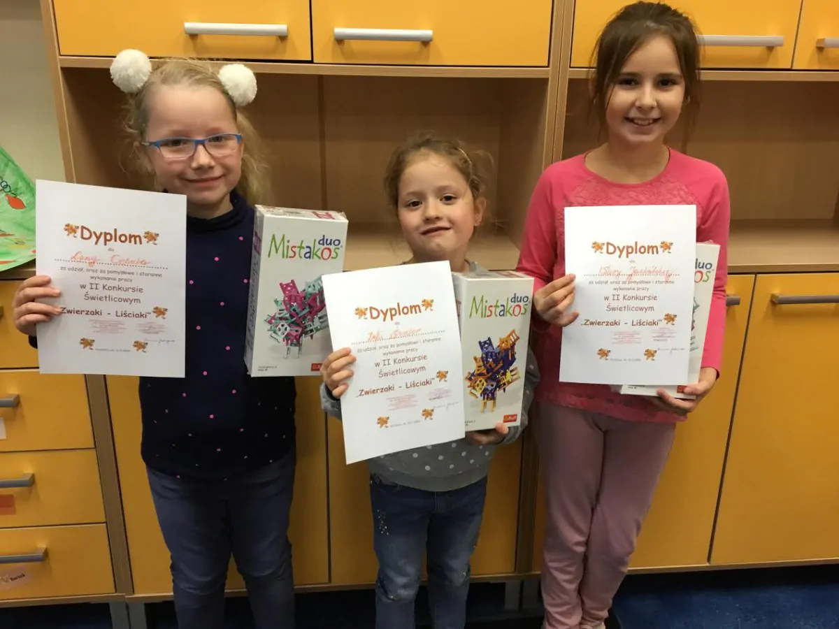 Rozstrzygnięto kolejny konkurs świetlicowy pod hasłem „Zwierzaki-liściaki”. Nagrody otrzymały Zosia i Lena z klasy I oraz Sara z klasy IV.Tym razem dzieci do wykonania prac