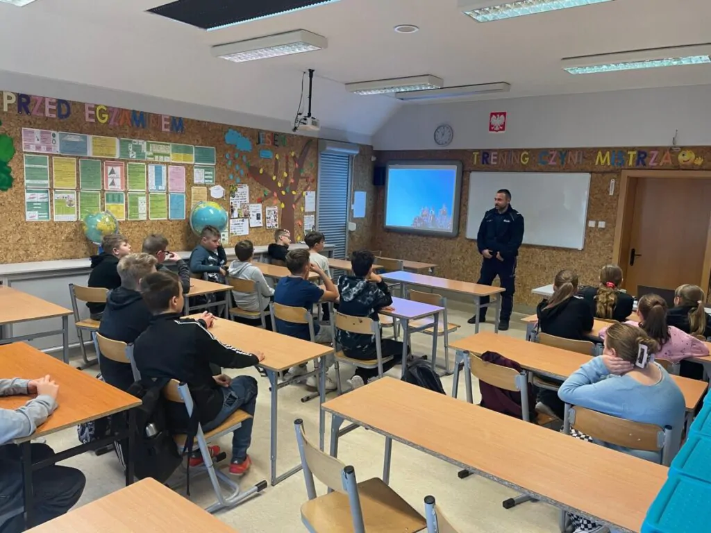 W ramach działań profilaktycznych realizowanych w naszej szkole w ostatnim czasie odbyło się dla klas 4 – 7 spotkanie z dzielnicowym st. sierż. Tomaszem Kopaczem.