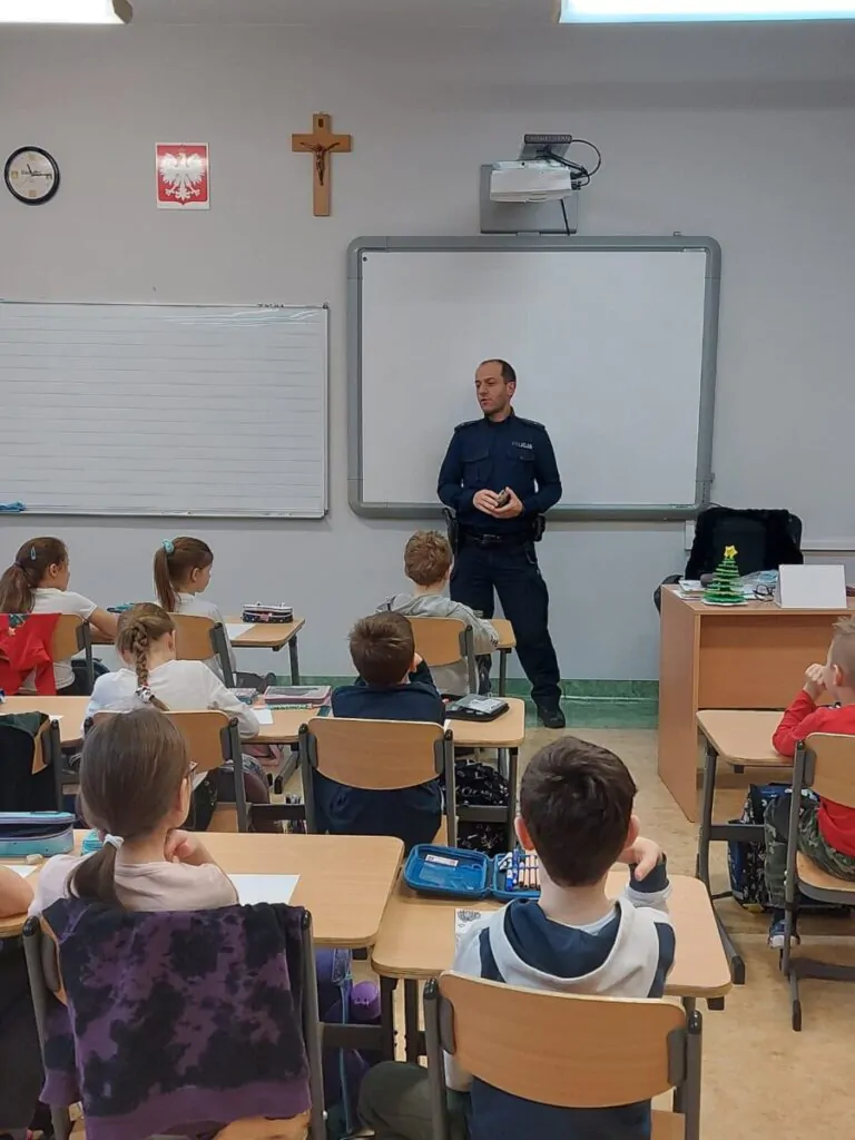 Dbając o bezpieczeństwo naszych uczniów w czasie zbliżających się ferii zimowych nasz dzielnicowy, pan mateusz Kardas przeprowadził spotkanie profilaktyczno-edukacyjne da uczniów klas 1 – 3