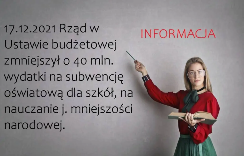 Szanowni Państwo, 17.12.2021 w Ustawie budżetowej zmniejszono o 40 mln wydatki na subwencję oświatową dla szkół, na nauczanie j. mniejszości narodowej. Sprawa będzie miała swój