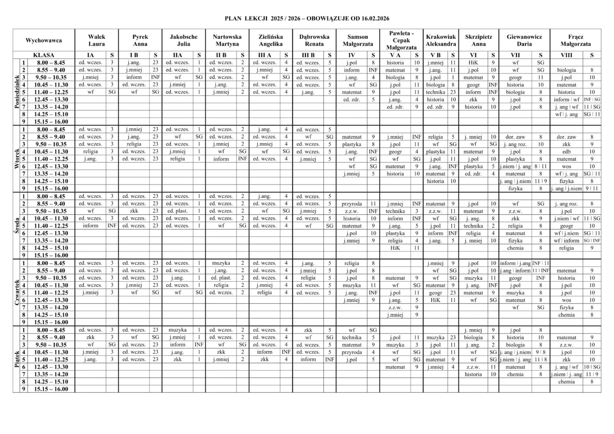 Plan lekcji obowiązujący w roku szkolnym 2025/2026