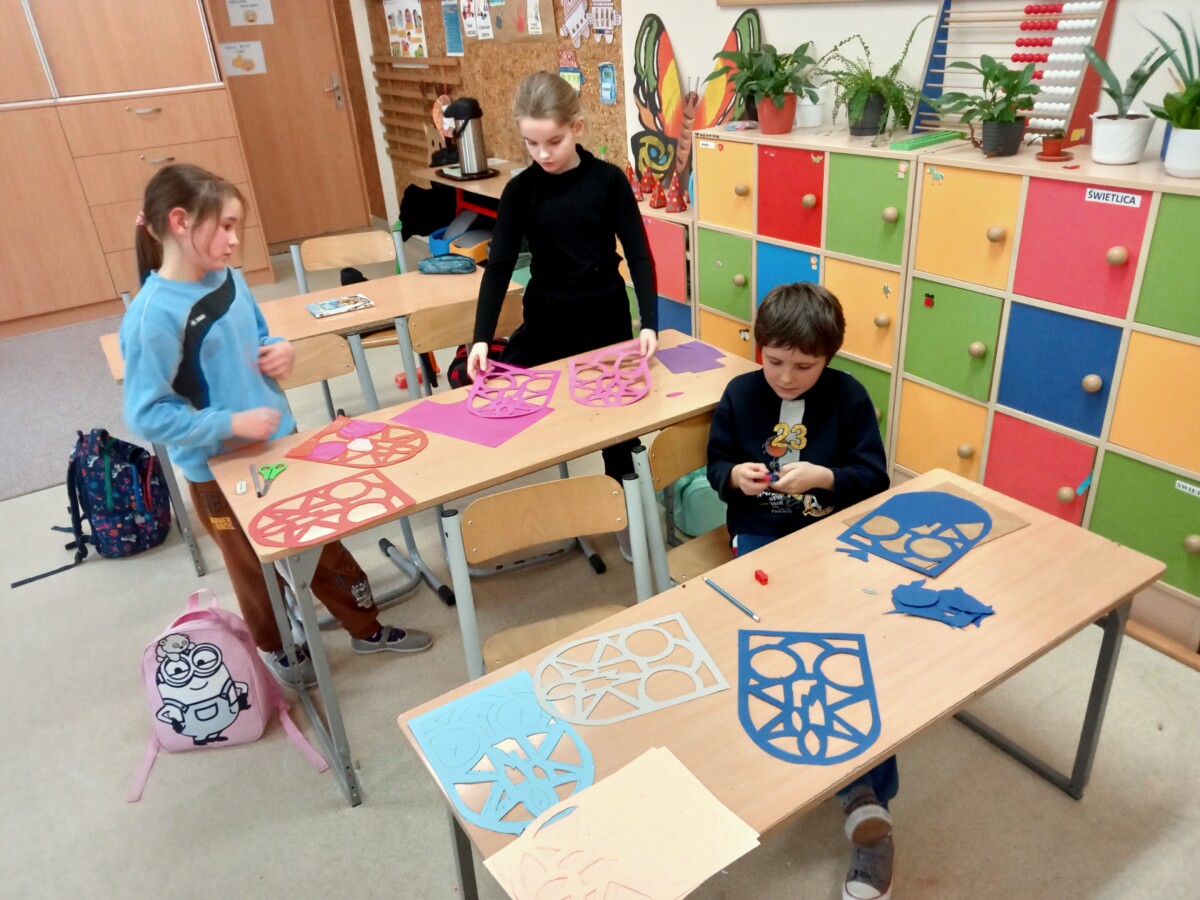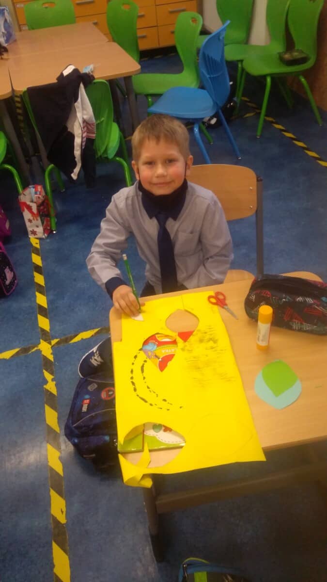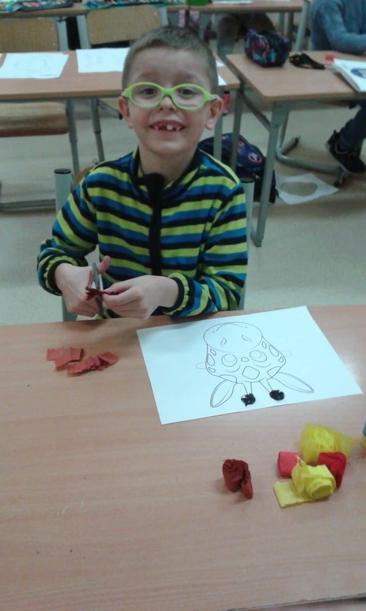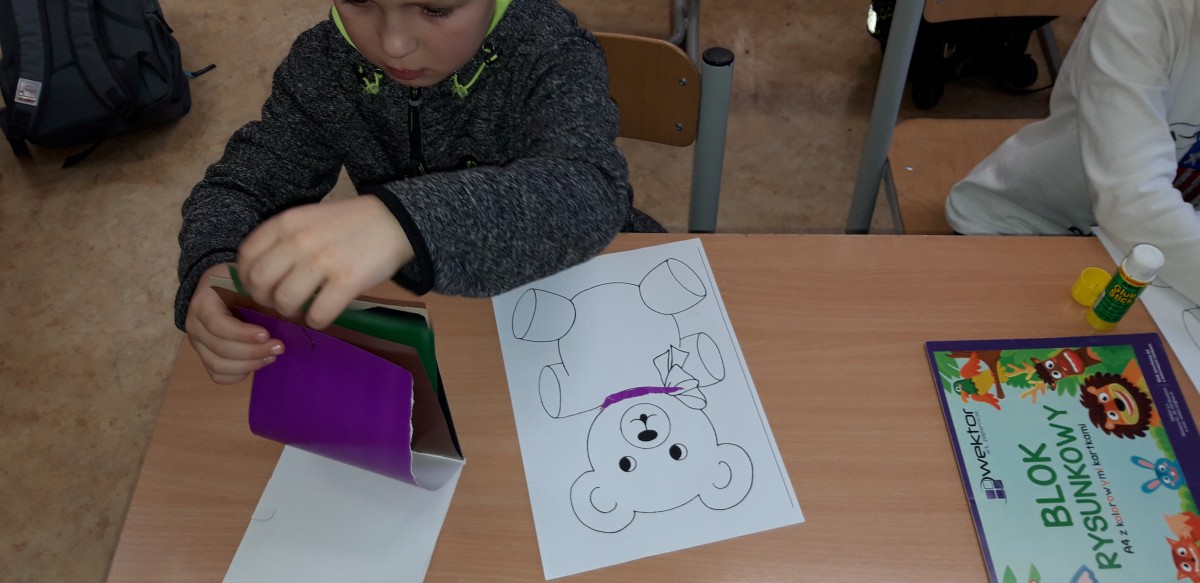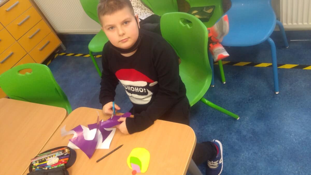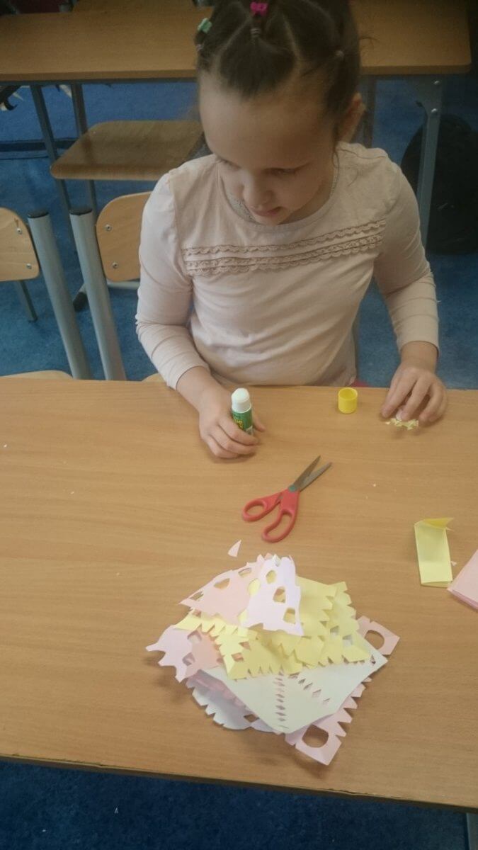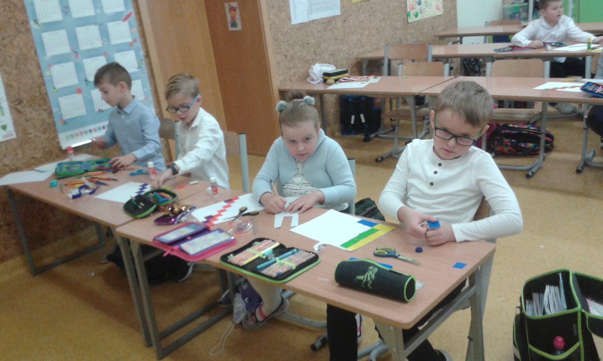 W ramach kolejnych zajęć kształtujących kreatywność uczniowie tym razem wykonywali kolorowe szachownice. To tego zadania wykorzystywali szablon kratki szachownicy, kolorowy papier, klej i nożyczki. Pod koniec lekcji wyszły tęczowe szachownice.