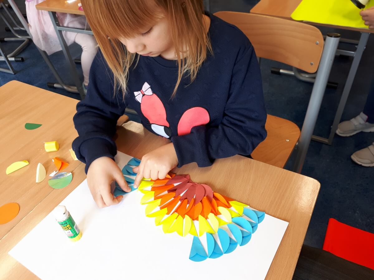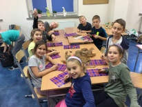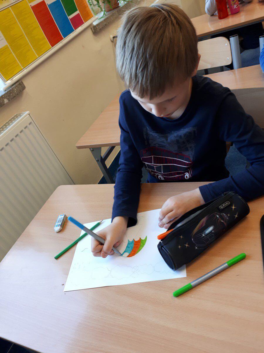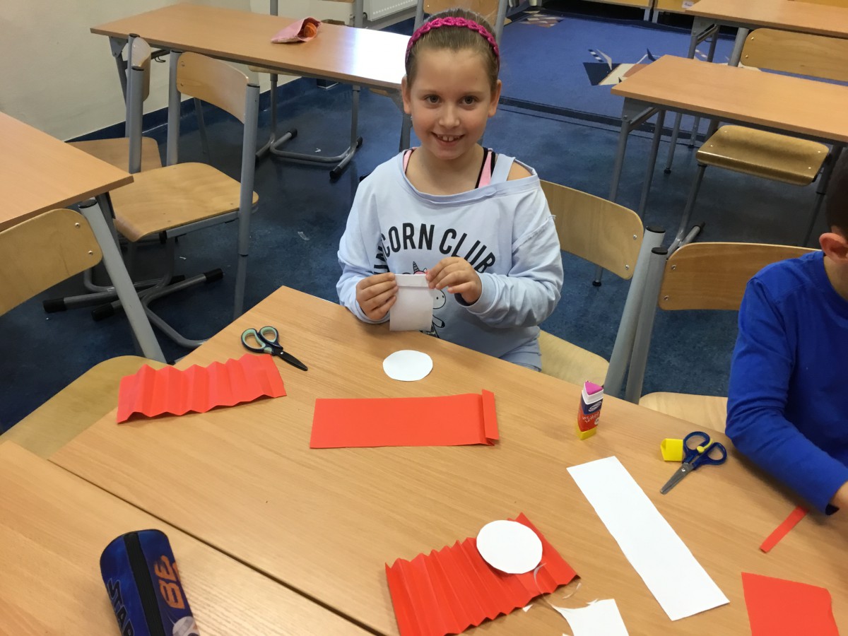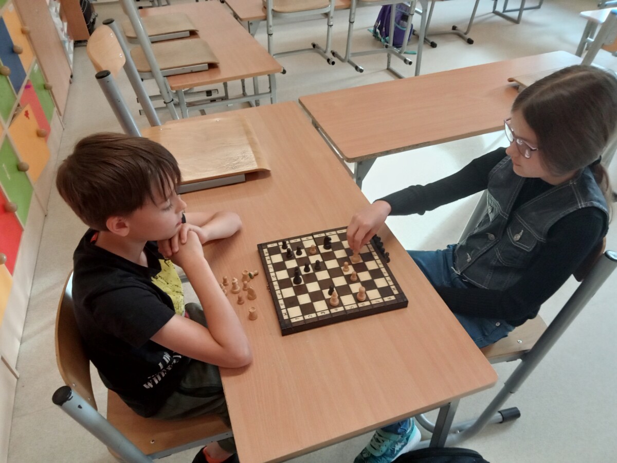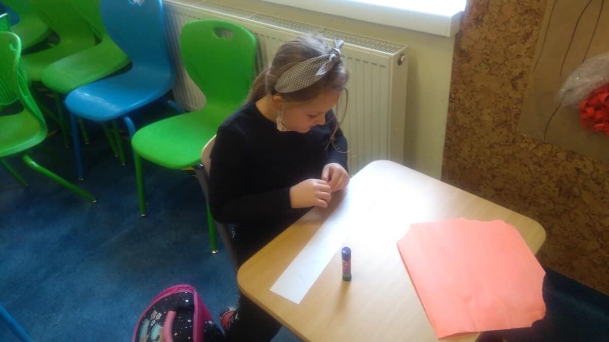 W ramach kolejnych zajęć kształtujących kreatywność uczniowie tym razem wykonywali kolorowe szachownice. To tego zadania wykorzystywali szablon kratki szachownicy, kolorowy papier, klej i nożyczki. Pod koniec lekcji wyszły tęczowe szachownice.