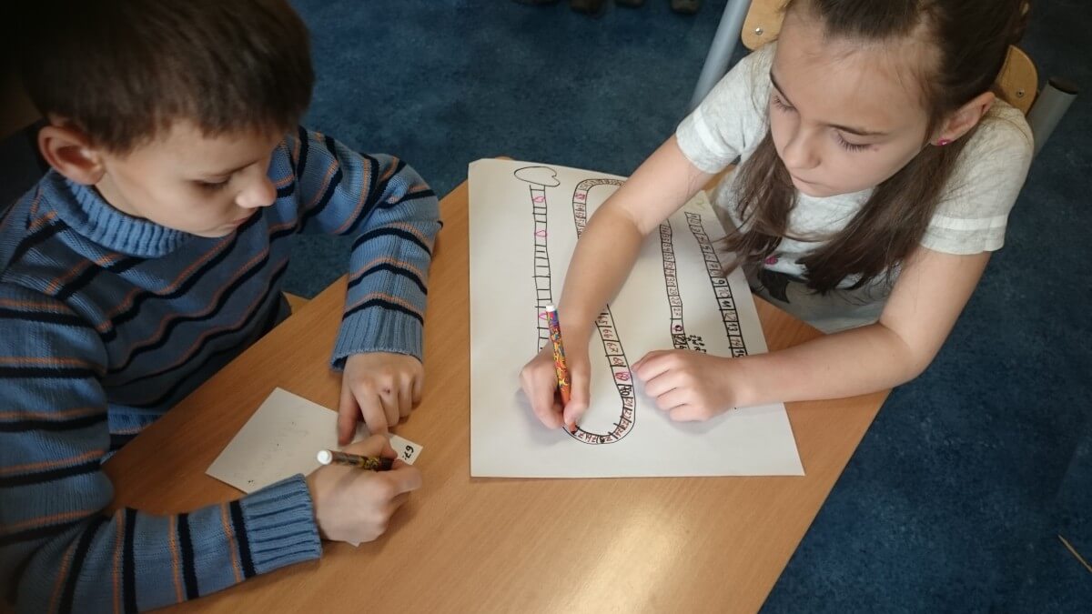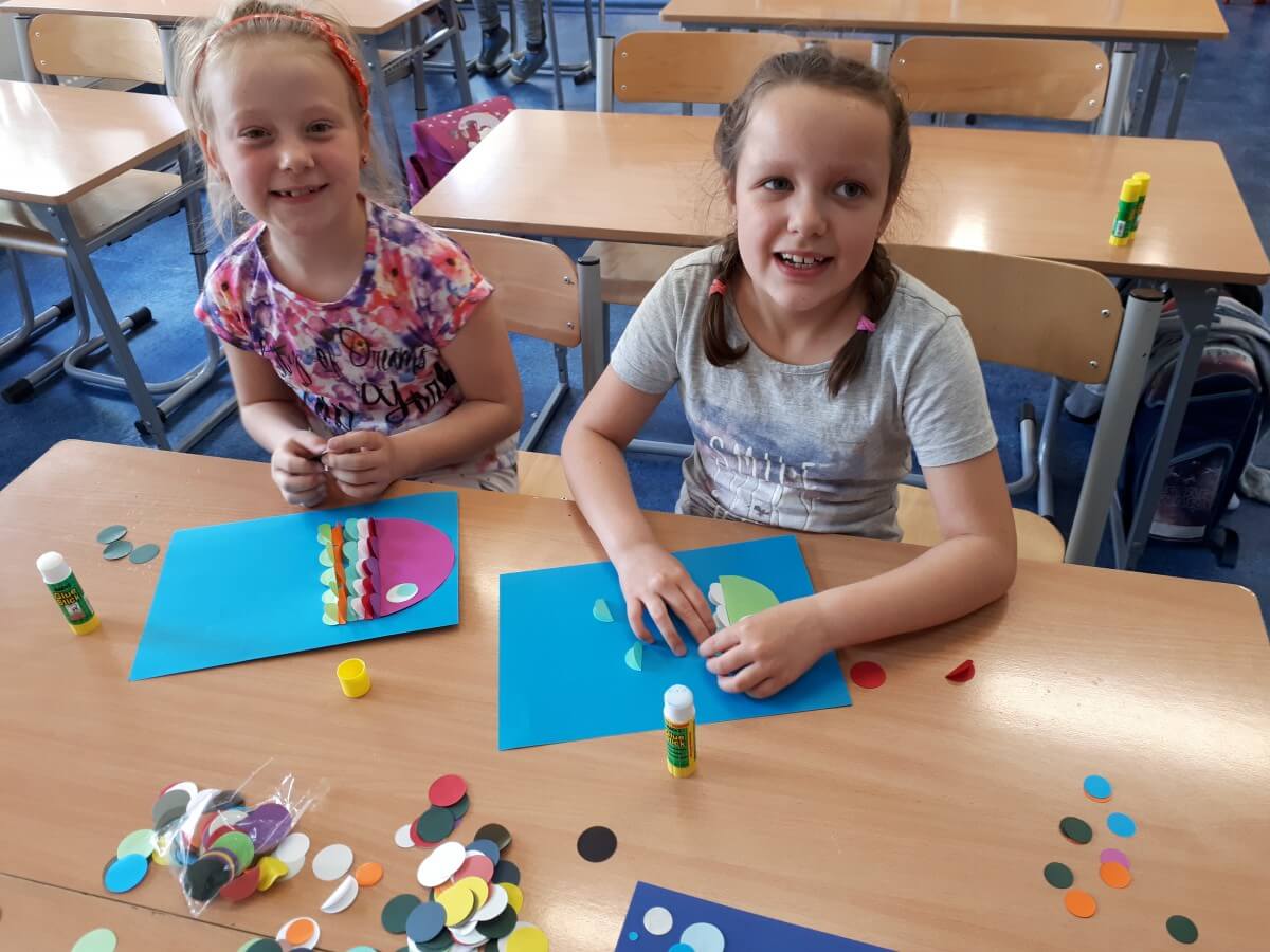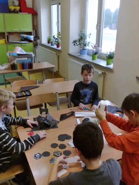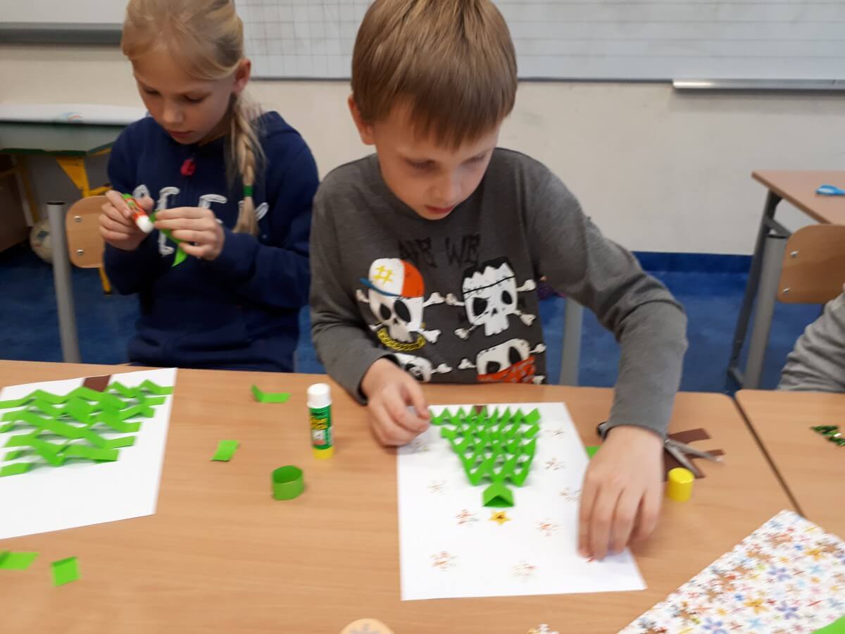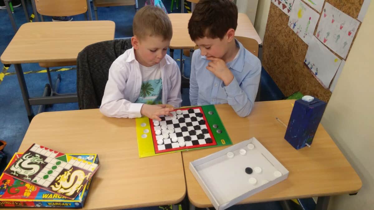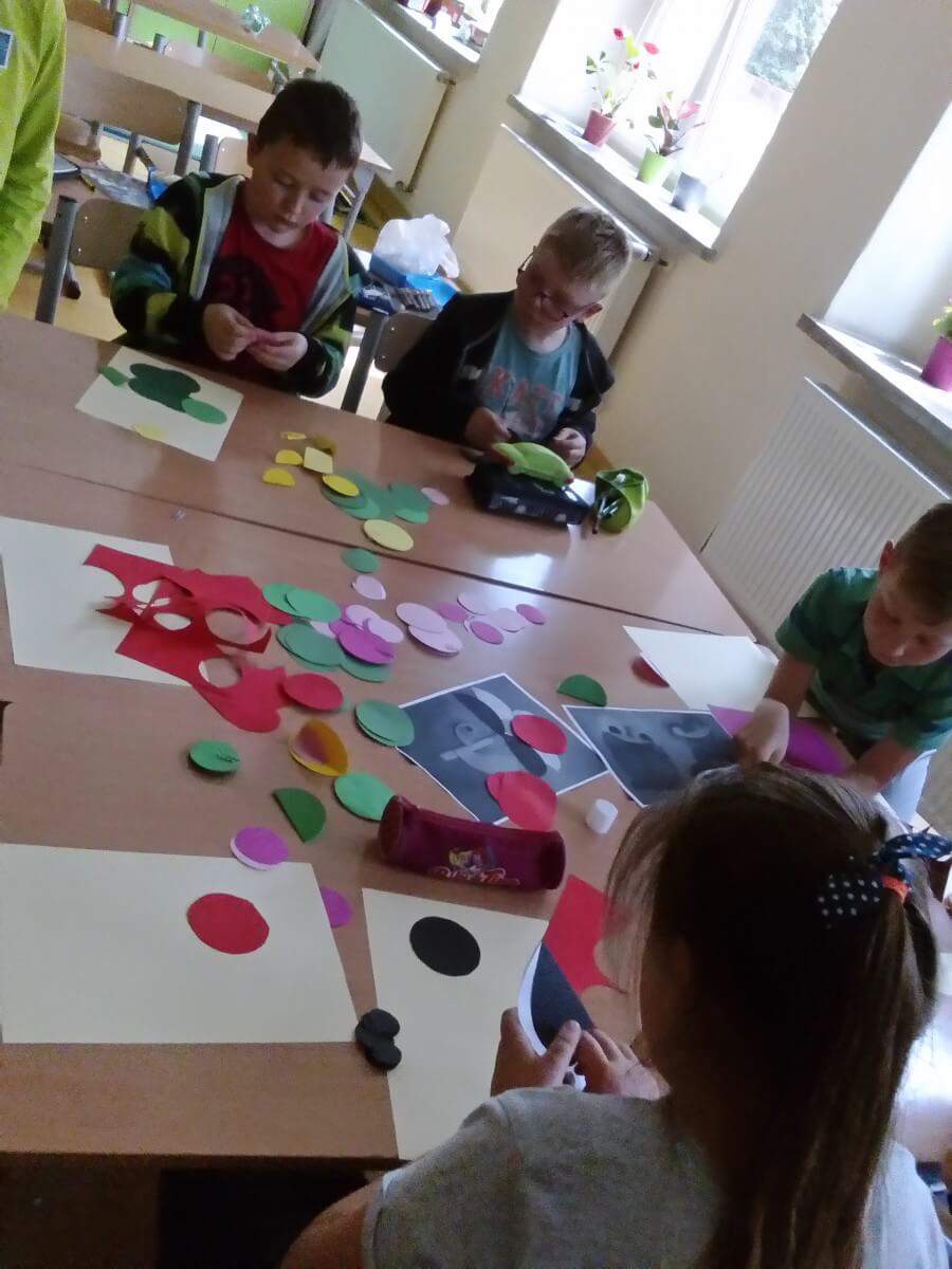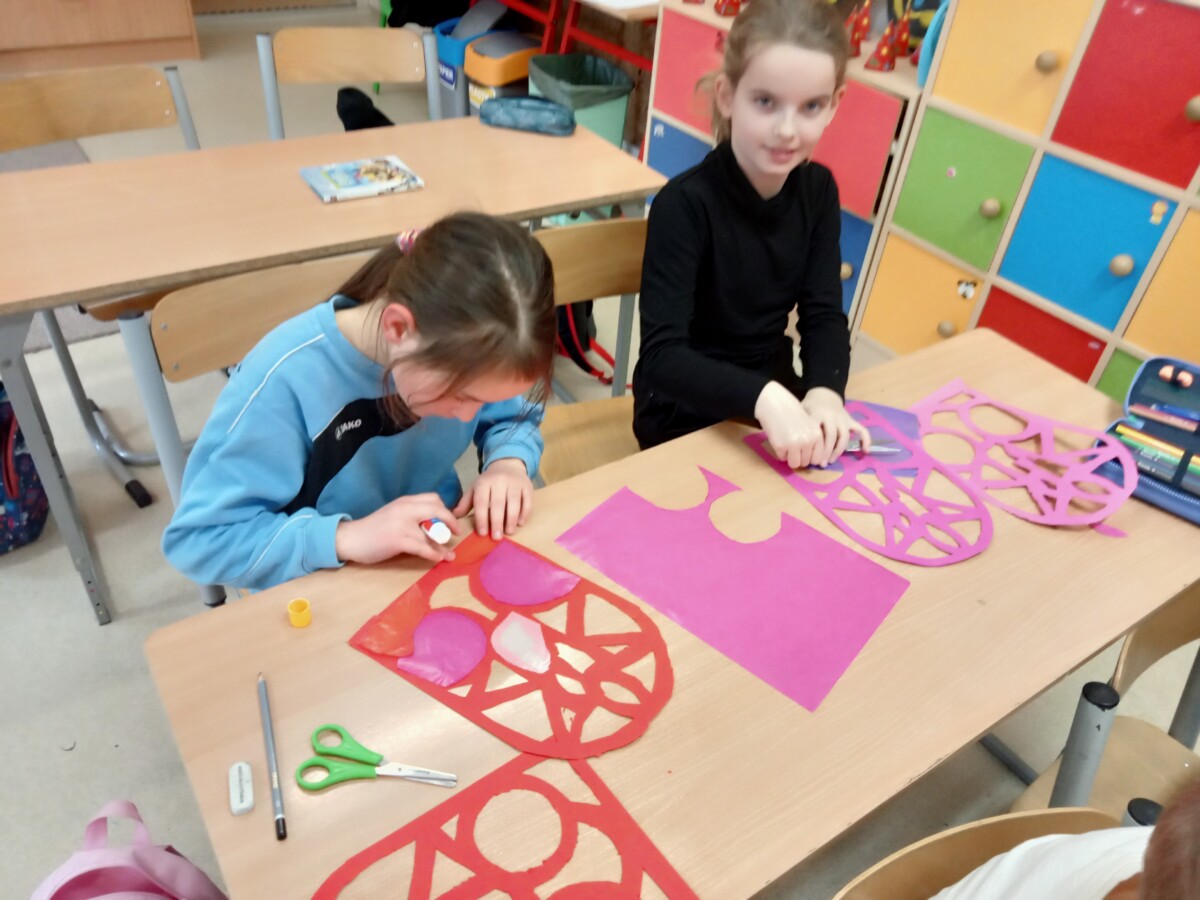 W ramach kolejnych zajęć kształtujących kreatywność uczniowie tym razem wykonywali kolorowe szachownice. To tego zadania wykorzystywali szablon kratki szachownicy, kolorowy papier, klej i nożyczki. Pod koniec lekcji wyszły tęczowe szachownice.