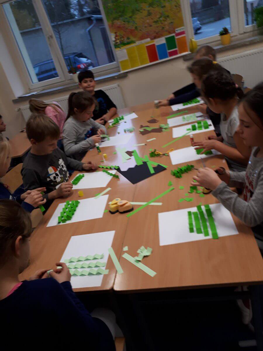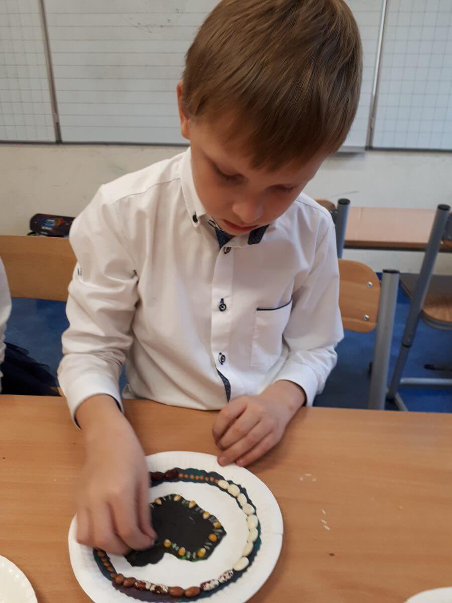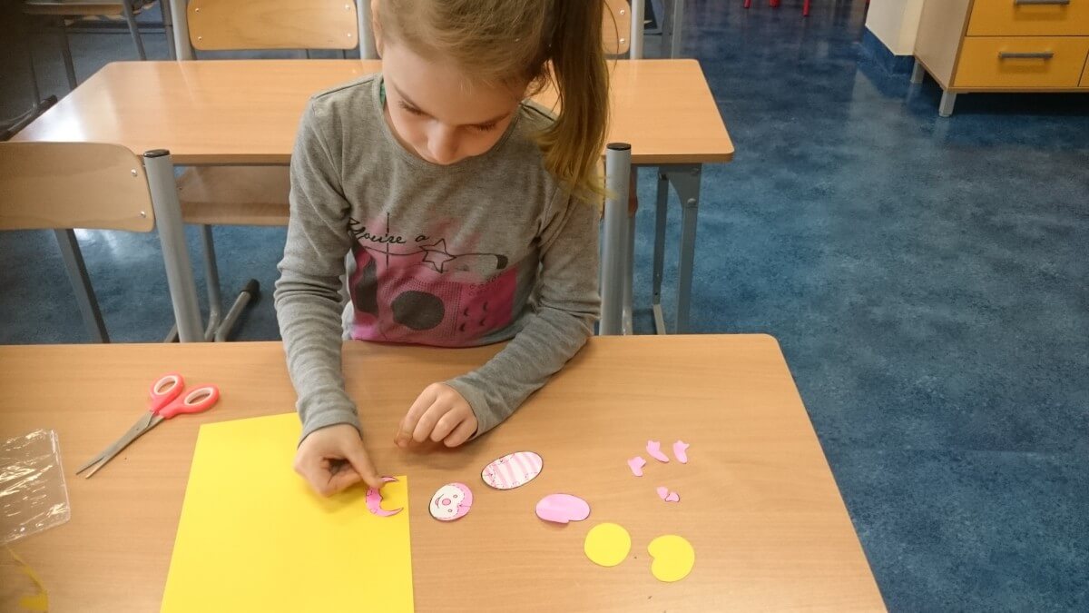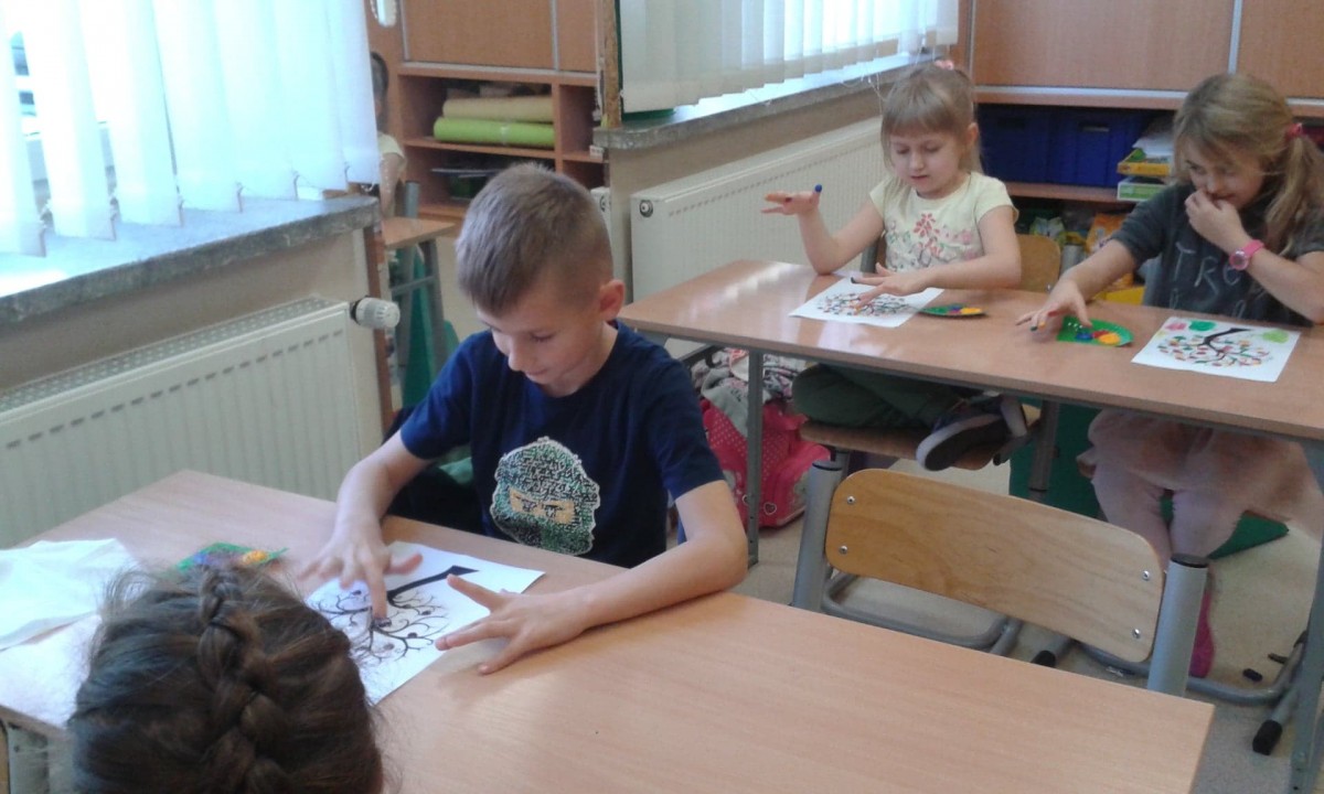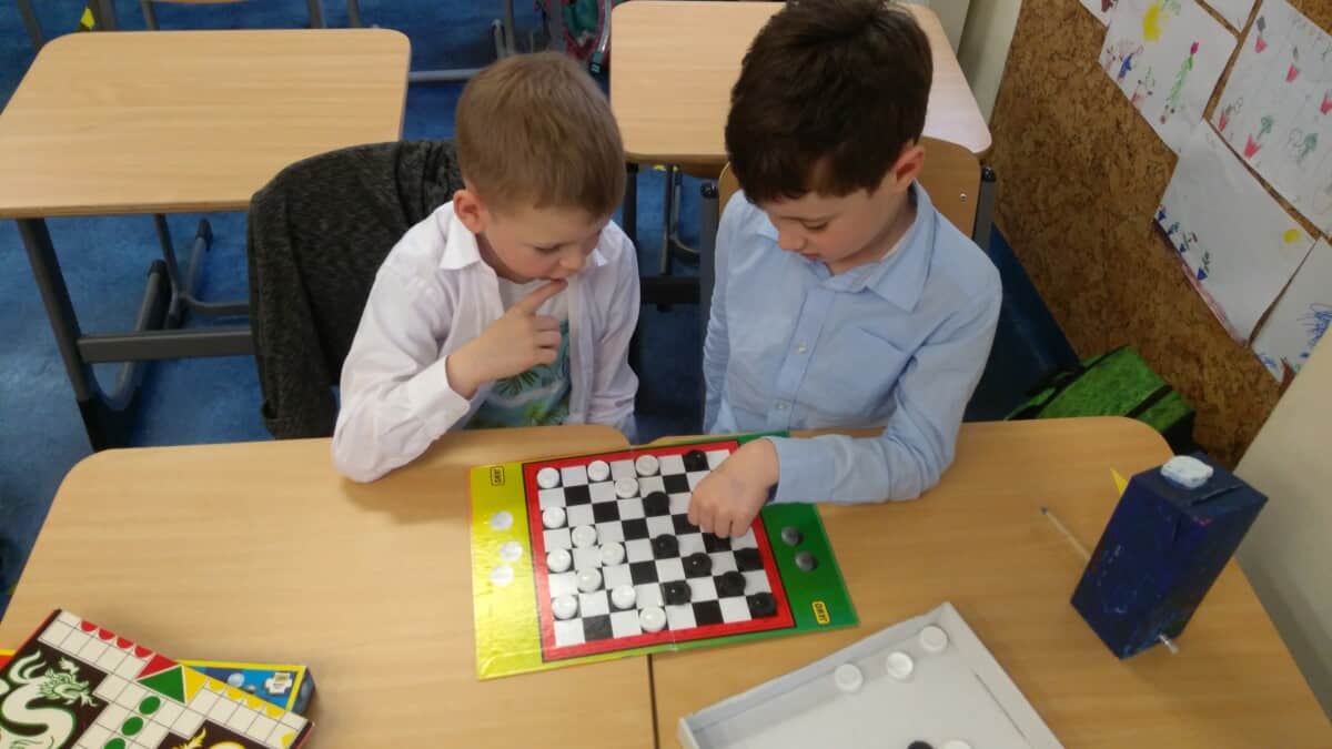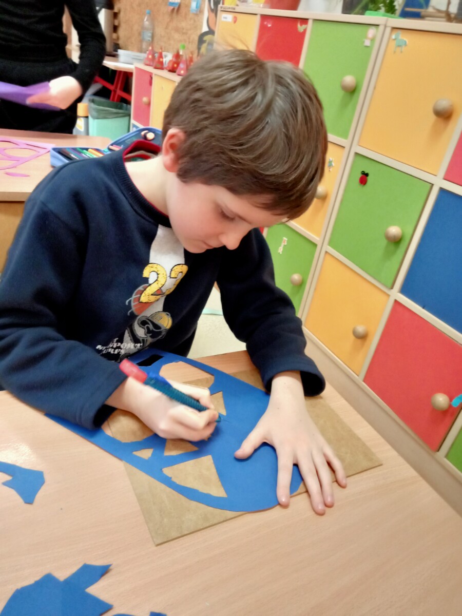 W ramach kolejnych zajęć kształtujących kreatywność uczniowie tym razem wykonywali kolorowe szachownice. To tego zadania wykorzystywali szablon kratki szachownicy, kolorowy papier, klej i nożyczki. Pod koniec lekcji wyszły tęczowe szachownice.