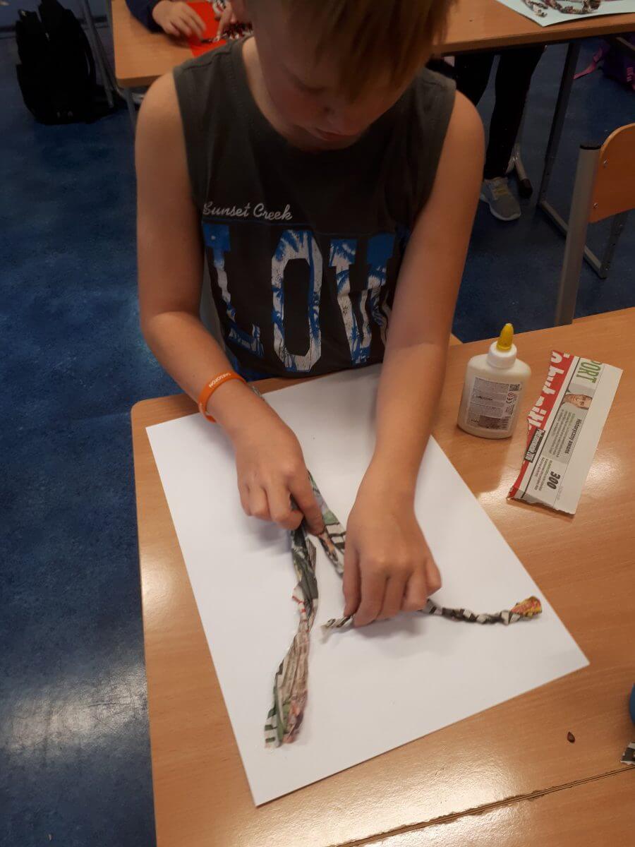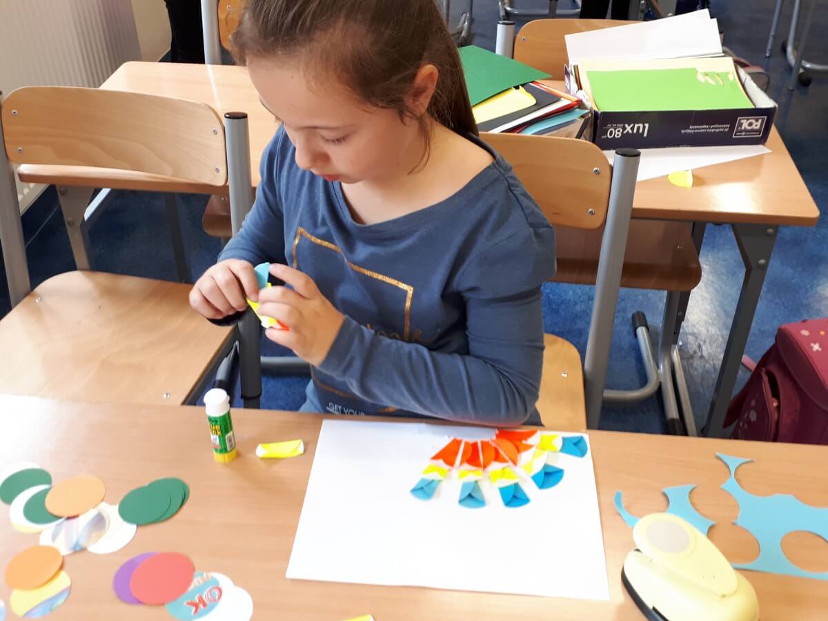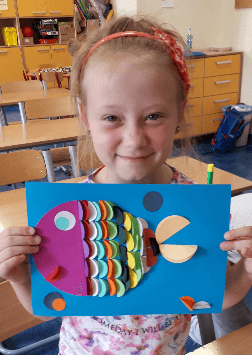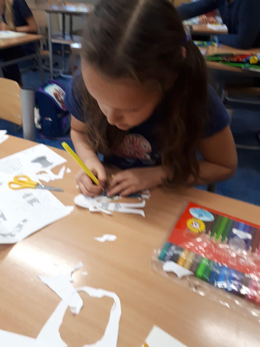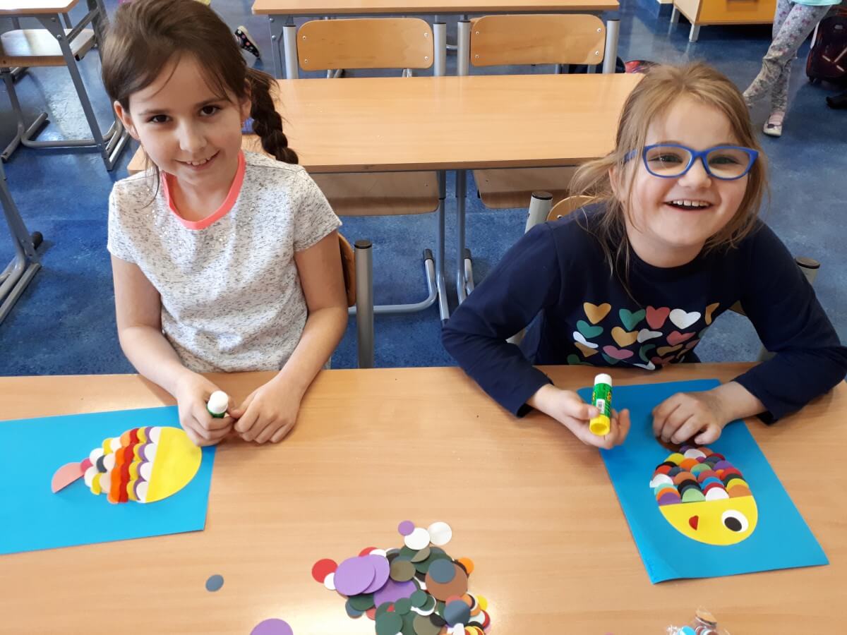 W ramach kolejnych zajęć kształtujących kreatywność uczniowie tym razem wykonywali kolorowe szachownice. To tego zadania wykorzystywali szablon kratki szachownicy, kolorowy papier, klej i nożyczki. Pod koniec lekcji wyszły tęczowe szachownice.