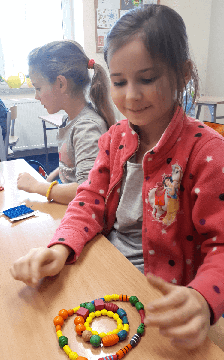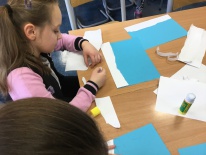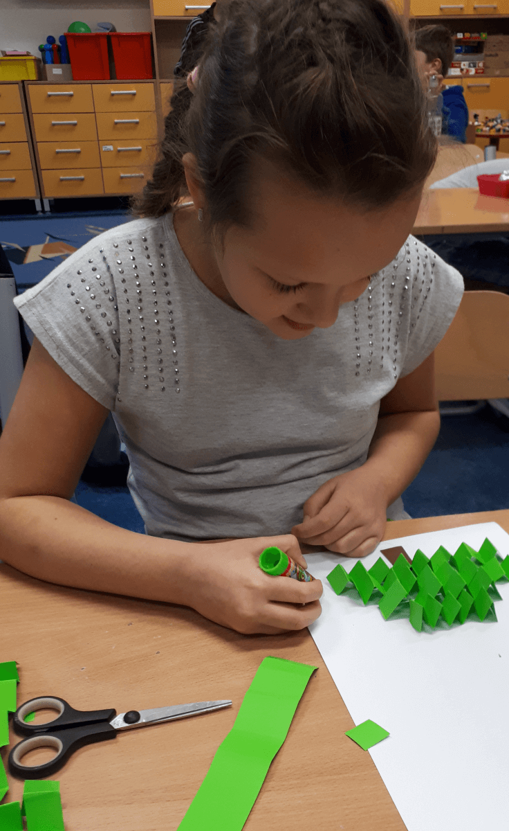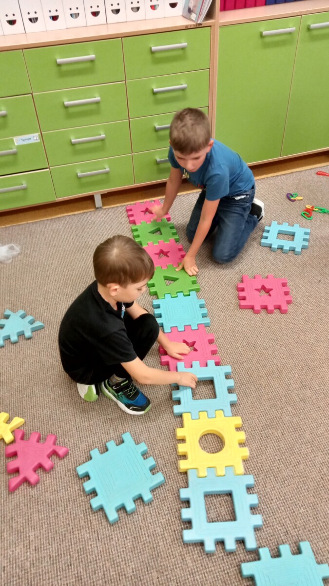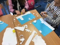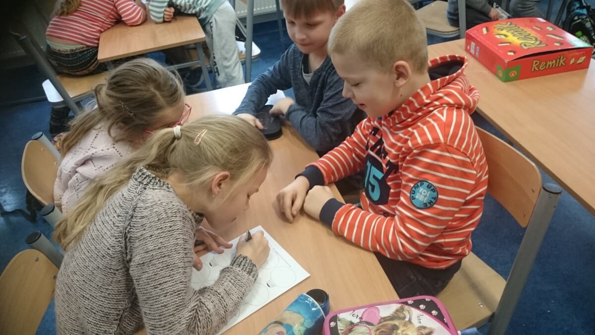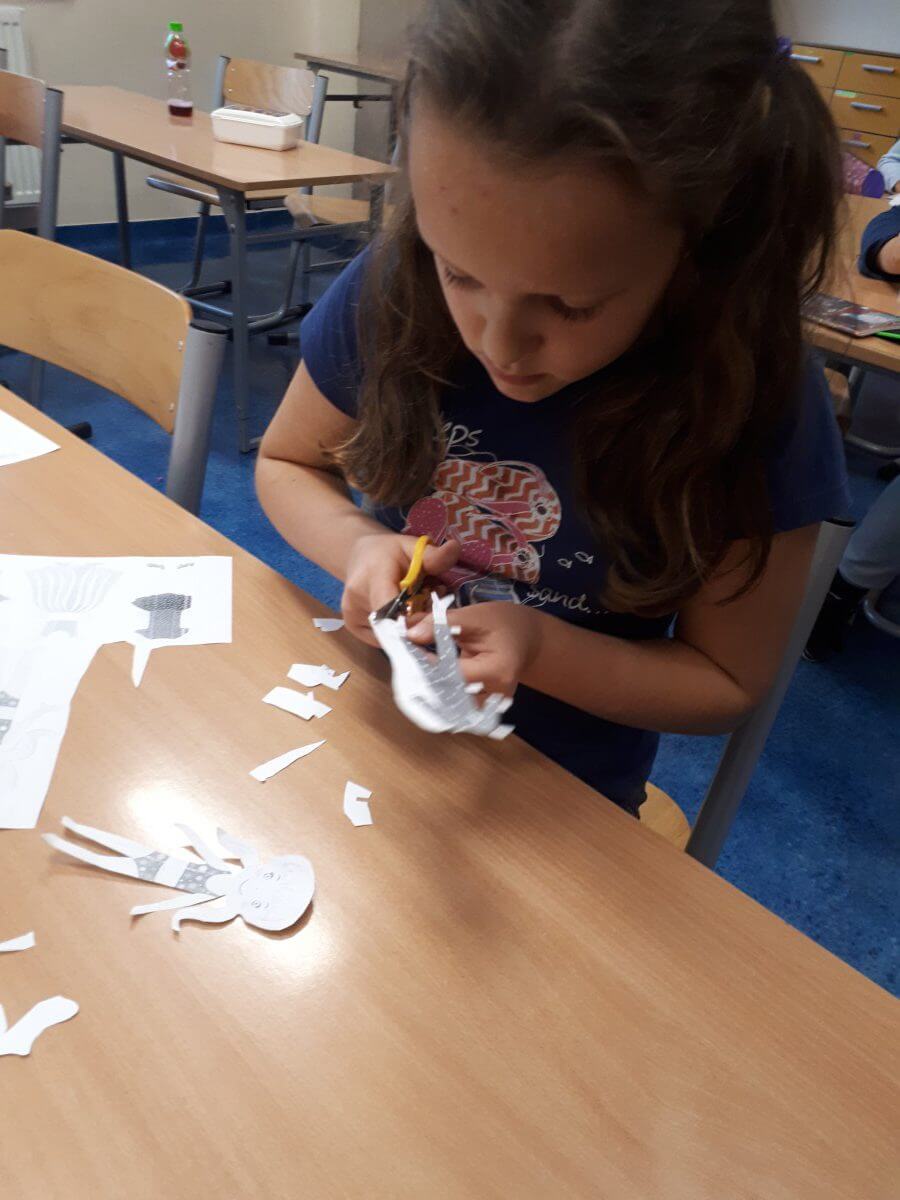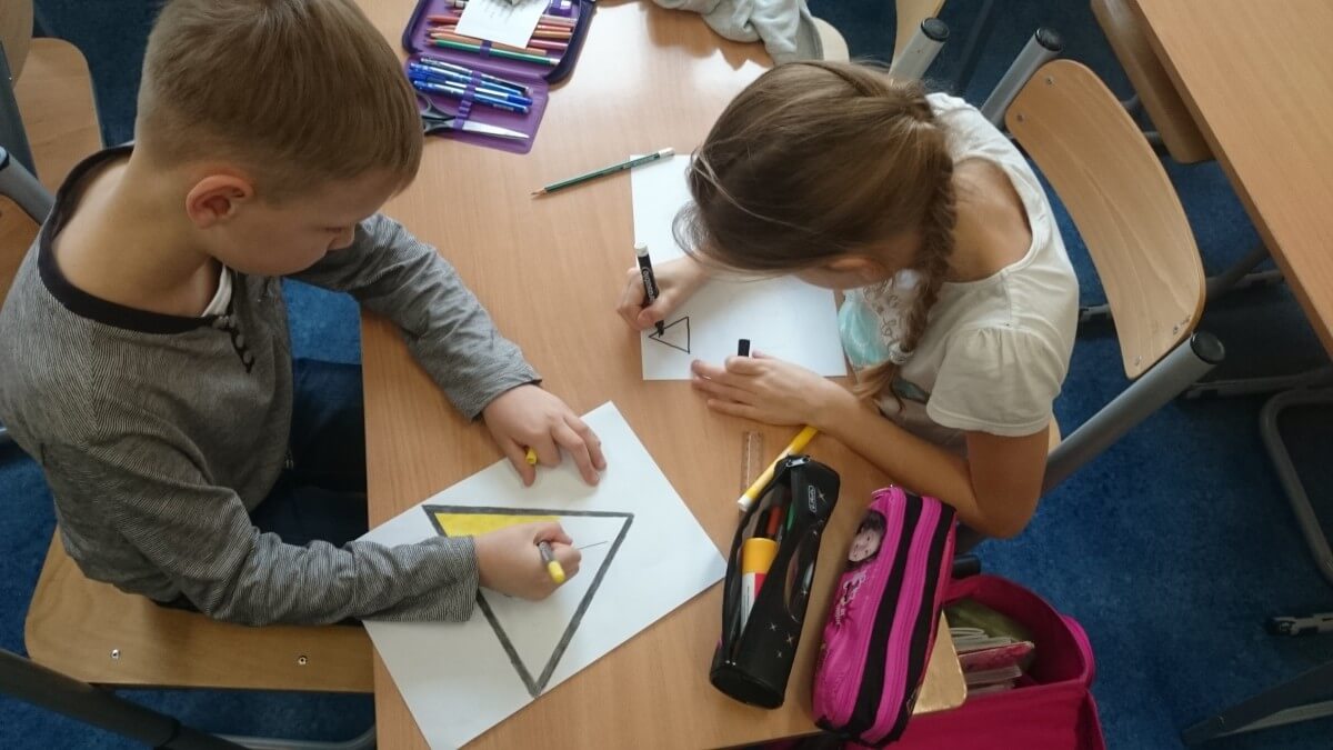 W ramach kolejnych zajęć kształtujących kreatywność uczniowie tym razem wykonywali kolorowe szachownice. To tego zadania wykorzystywali szablon kratki szachownicy, kolorowy papier, klej i nożyczki. Pod koniec lekcji wyszły tęczowe szachownice.