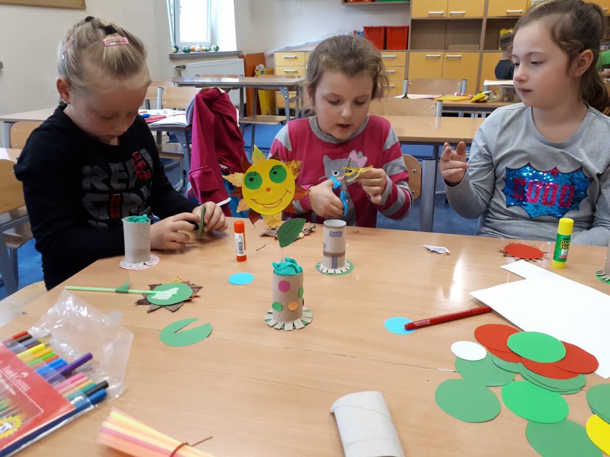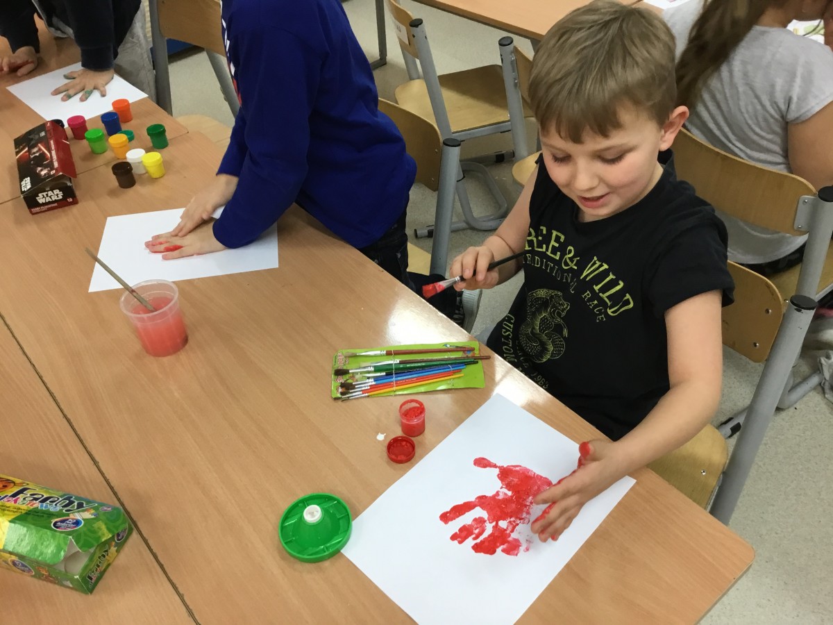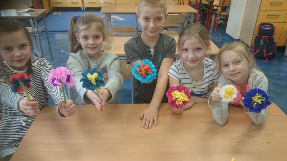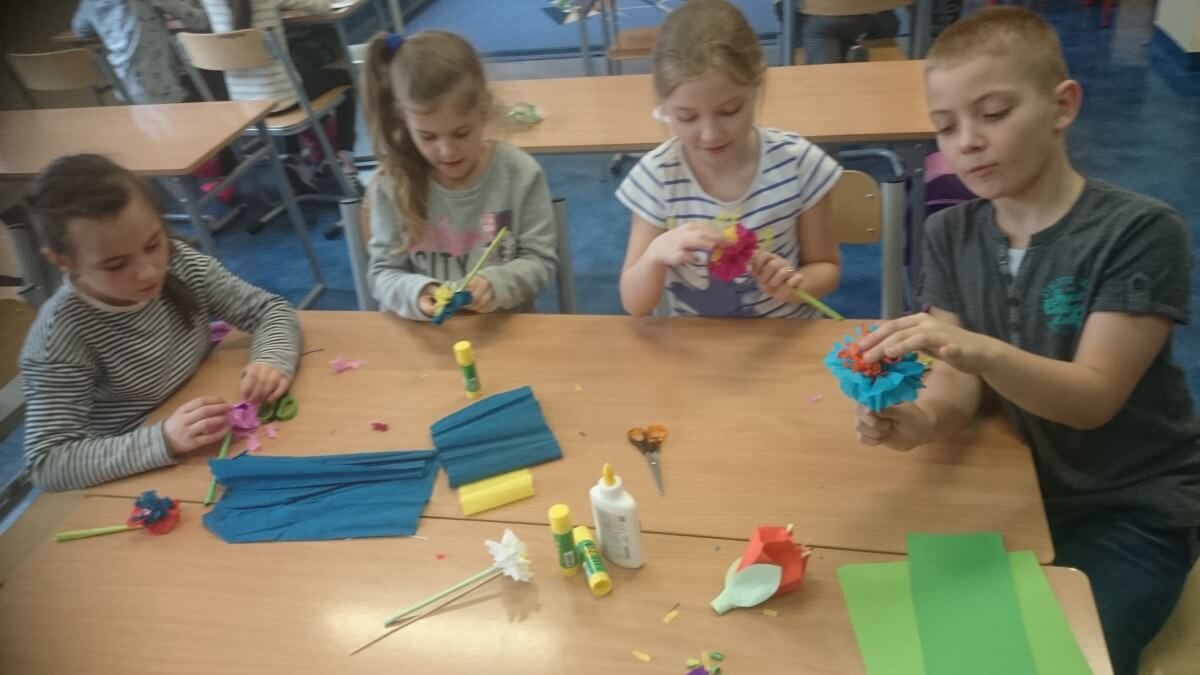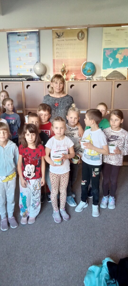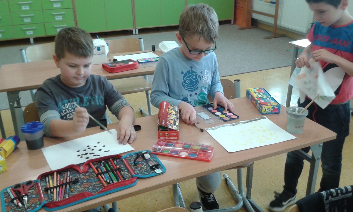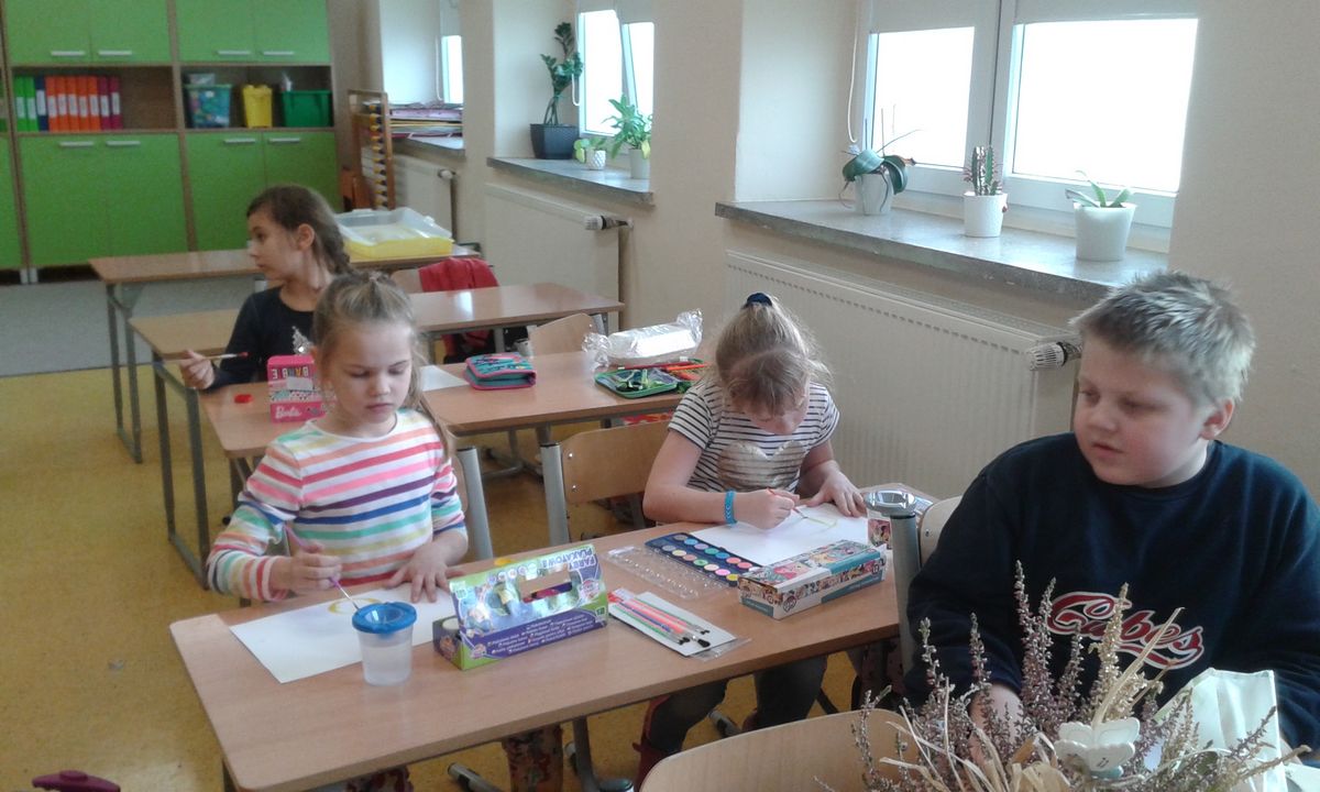 Uczniowie klas pierwszych przygotowali w ramach zajęć świetlicowych niespodzianki dla nauczycieli. Najpierw poznali opolskie wzory zdobnicze, wykorzystywane w malowaniu porcelany, a później sami pomalowali doniczki, wzorami wg własnej koncepcji. Wielką radość sprawiła dzieciom możliwość