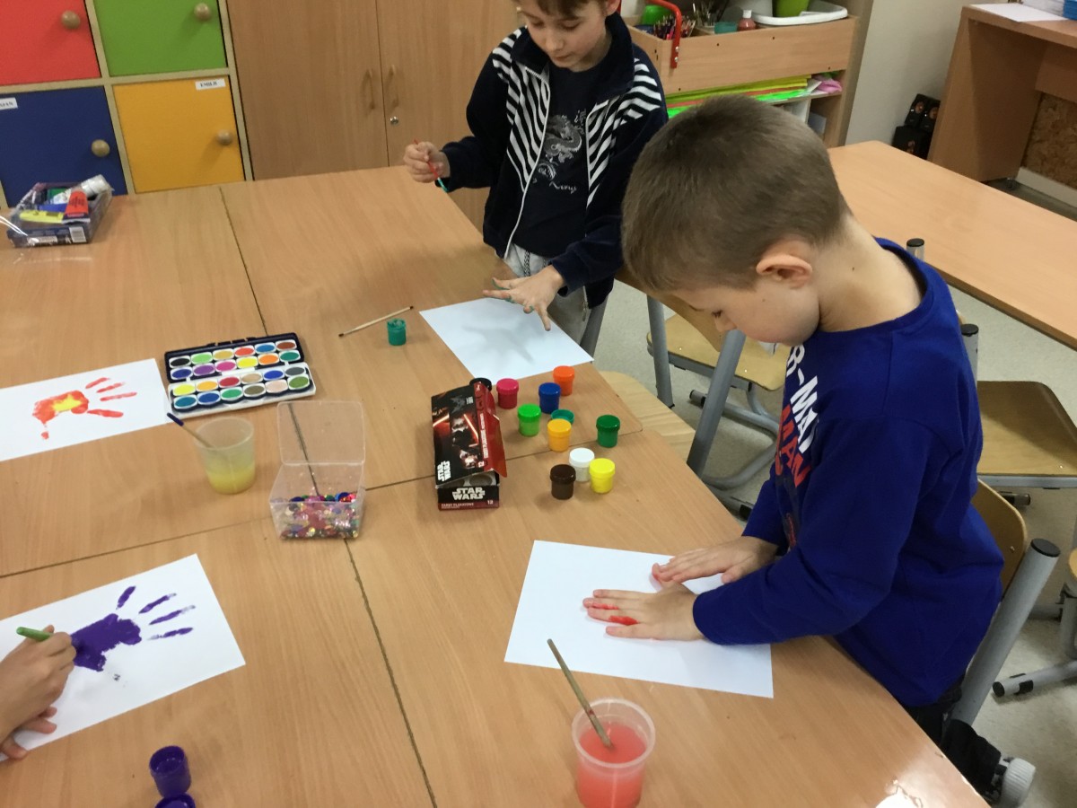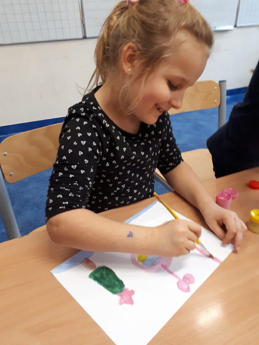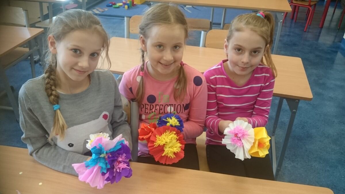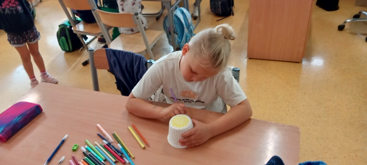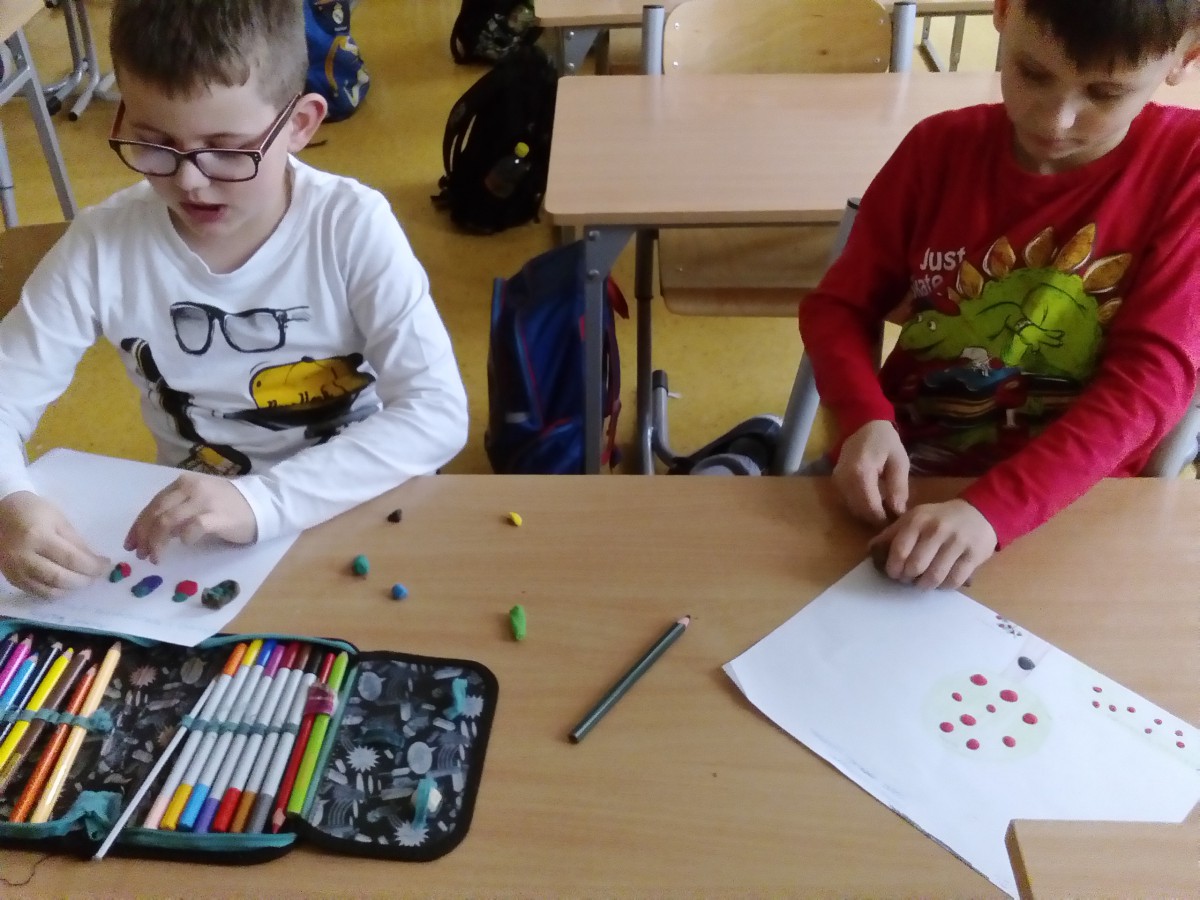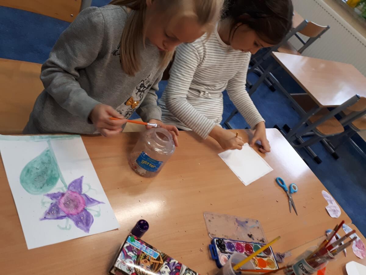 Uczniowie klas pierwszych przygotowali w ramach zajęć świetlicowych niespodzianki dla nauczycieli. Najpierw poznali opolskie wzory zdobnicze, wykorzystywane w malowaniu porcelany, a później sami pomalowali doniczki, wzorami wg własnej koncepcji. Wielką radość sprawiła dzieciom możliwość