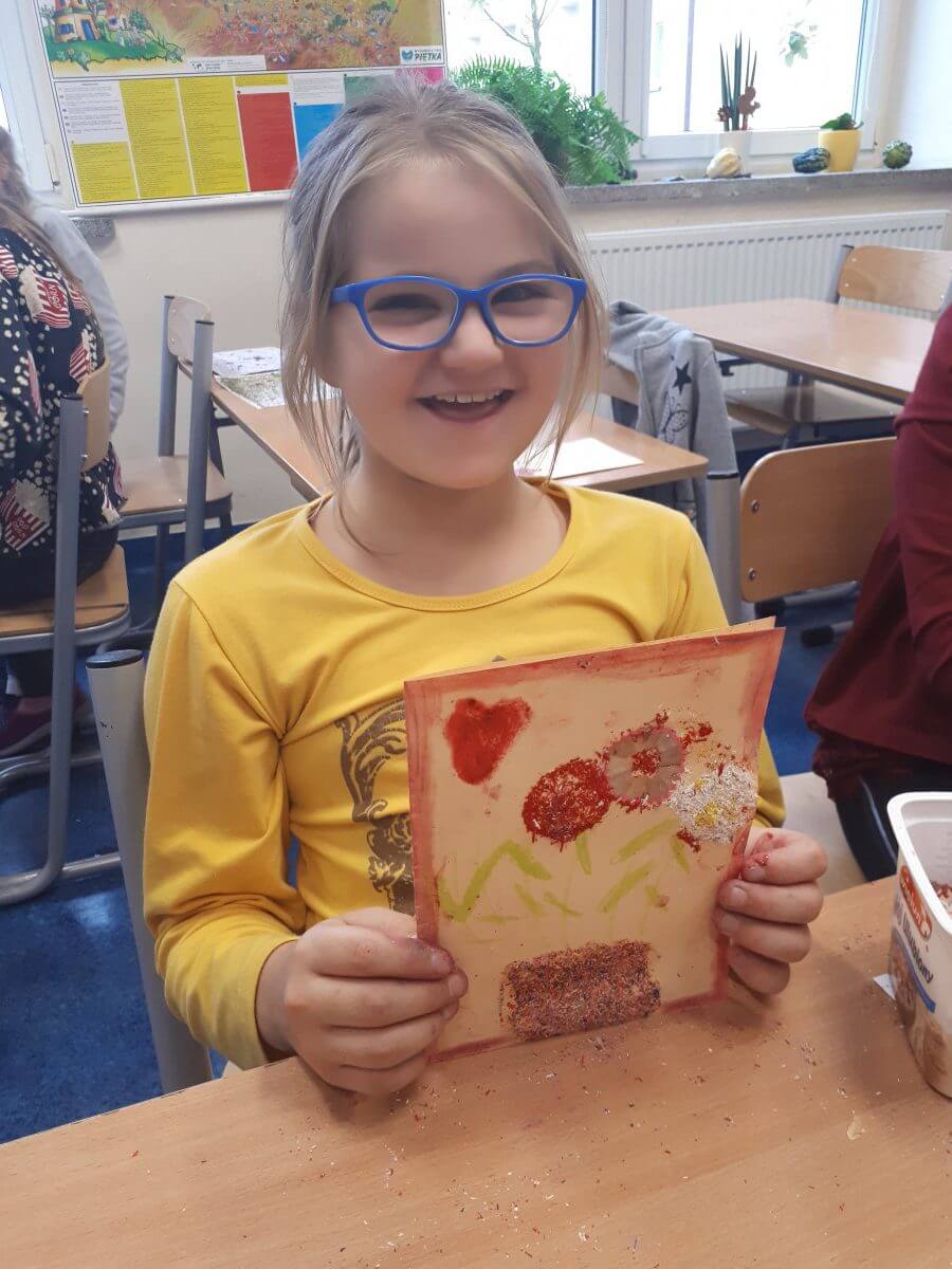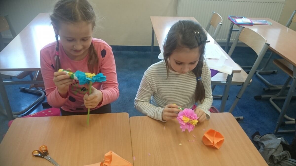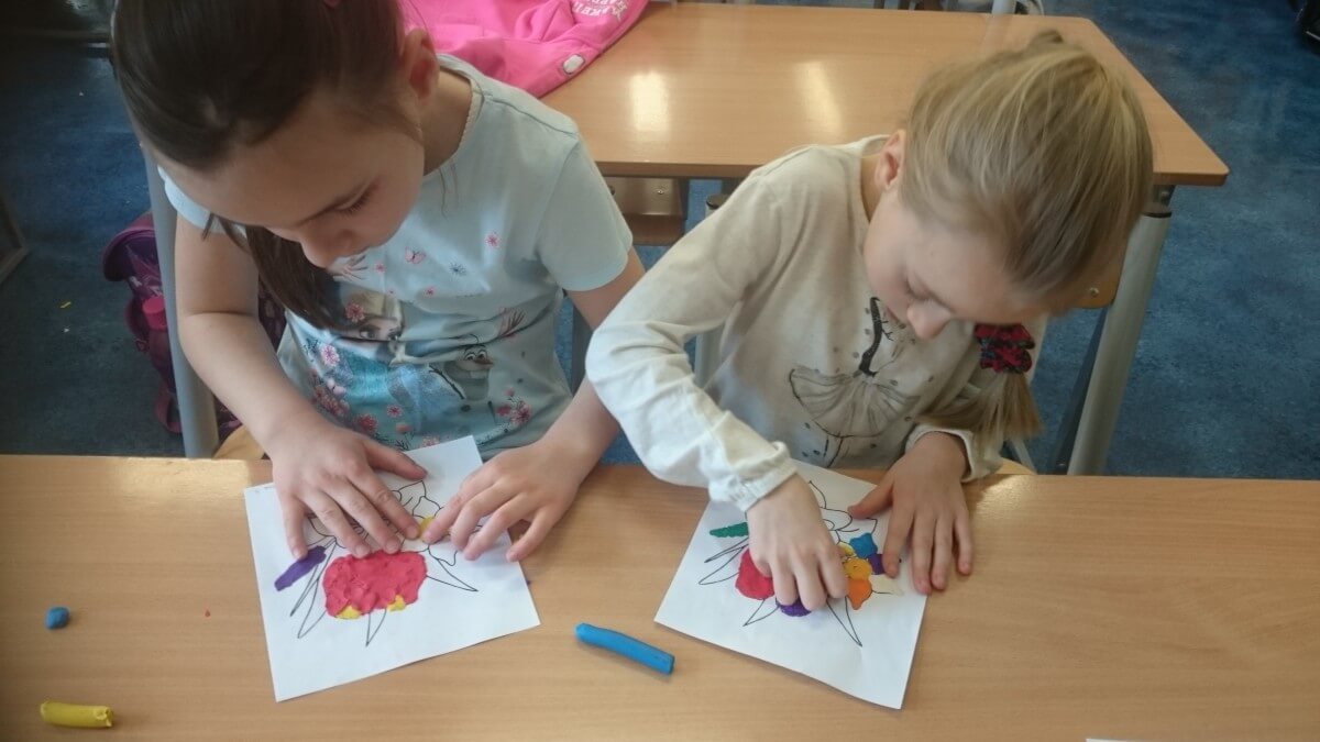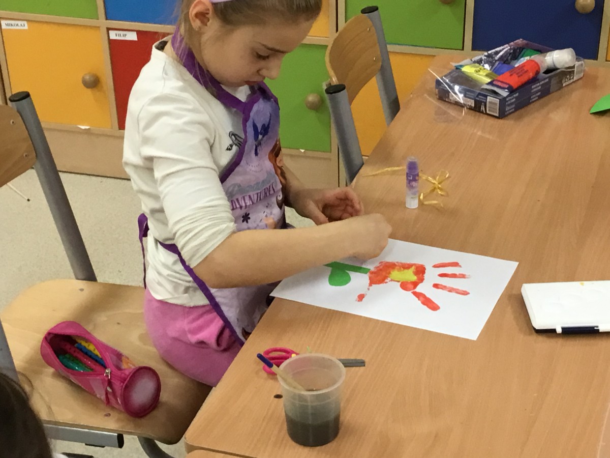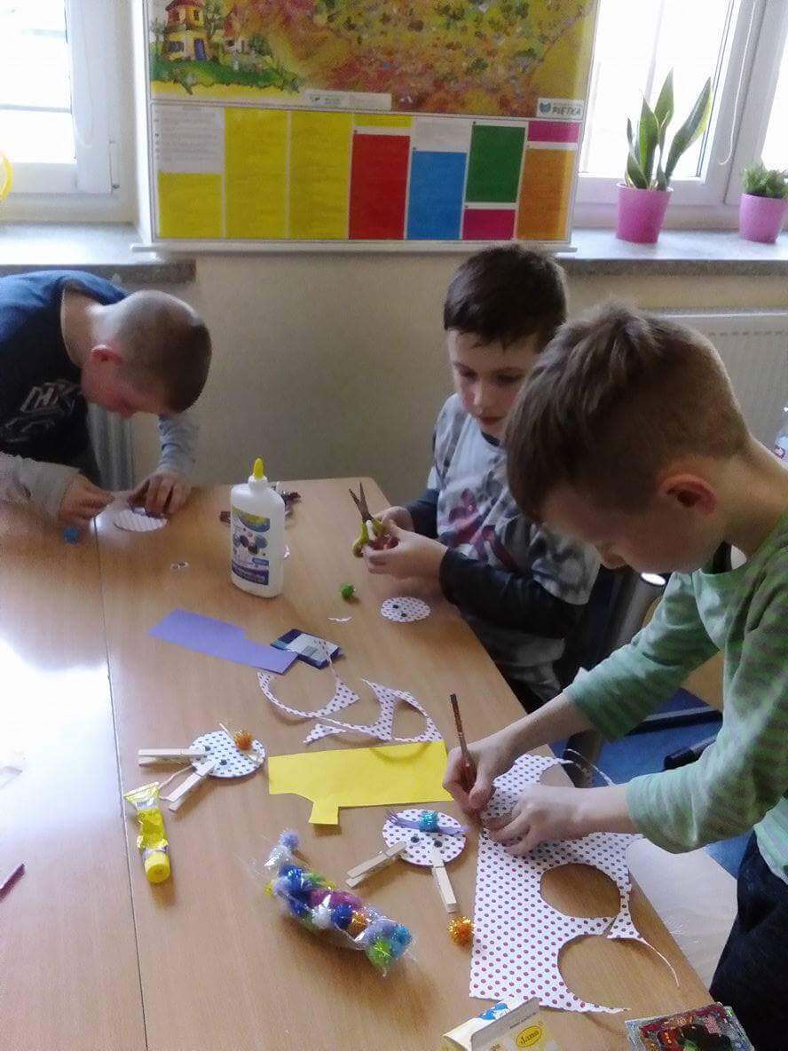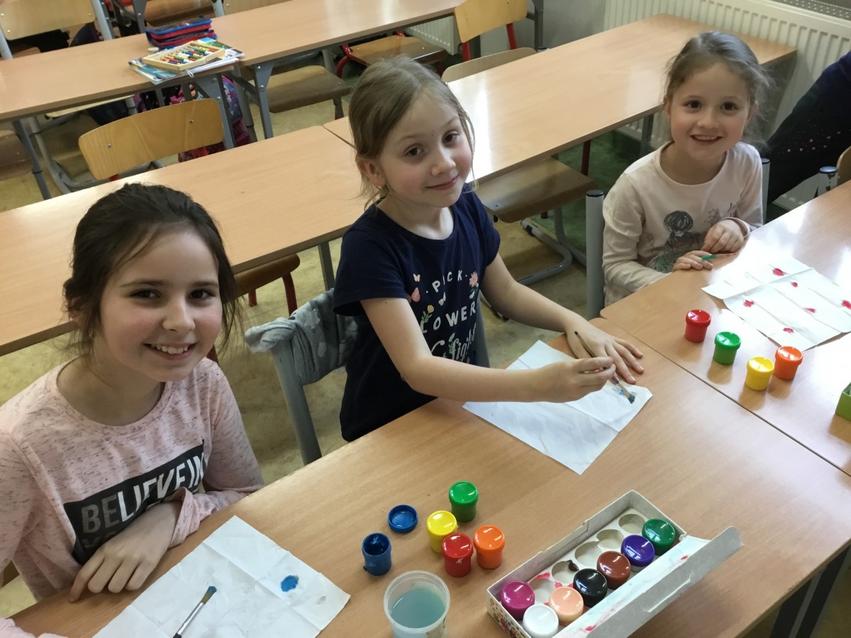 Uczniowie klas pierwszych przygotowali w ramach zajęć świetlicowych niespodzianki dla nauczycieli. Najpierw poznali opolskie wzory zdobnicze, wykorzystywane w malowaniu porcelany, a później sami pomalowali doniczki, wzorami wg własnej koncepcji. Wielką radość sprawiła dzieciom możliwość