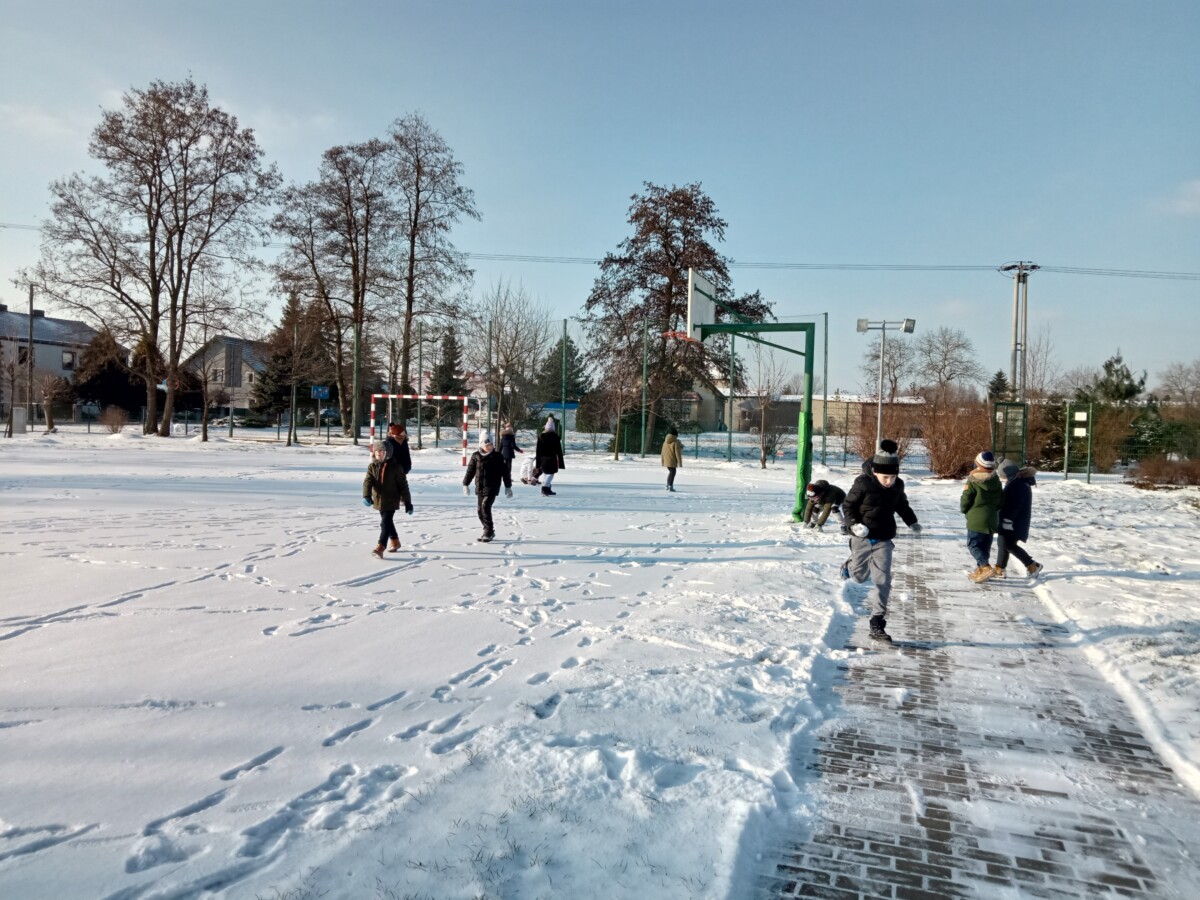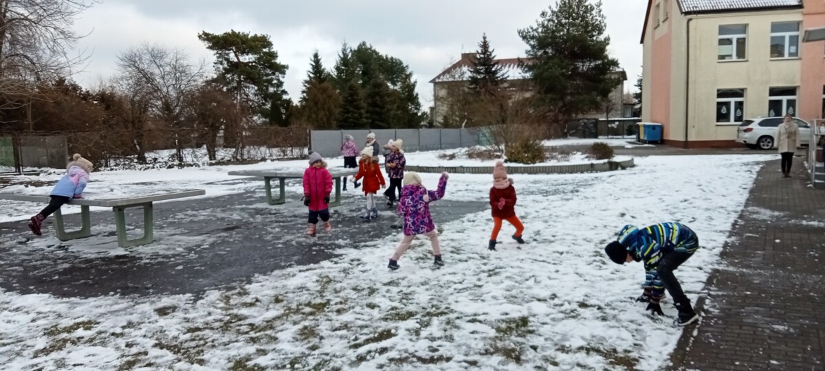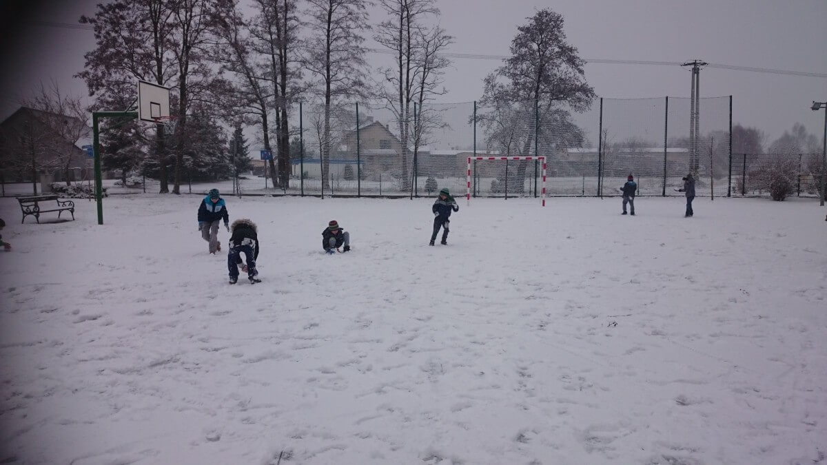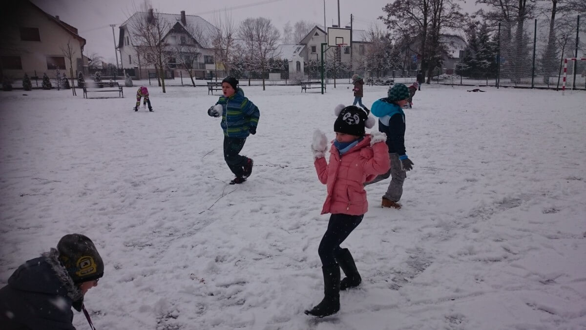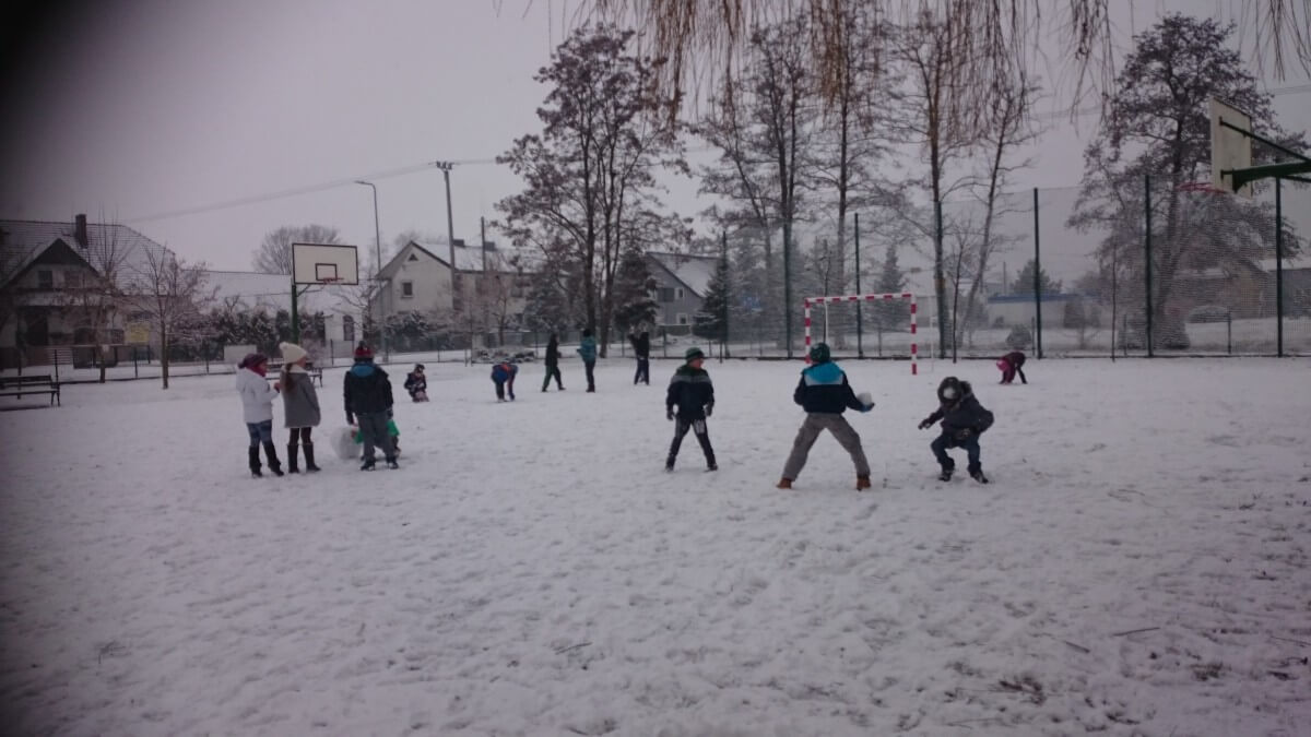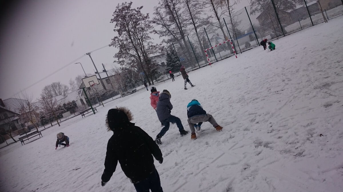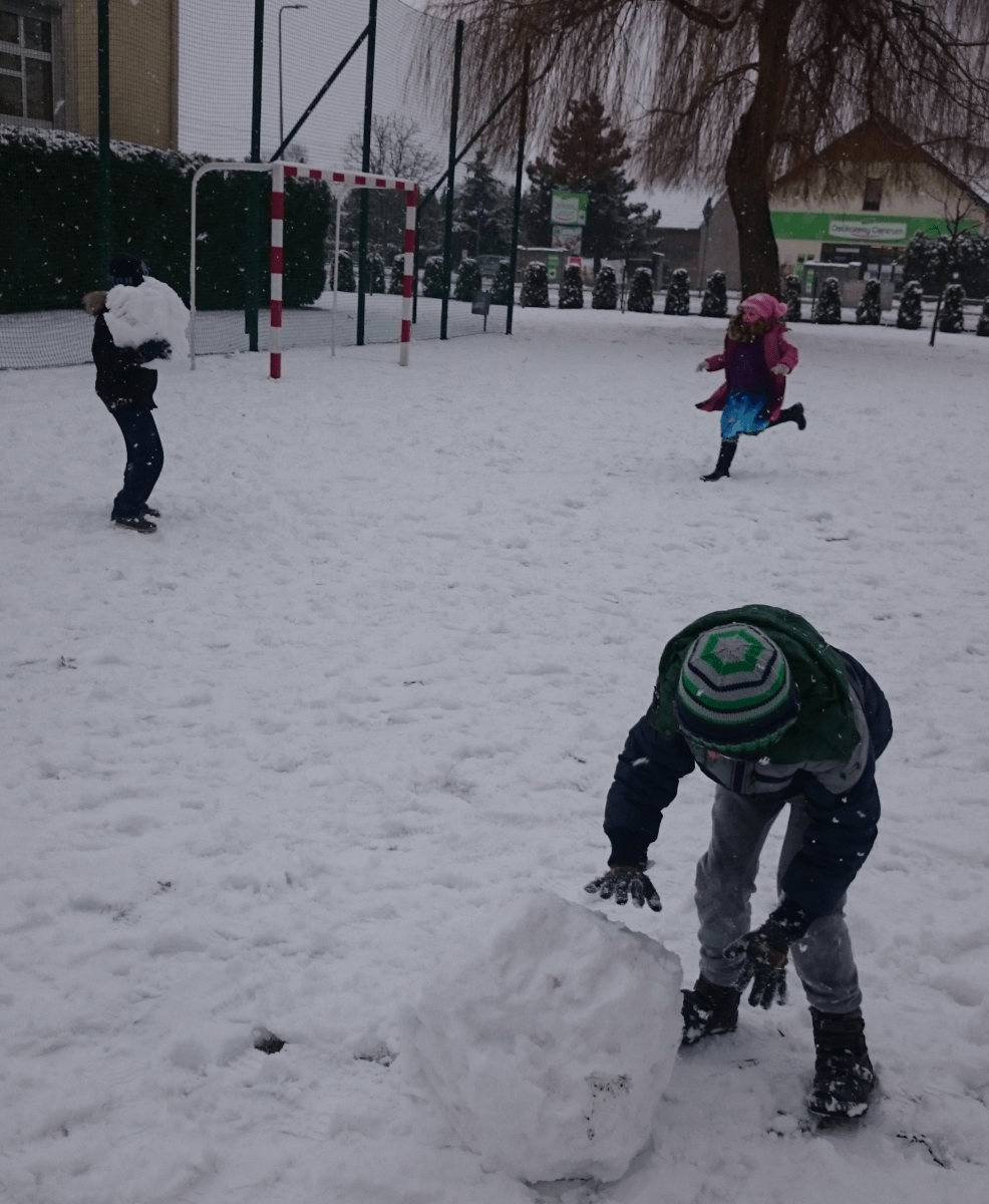 W tym roku zima nietypowa, bo pogoda zupełnie do zimy niepodobna. Tylko parę dni mieliśmy trochę radości, więc z przyjemnością wybraliśmy się na podwórko szkolne. Śniegu co prawda było mało, ale zabawa w śnieżki i tak nam się udała