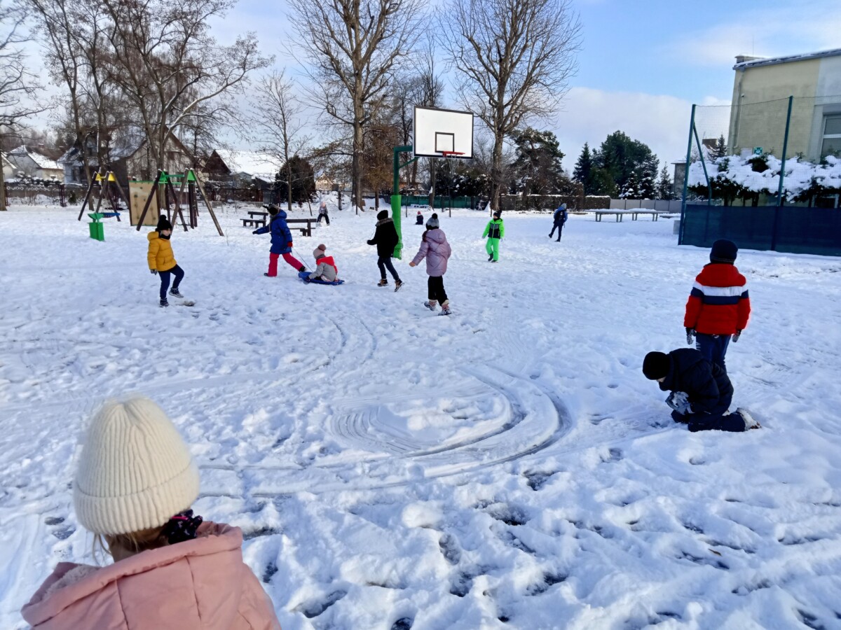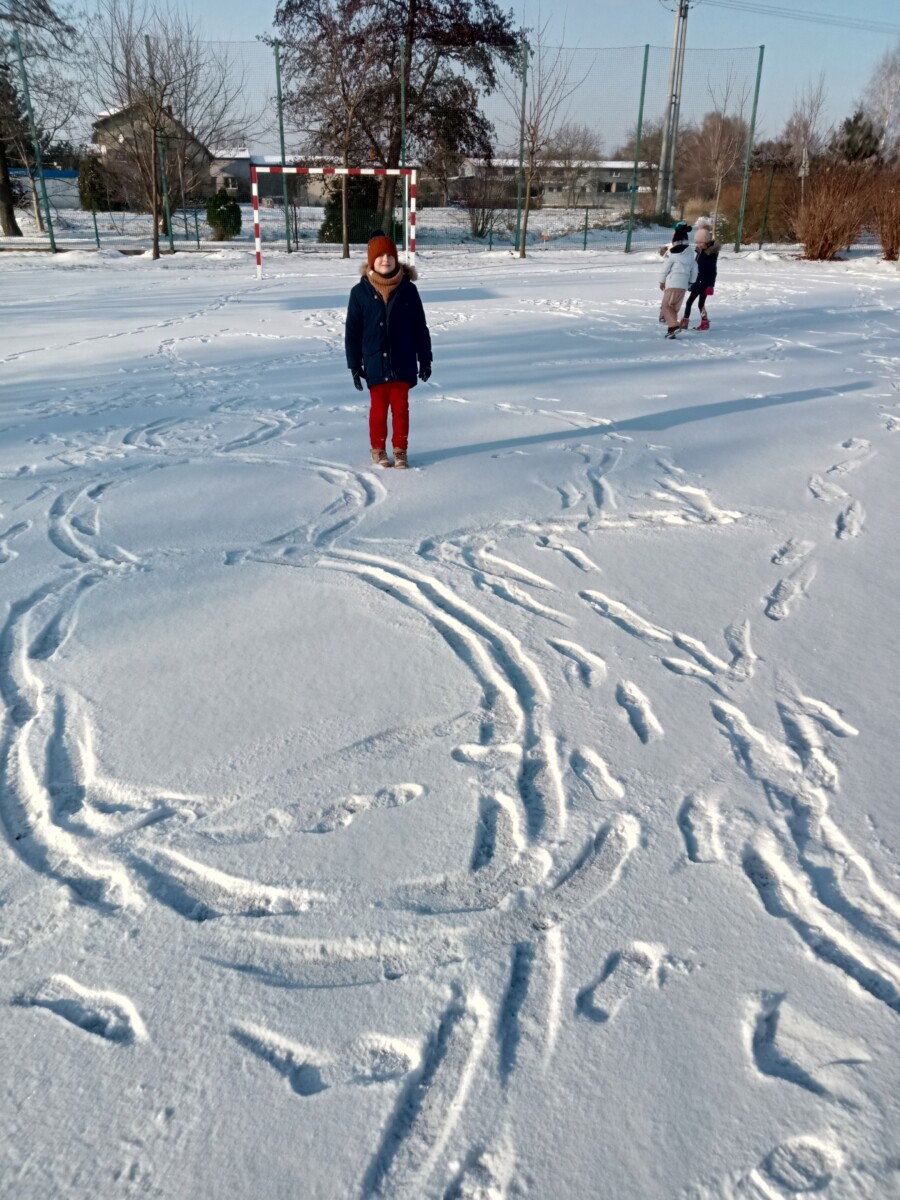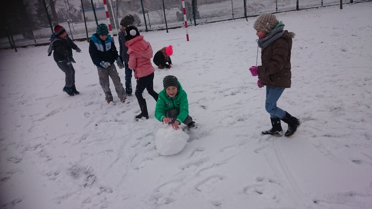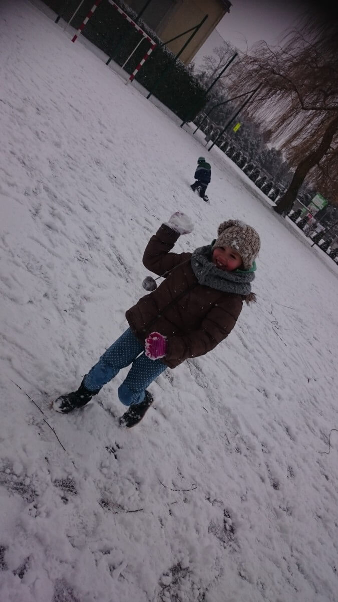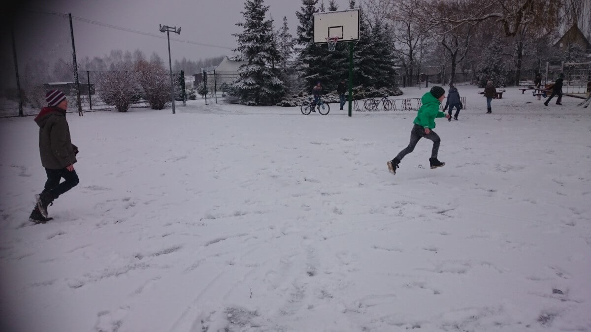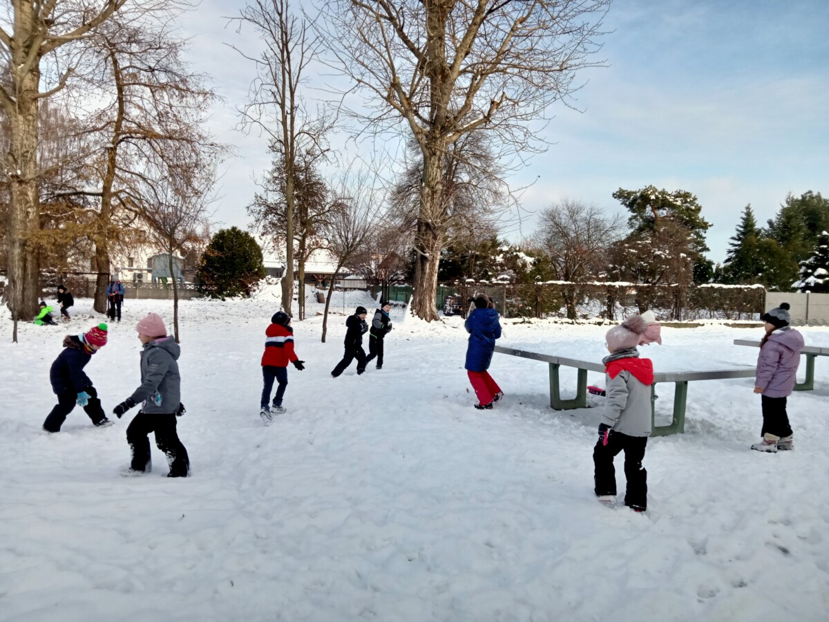 W tym roku zima nietypowa, bo pogoda zupełnie do zimy niepodobna. Tylko parę dni mieliśmy trochę radości, więc z przyjemnością wybraliśmy się na podwórko szkolne. Śniegu co prawda było mało, ale zabawa w śnieżki i tak nam się udała