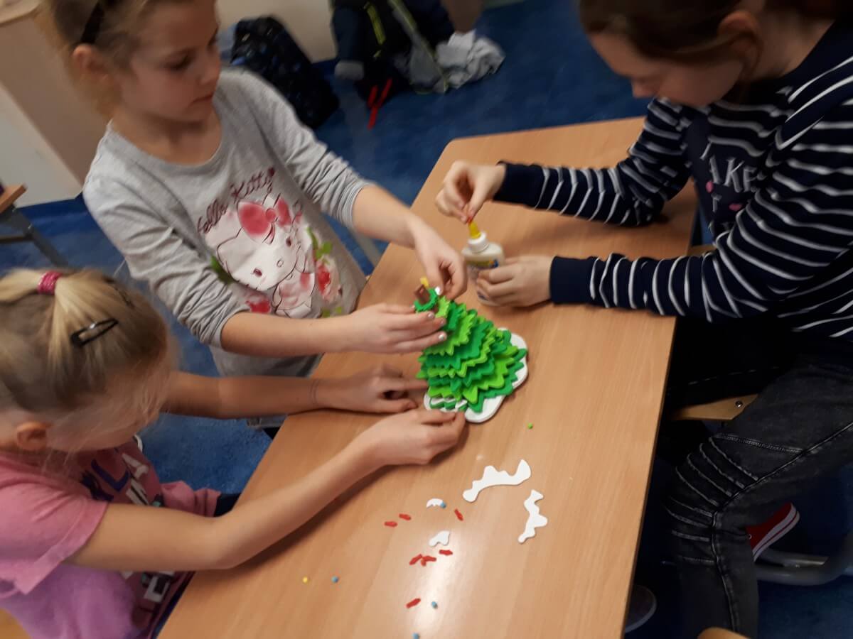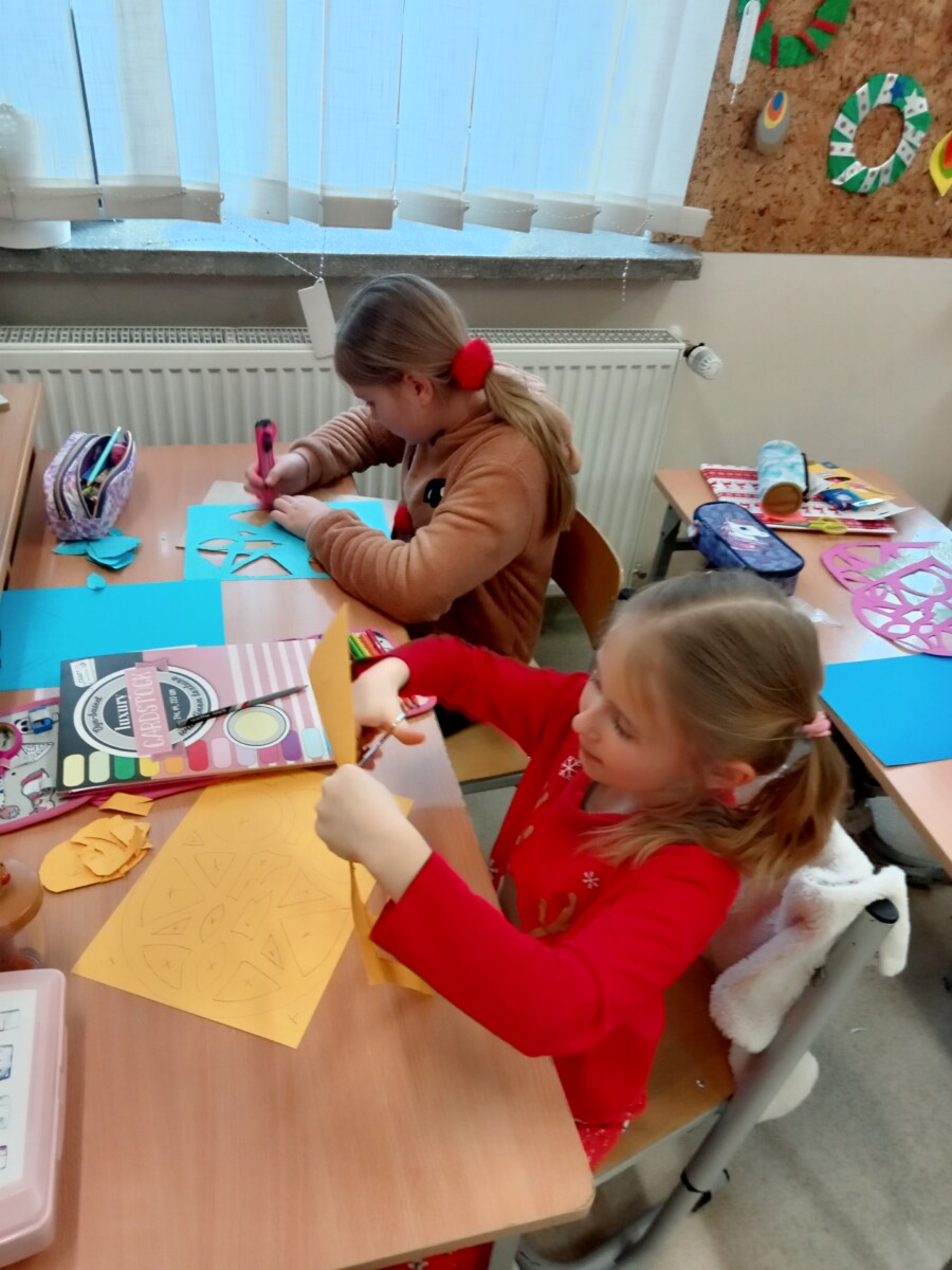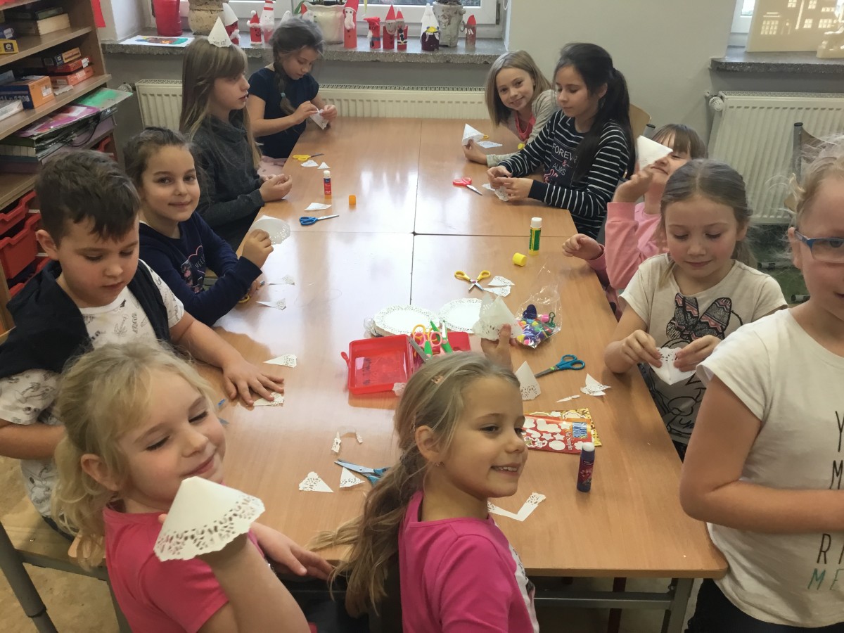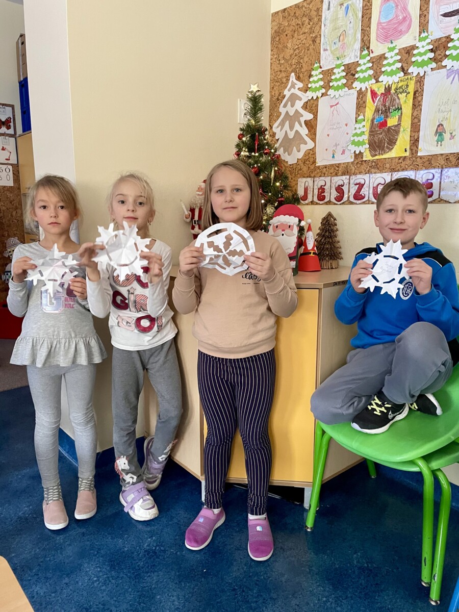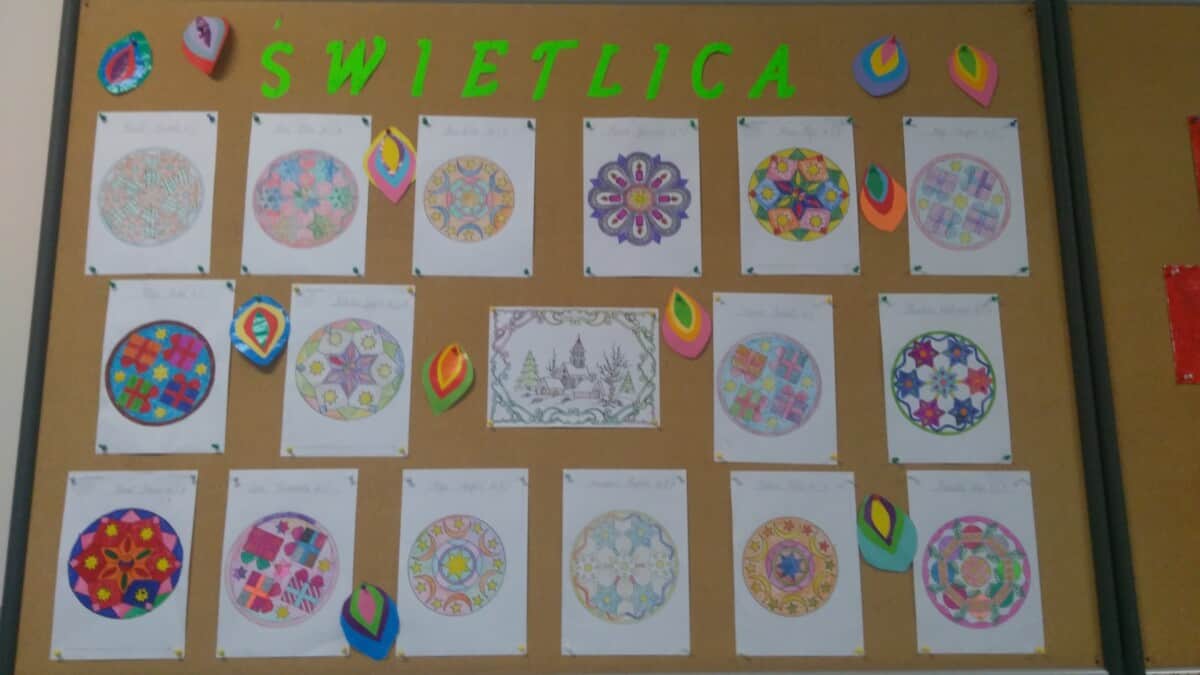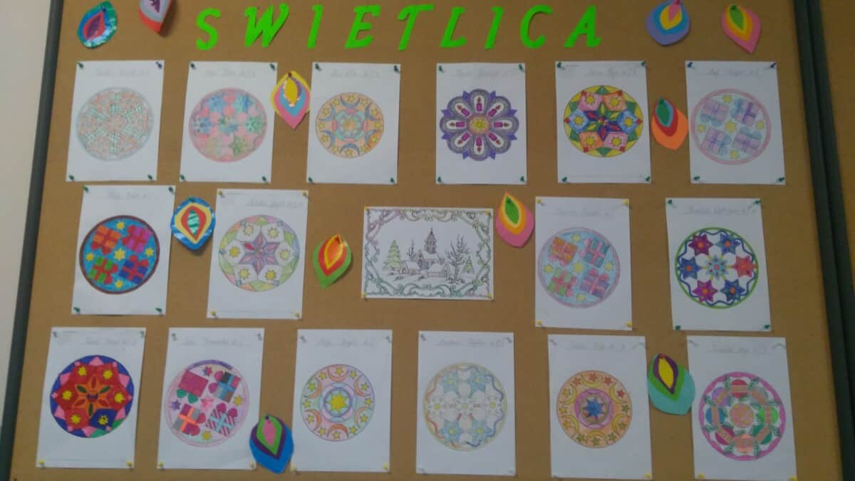 Okres przedświąteczny spędziliśmy w świetlicy bardzo pracowicie. Opowiadaliśmy sobie i tradycjach świątecznych w naszych domach. Każdego dnia w okresie adwentu kolorowaliśmy oraz wycinaliśmy mandale, z czego powstała bardzo kolorowa gazetka. Wykonaliśmy także scenkę z aniołkami, a na koniec zazieleniło się od pachnących choineczek. Pracy było tak dużo, a Święta przeminęły tak szybko.
