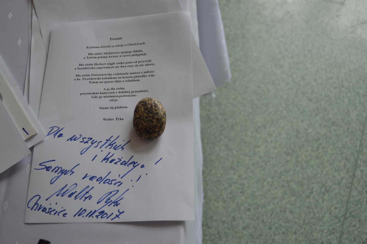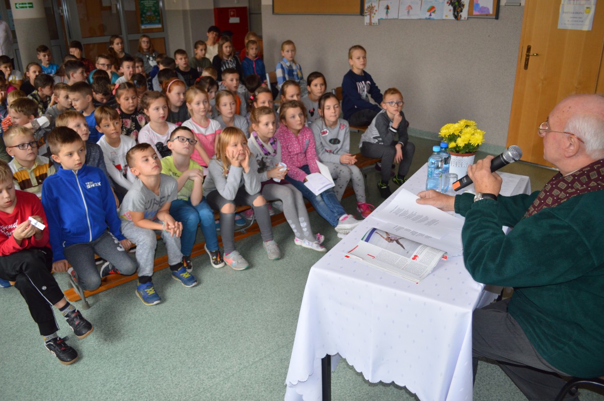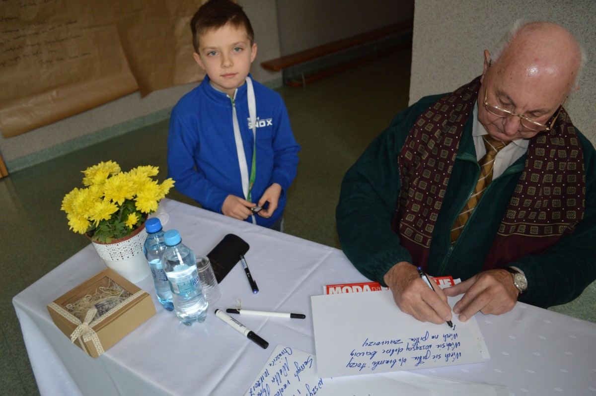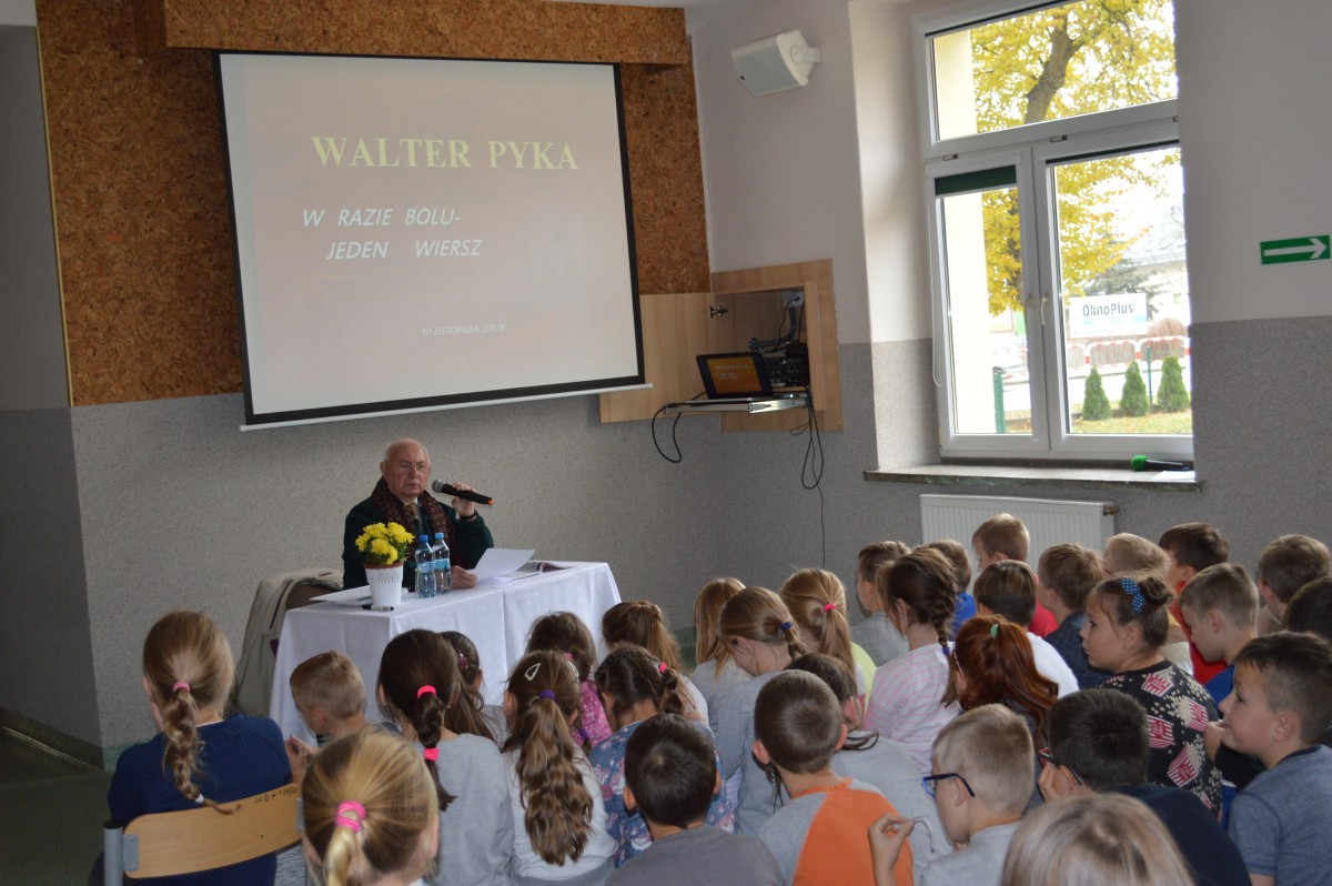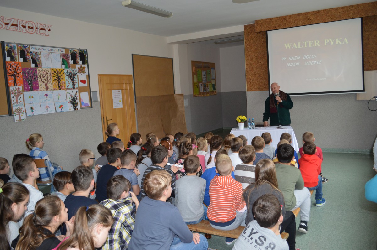 Pod takim hasłem odbyło się spotkanie z panem Walterem Pyką z uczniami naszej szkoły. Do miłych odwiedzin doszło w piątek 10 listopada. Słynący z otwartości oraz poetyckiego dorobku pan Pyka prezentował wszystkim zebranym swoje wybrane wiersze. Było też sporo pytań do miłego gościa, oraz czas na spróbowanie swoich twórczych możliwości. Pod fachowym okiem poety, chętni uczniowie tworzyli laurkę dla mamy. Miłym gestem ze strony pana Pyki był wiersz “Prezent, Każdemu dziecku ze szkoły w Chróścicach”, który powstał specjalnie z okazji wizyty w naszej szkole, oraz kilka tomików wierszy ze specjalną dedykacją, które będą dostępne w szkolnej bibliotece.