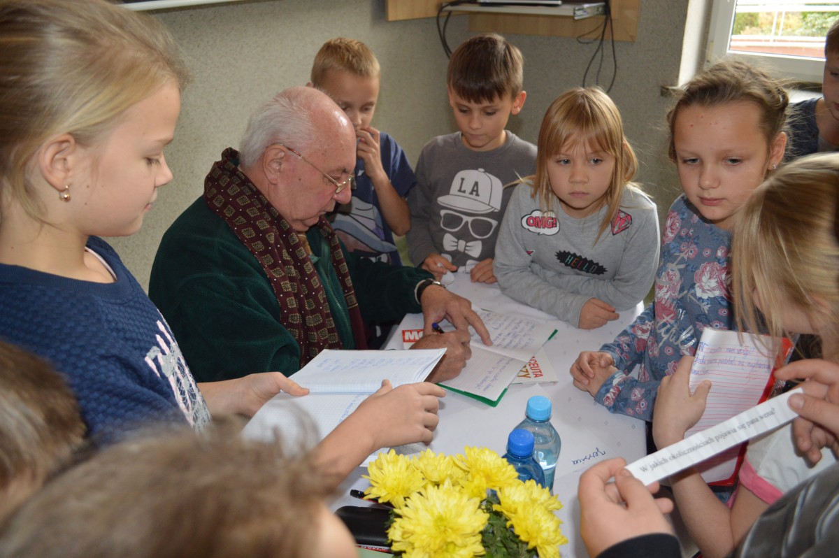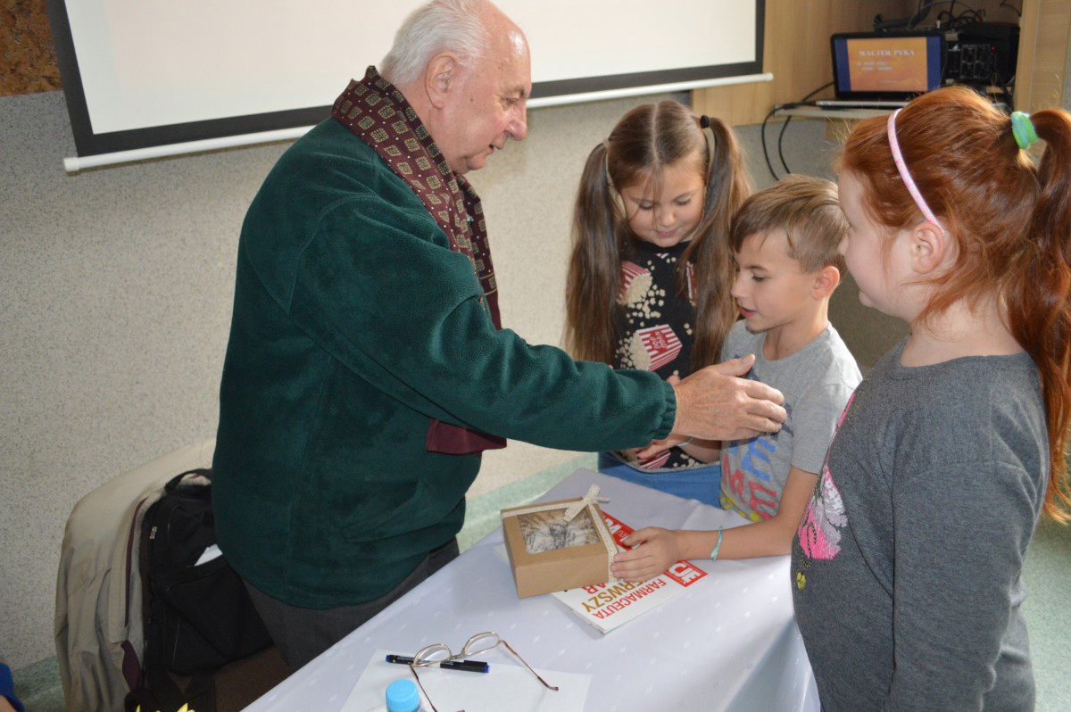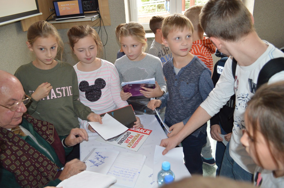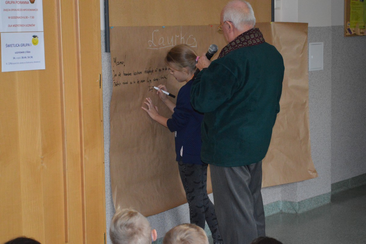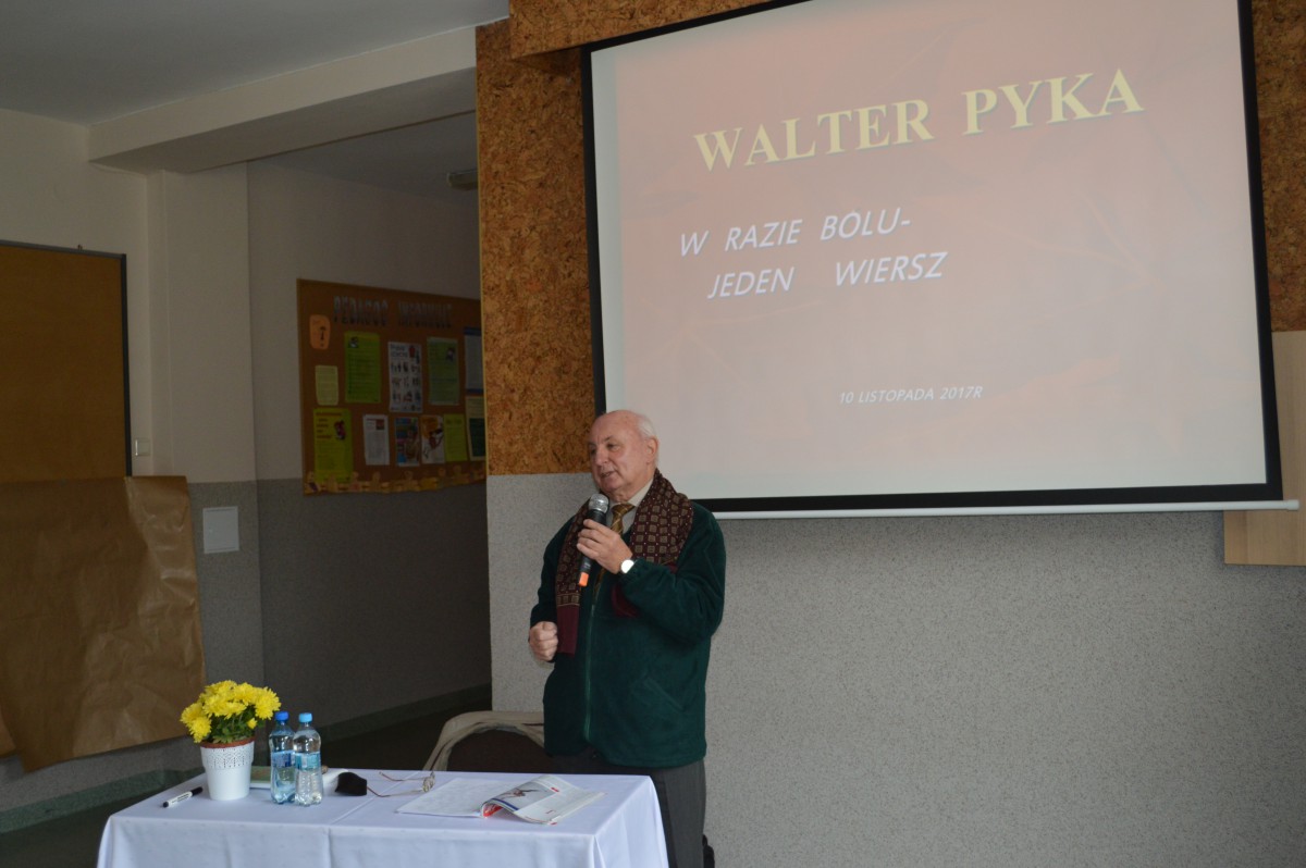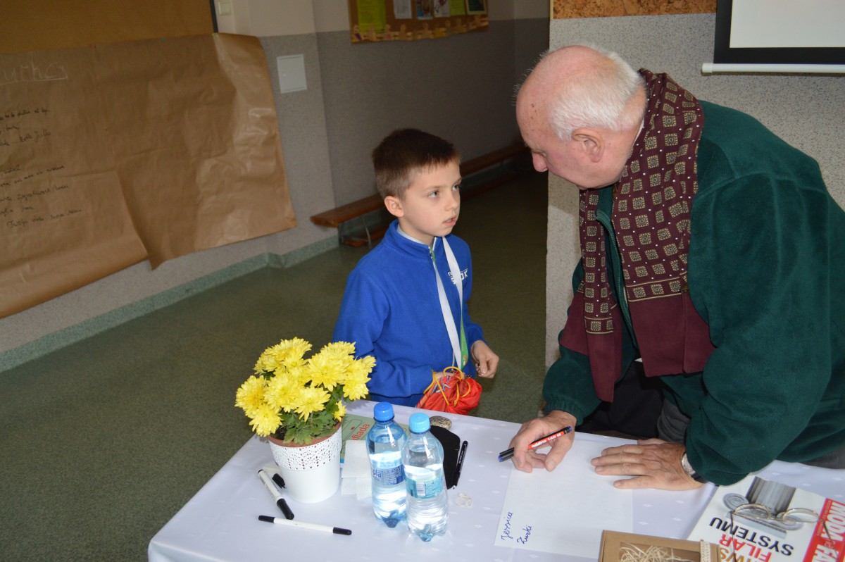 Pod takim hasłem odbyło się spotkanie z panem Walterem Pyką z uczniami naszej szkoły. Do miłych odwiedzin doszło w piątek 10 listopada. Słynący z otwartości oraz poetyckiego dorobku pan Pyka prezentował wszystkim zebranym swoje wybrane wiersze. Było też sporo pytań do miłego gościa, oraz czas na spróbowanie swoich twórczych możliwości. Pod fachowym okiem poety, chętni uczniowie tworzyli laurkę dla mamy. Miłym gestem ze strony pana Pyki był wiersz “Prezent, Każdemu dziecku ze szkoły w Chróścicach”, który powstał specjalnie z okazji wizyty w naszej szkole, oraz kilka tomików wierszy ze specjalną dedykacją, które będą dostępne w szkolnej bibliotece.