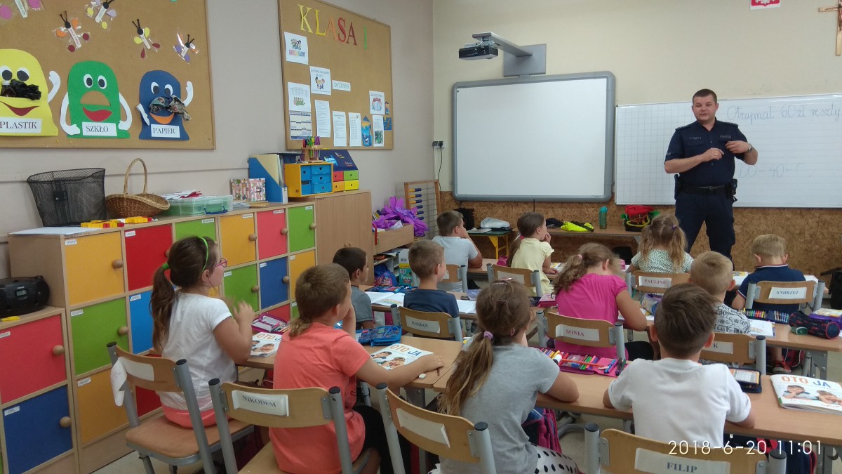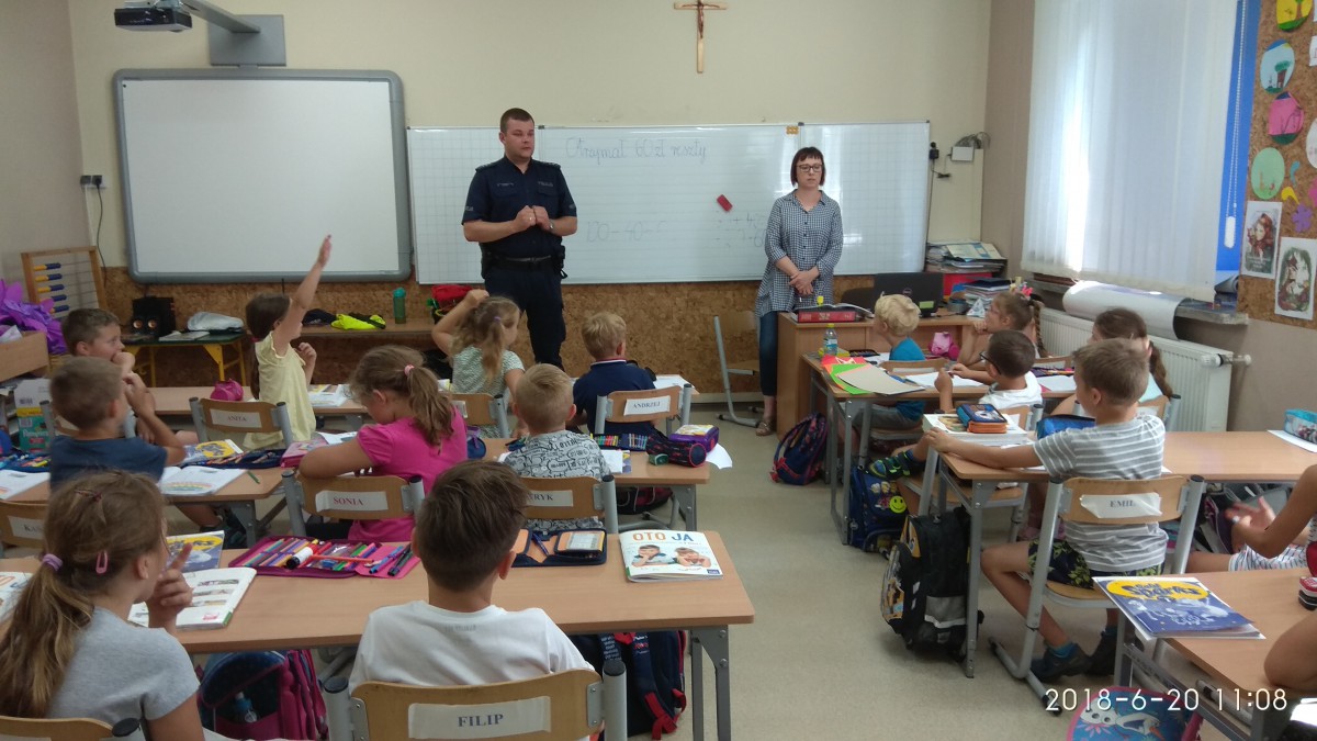 Policjant Dzielnicowych Komisariatu Policji w Dobrzeniu Wielkim asp. Krzysztof Załuski, jak co roku przed letnimi wakacjami na zaproszenie pedagoga szkolnego Małgorzaty Samson – spotkał się z uczniami naszej szkoły. Celem spotkania było przypomnienie dzieciom o zagrożeniach czyhających podczas letniego wypoczynku, pobytu w domu bez opieki rodziców, a także o odpowiedzialności osób nieletnich za popełniane czyny karalne. Podczas spotkania policjant starał się przekazać informacje o ewentualnych zagrożeniach podczas zabawy w wodzie i nad wodą, a także uświadamiał dzieci jak należy zachowywać się podczas pobytu w domu i poza nim.