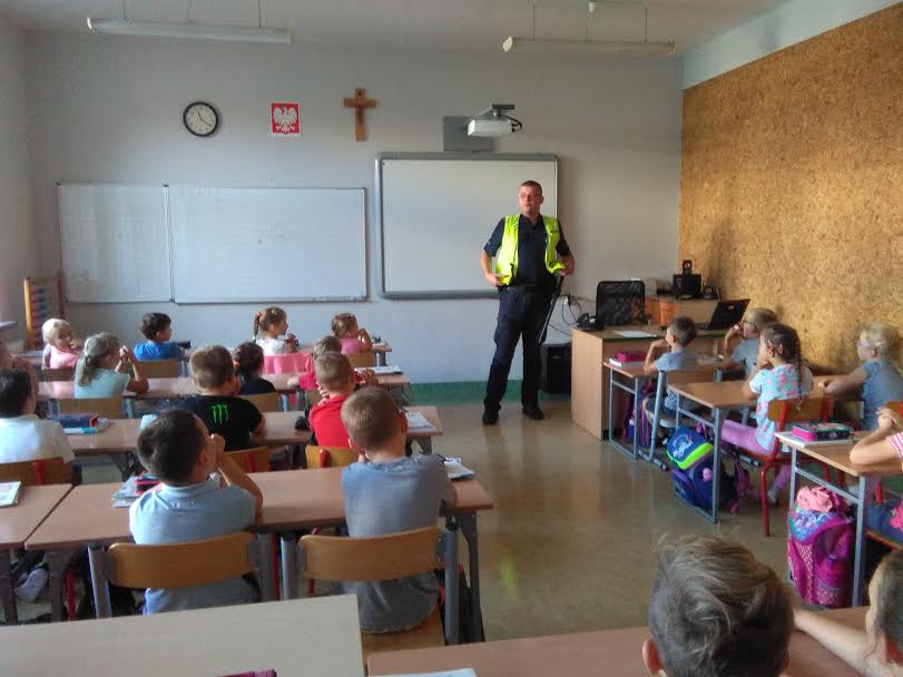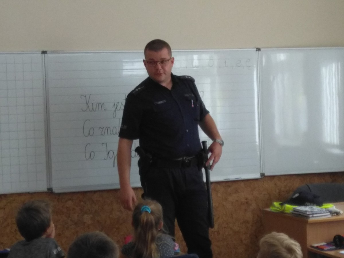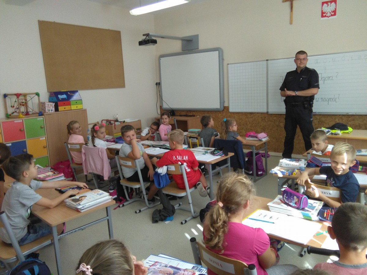 Tradycyjnie , na początku roku szkolnego, policjant dzielnicowy pan Krzysztof Załuski odwiedził naszą szkołę. Głównym celem spotkania było przypomnienie zasad bezpiecznego zachowania w drodze do szkoły, w szkole i poza nią oraz przybliżenie uczniom pracy policjanta. Duże zainteresowanie wzbudziły zademonstrowane akcesoria policyjne, m.in. kajdanki czy pałka. Uczestniczące w spotkaniu dzieci z klas młodszych bardzo szybko nawiązały kontakt z