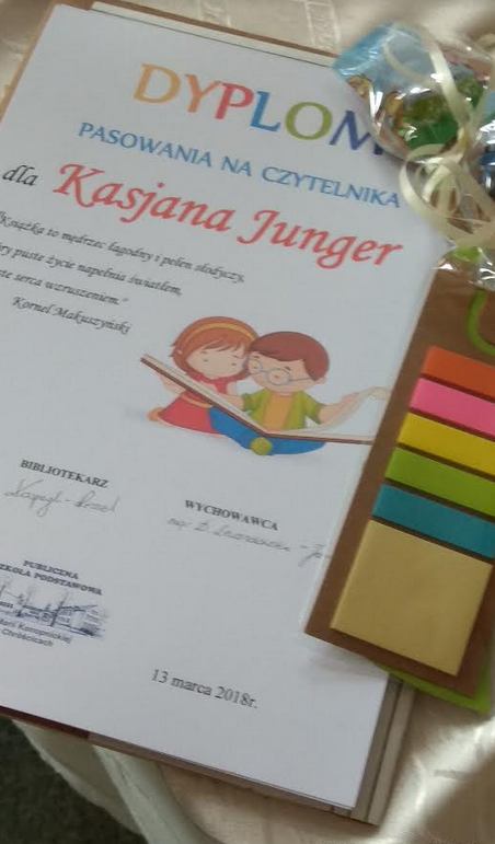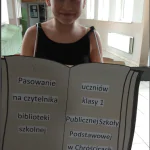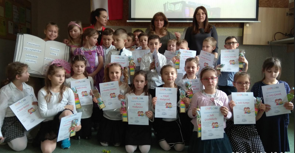 Dnia 13 marca 2018r. uczniowie klasy 1 zostali uroczyście przyjęci do grona czytelników biblioteki szkolnej. Ten moment był przez wielu z nich długo wyczekiwany, by móc w końcu samodzielnie skorzystać z zasobów biblioteki i wypożyczyć książkę do domu. Zgromadzonych na tej uroczystości przywitał gość szczególny – KSIĄŻKA, która słowami Jana Huszczy przedstawiła swoje życzenia i prośby, aby właściwe się z nią obchodzić, dbać i szanować.