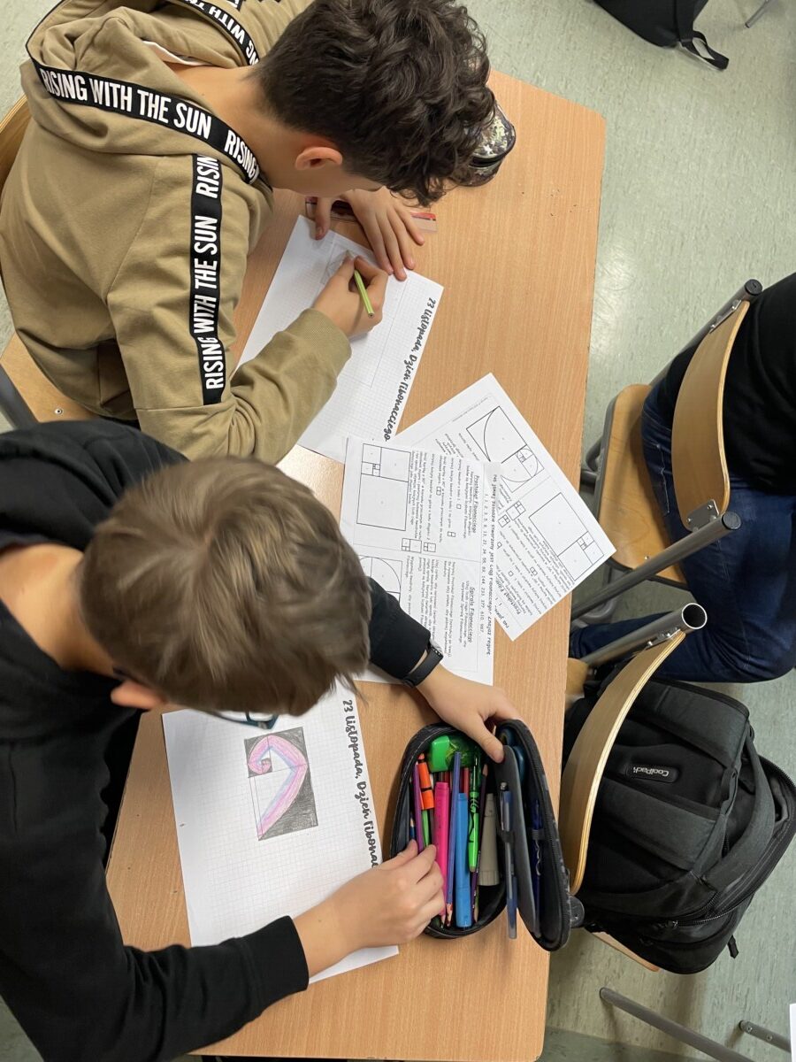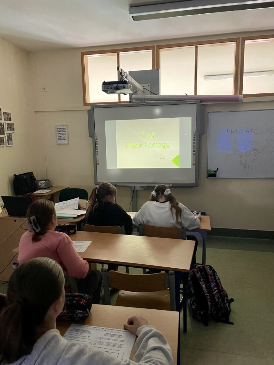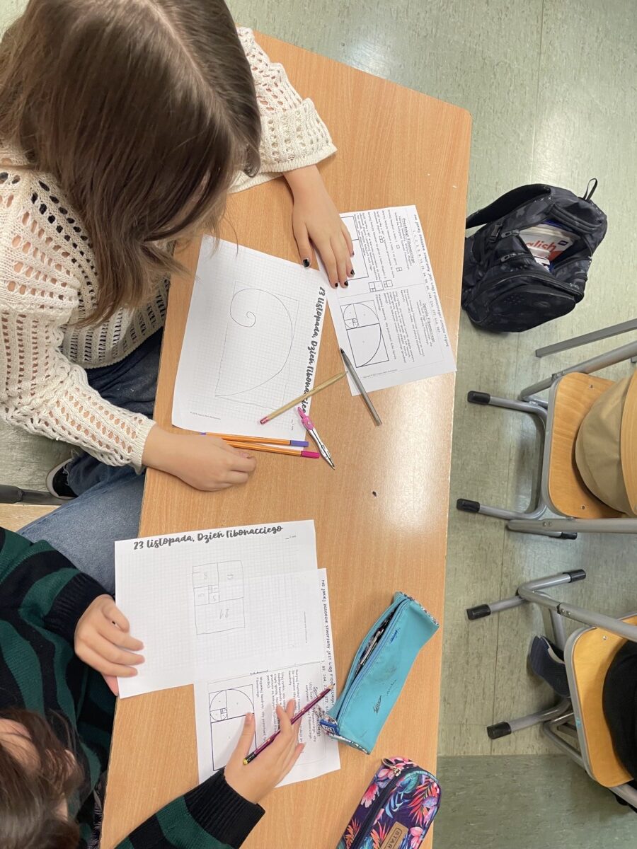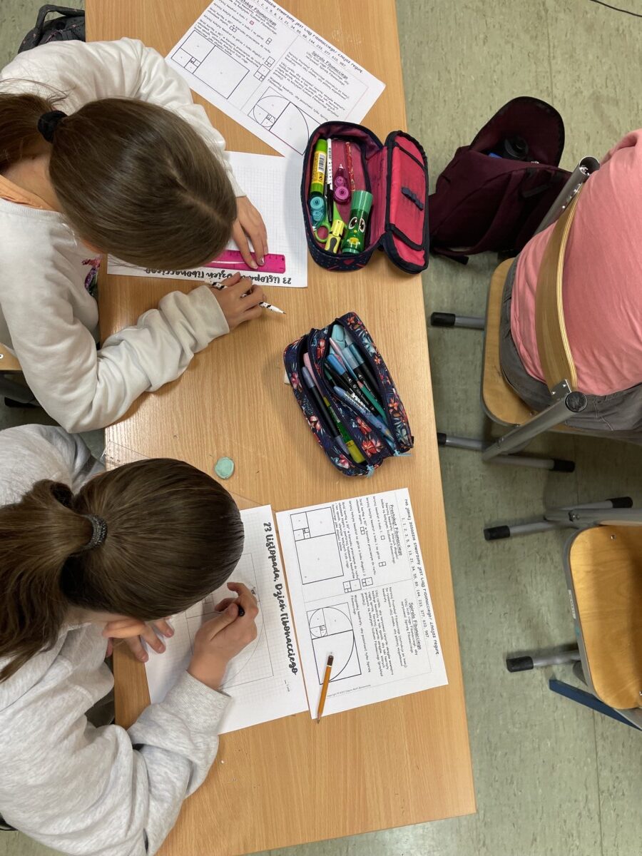 Na początku lekcji uczniowie dowiedzieli się, kim był Fibonacci – włoski matematyk żyjący w średniowieczu, który zasłynął dzięki odkryciu niezwykłego ciągu liczbowego. Następnie, krok po kroku, klasa wspólnie odkrywała regułę ciągu Fibonacciego, gdzie każda liczba jest sumą dwóch poprzednich (1, 1, 2, 3, 5, 8, 13, …). Uczniowie byli zaskoczeni, jak prosty wzór może prowadzić do tak harmonijnych i złożonych struktur w naturze.