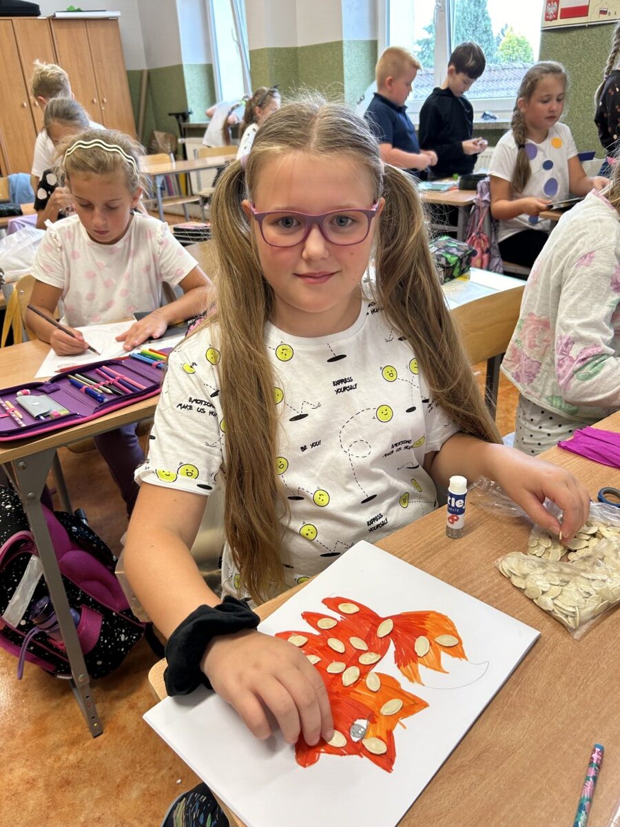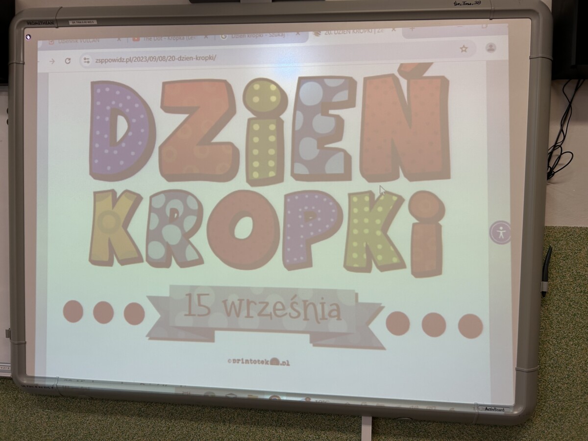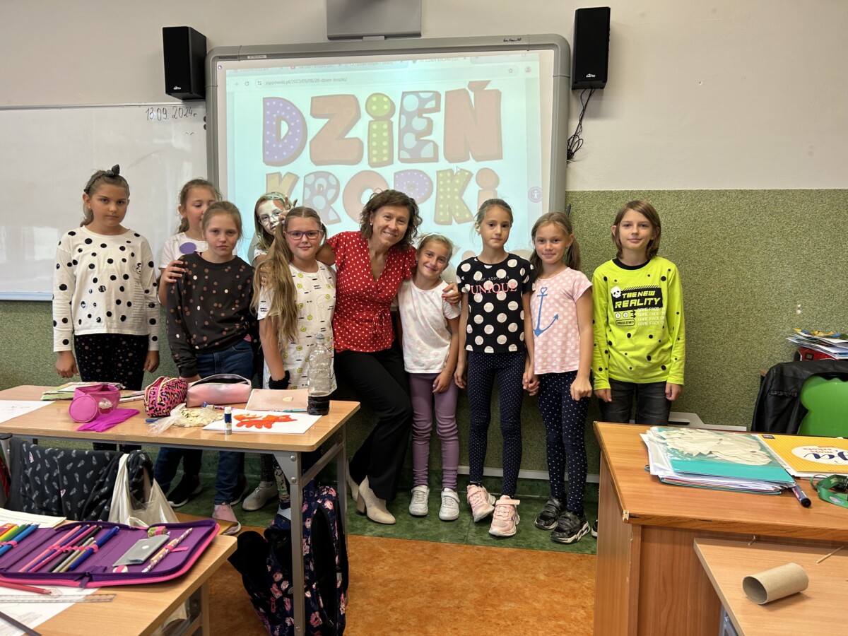Ten dzień uczniowie rozpoczęli od obejrzenia opowiadania o małej dziewczynce Vashti. Bohaterka na naszych oczach, dzięki swojej wspaniałej nauczycielce, uwierzyła w swój, dopiero co odkryty talent, staje się artystką. A wszystko to dzięki kropce. W tym dniu, dzieci wykazały się niezwykłą pomysłowością. Wykonały z różnych owoców jesiennych i nie tylko barwne prace plastyczne, których centralne miejsce zajmowała kropka. W klasie uczniowie ze swoich prac wykonali gazetkę. Po prostu kropki były wszędzie – nie tylko na końcu zdania ale także na rękach, ubraniach i na papierze. Ten radosny, na początku roku szkolnego, dzień zintegrował klasę, pobudził ich do działania. Stał się również okazją do rozmów na temat radzenia sobie z przeciwnościami losu.