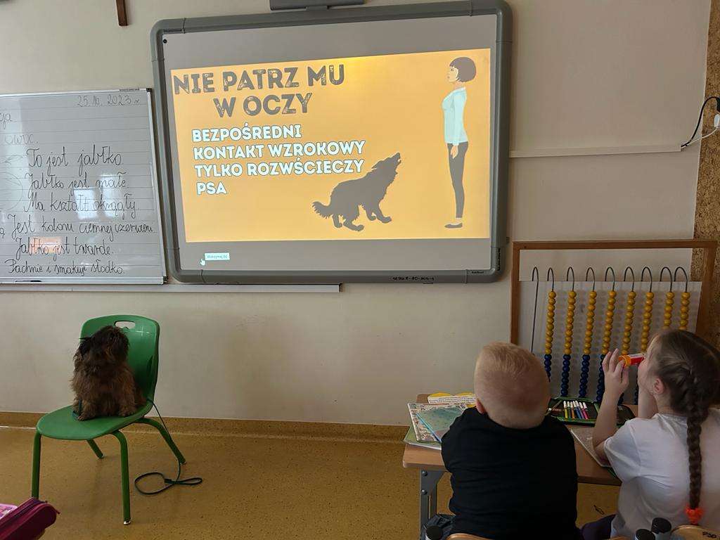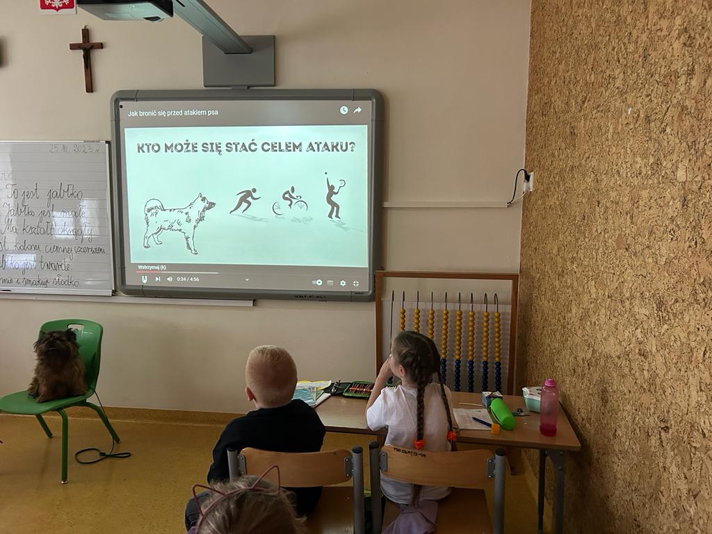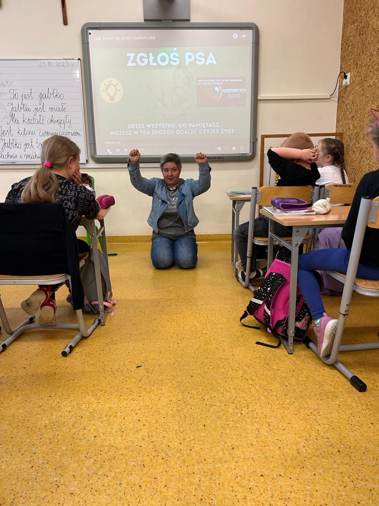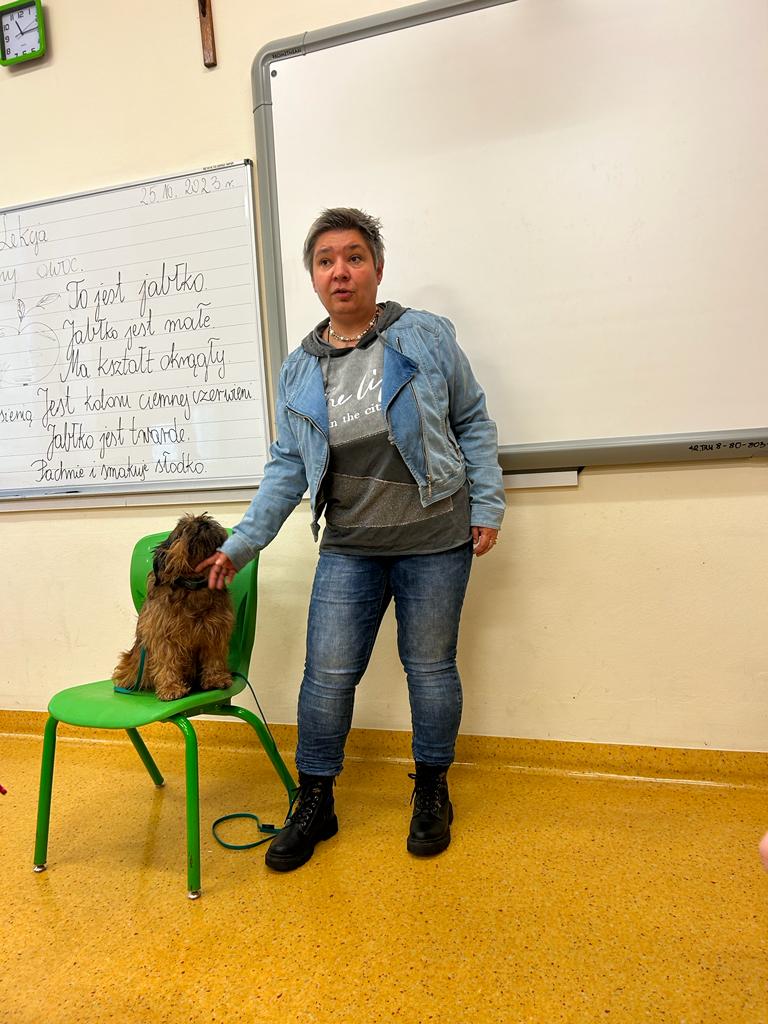 ćwiczyli postawy pozwalające ochronić ciało przed agresją psów. Trenerce towarzyszył pies Antek- rasy gryfonik brukselski. Dla uatrakcyjnienia lekcji pani