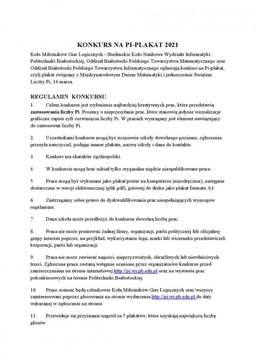Koło Miłośników Gier Logicznych – Studenckie Koło Naukowe Wydziału Informatyki: Politechniki Białostockiej, Oddział Białostocki Polskiego Towarzystwa Matematycznego oraz Oddział Białostocki Polskiego Towarzystwa Informatycznego ogłaszają konkurs na Pi-plakat, czyli plakat związany z Międzynarodowym Dniem Matematyki i jednocześnie Świętem Liczby Pi, 14 marca.