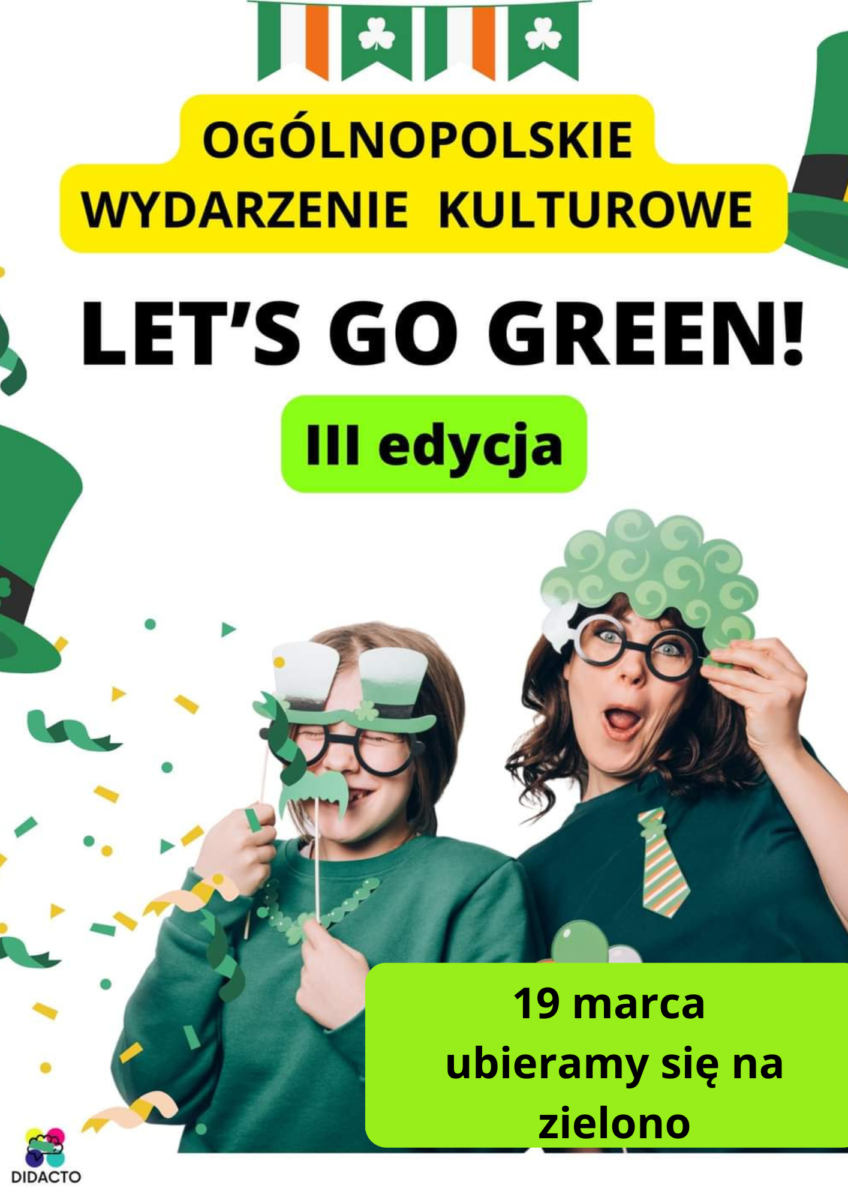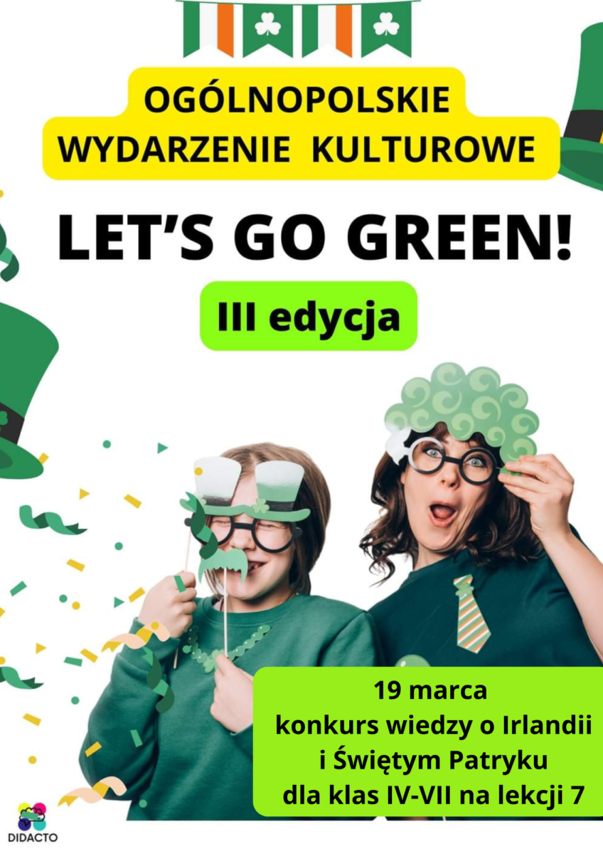 W tym roku nasza szkoła bierze udział w ogólnopolskim wydarzeniu kulturowym “Let’s go green” z okazji Dnia Świętego Patryka. W ramach podsumowania projektu 19 marca zachęcamy całą społeczność szkolną do ubrania się na zielono a uczniów klas IV-VII zapraszamy na szkolny konkurs.