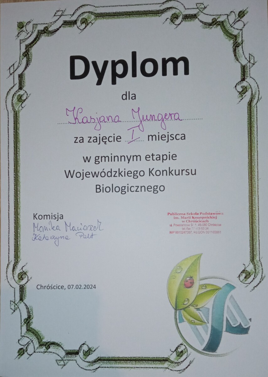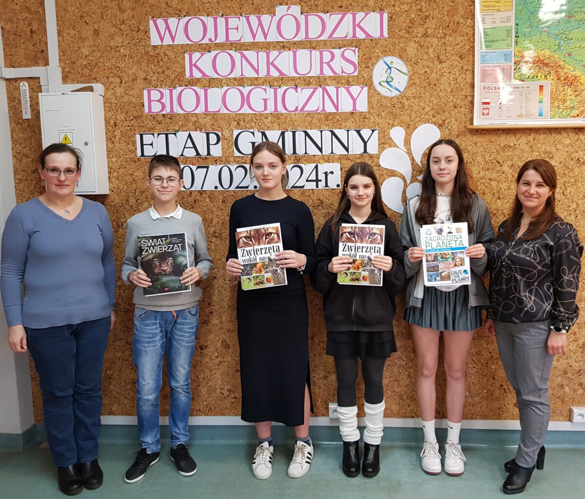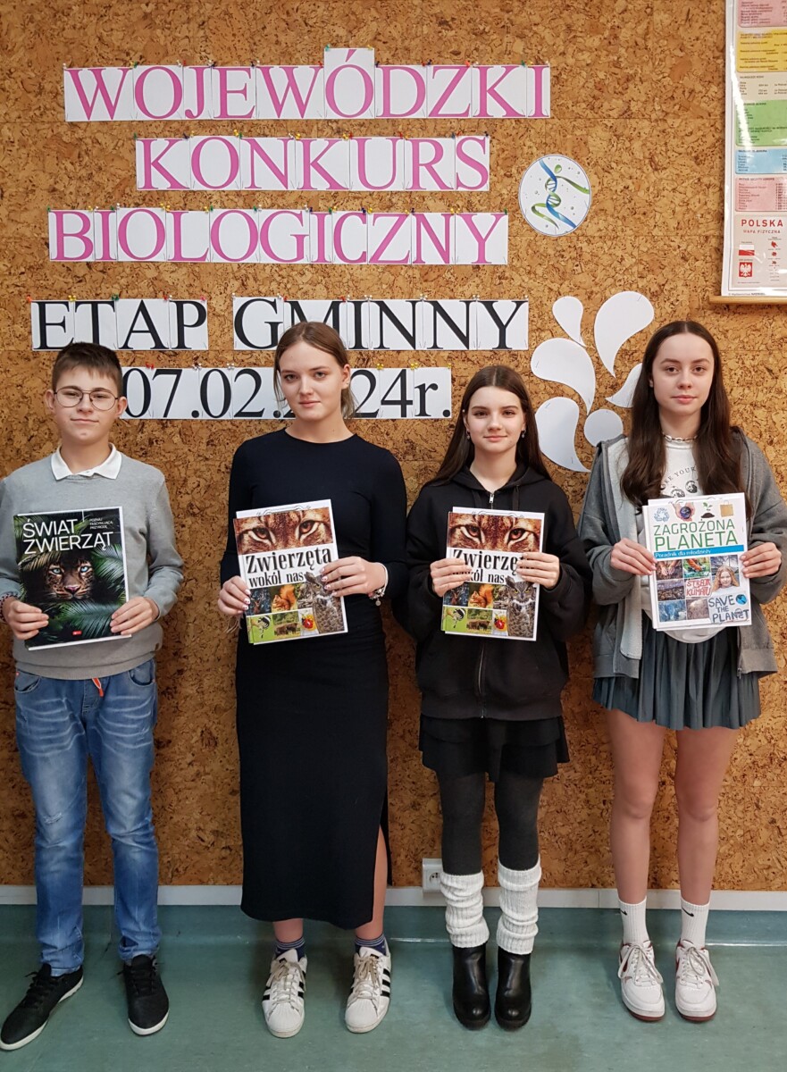 7 lutego 2024 odbył się w naszej szkole etap gminny Wojewódzkiego Konkursu Biologicznego. W eliminacjach wzięło udział 4 uczniów naszej gminy, w tym uczeń naszej szkoły: Kasjan Junger z klasy 7. Kasjan zajął I miejsce, Jego sukces jest naprawdę ogromny, ponieważ jako uczeń 7 klasy, wykazał się również obszerną wiedzą obejmującą materiał klasy 8.