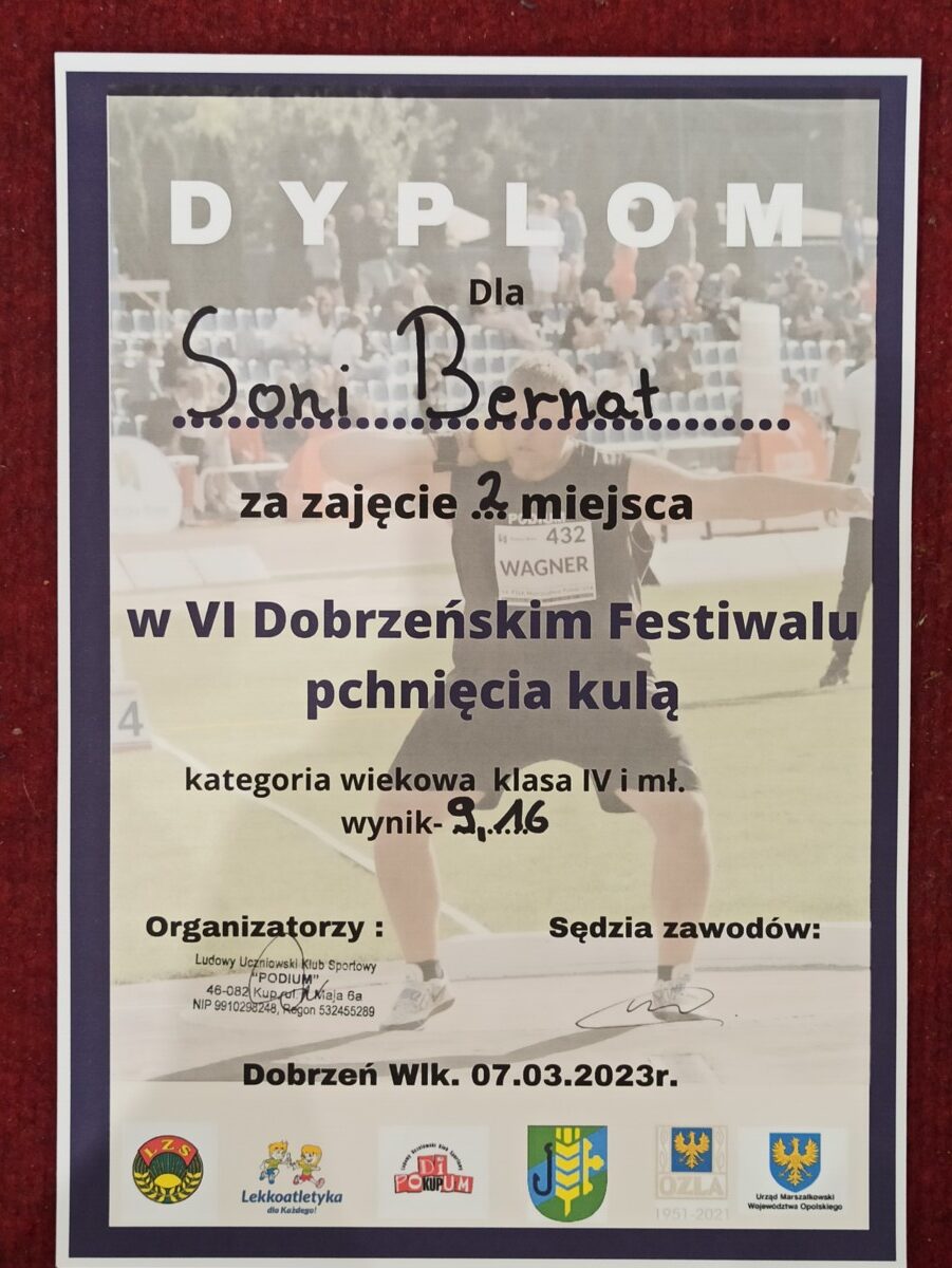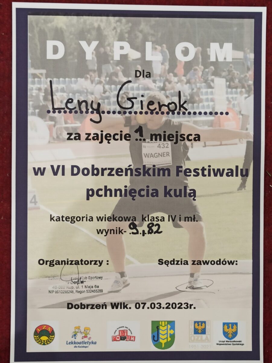 W dniu 7 marca 2023 roku w Zespole Szkół w Dobrzeniu Wielkim odbył się Festiwal skoków i rzutów w lekkiej atletyce. W wydarzeniu tym wystartowało 6 reprezentantów naszej szkoły. Bardzo dobre wyniki w pchnięciu kulą osiągnęły nasze uczennice z klas V i VI. Uczennica PSP w Chróścicach – Sonia Bernat osiągnęła wyśmienity wynik w pchnięciu kulą – aż 9 metrów i 14 centymetrów. Pierwsze miejsce udało się za to zająć kolejnej naszej podopiecznej – Lenie Gierok, której wynik wyniósł 9 metrów 82 centymetry. Również uczeń naszej szkoły Krzysztofa Bernata osiągnął dobry wyniki zajmując szóste miejsce. Pozostali reprezentanci naszej szkoły – Nikodem Włodarczyk, Justyna Bauc oraz Dawid Golec nabrali obycia i doświadczenia w udziale w zawodach. Opiekunem grupy był nauczyciel wychowania fizycznego w PSP w Chróścicach – Pan Marcin Kondziela.