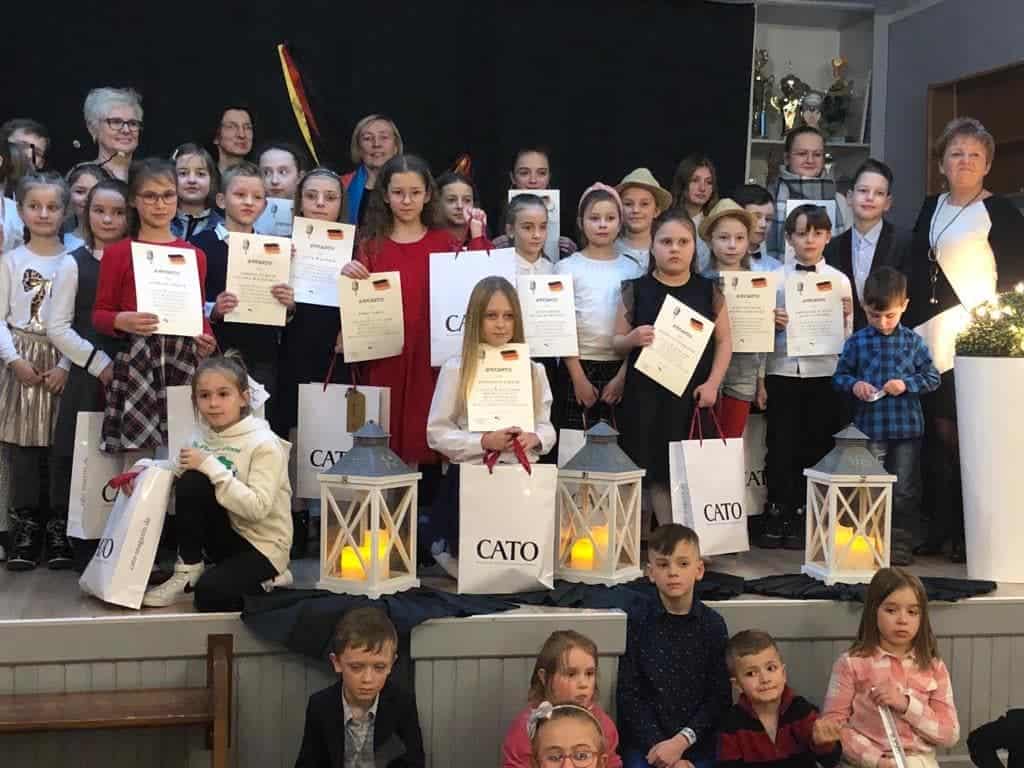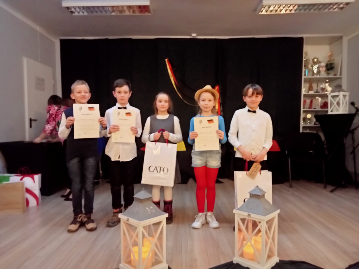 W dniu 28.01.23r. w sali wiejskiej Kup odbył się uroczysty finał Konkursu Piosenki Niemieckiej „Wir suchen den Superstar”. Pierwszy etap polegał na nagraniu piosenki w języku niemieckim i wysłaniu do organizatorów – 18 uczniów naszej szkoły brało w tym udział. Były to dzieci z klas IIA, IIB, III, IV oraz VIIIB. Wszystkich uczestników w pierwszym etapie z województwa opolskiego i śląskiego było 72. Do finału zakwalifikowało się 9 uczniów naszej szkoły. Dzieci z klas IIA oraz III przygotowywała pani Anna Skrzipietz, natomiast uczniów z klasy IIB przygotowywała pani Irena Weber. W finale uczestniczyło 21 grup śpiewaczych (30 uczniów). Pod czujnym okiem jury wyłoniono najlepszych. Oto wyniki:
