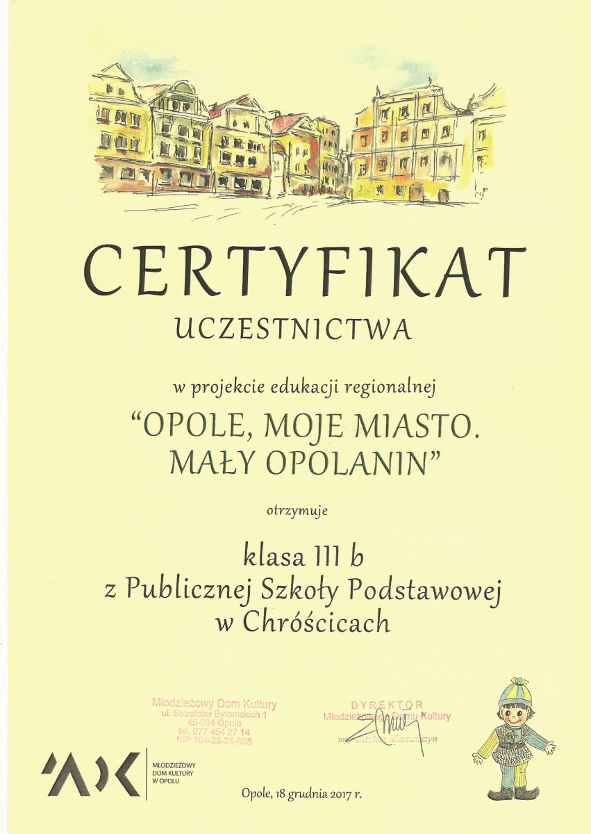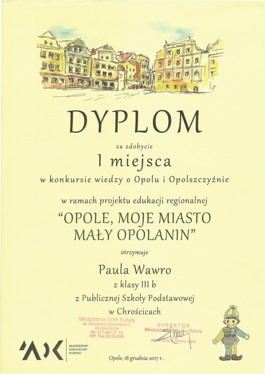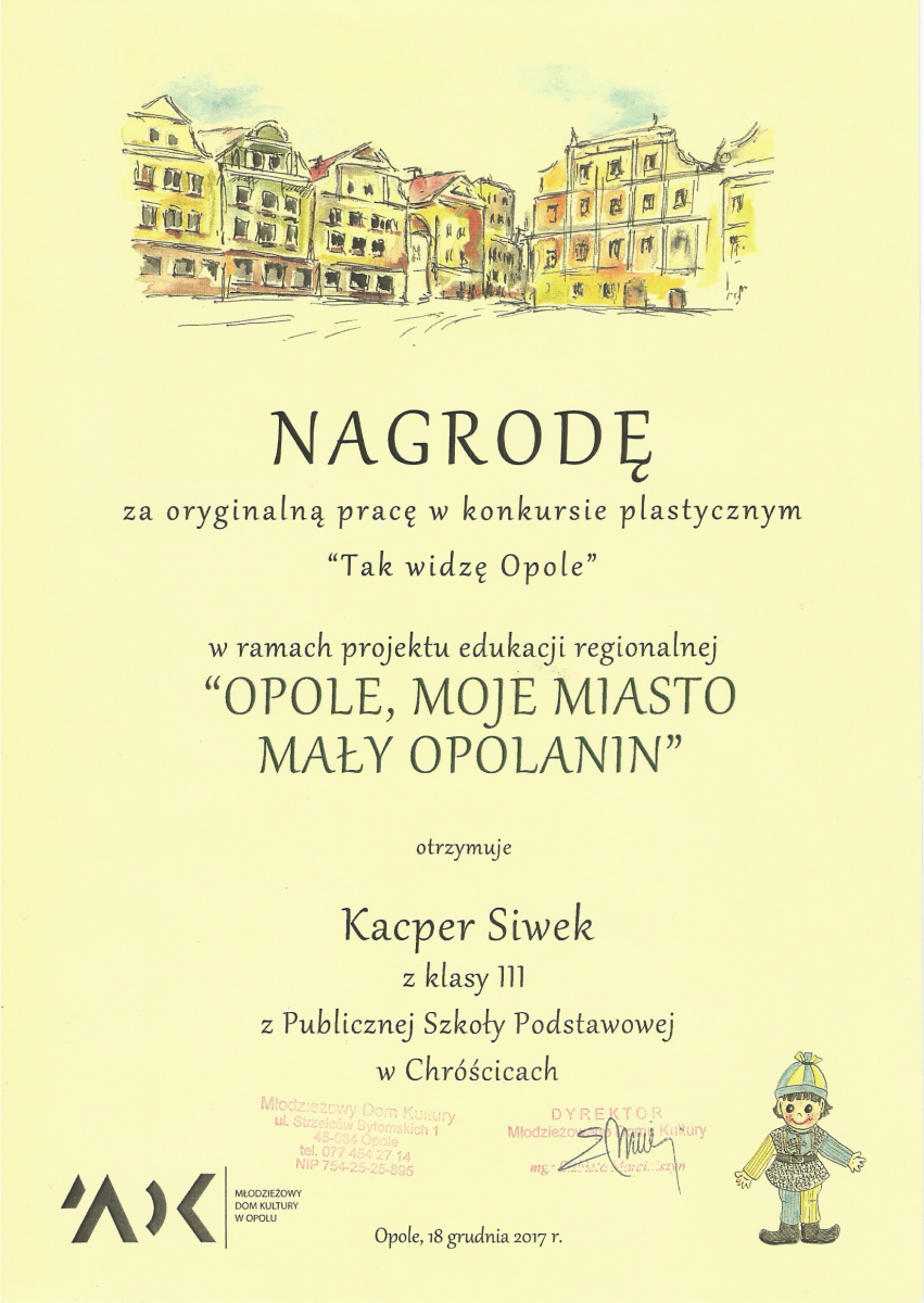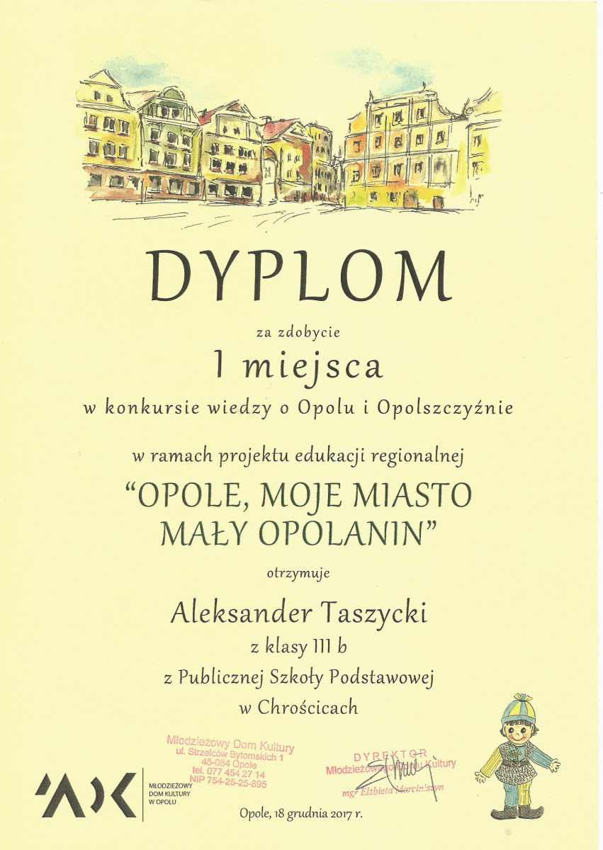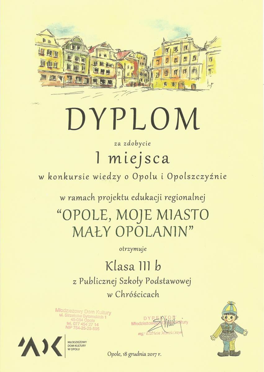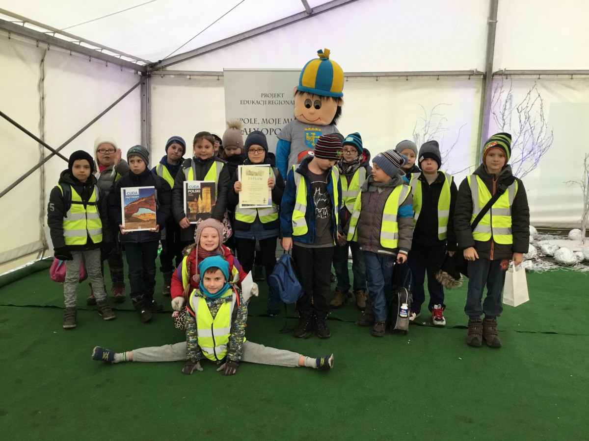 Poniedziałek 18 grudnia był dniem pełnym wrażeń dla uczniów klasy IIIb, bowiem uczestniczyli w finale projektu “Mały Opolanin”. Liczne nagrody otrzymali w ramach losowania specjalnych paszportów, Dawid Kupczyk, Bartosz Konrad i Kacper Siwek. Kacper oprócz tego zdobył nagrodę za oryginalną pracę w konkursie plastycznym “Tak widzę moje miasto”. Uwieńczeniem dnia było zdobycie I miejsca spośród szkół województwa opolskiego w konkursie wiedzy o Opolu i Opolszczyźnie, podczas którego klasę oraz szkołę reprezentowali: Paula Wawro. Fabian Kaluża, Aleksander Taszycki. Gratulujemy zaszczytnego I miejsca, życząc jednocześnie dalszych sukcesów.