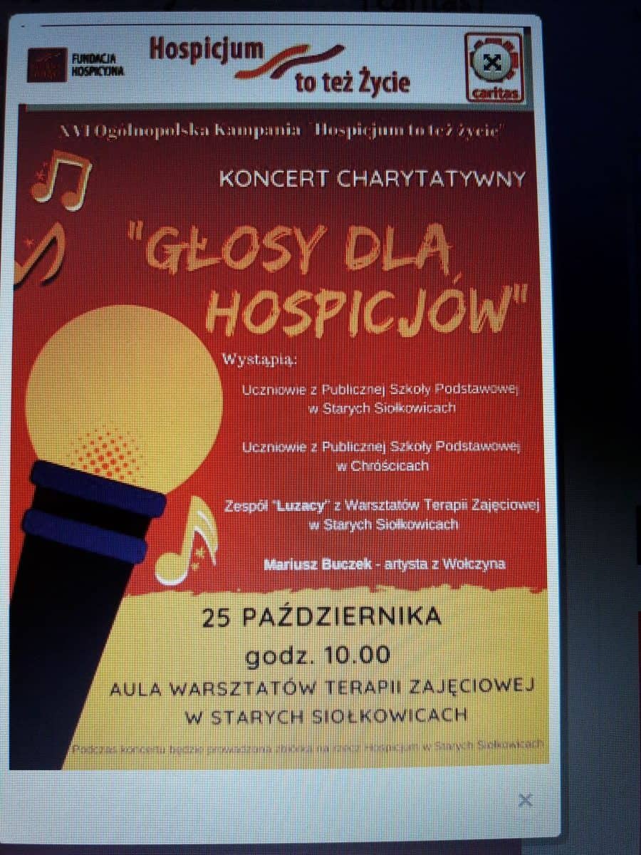 25 października w Starych Siołkowicach odbył się koncert charytatywny – Głosy dla hospicjów w ramach XVI Ogólnopolskiej Kampanii „Hospicjum to też życie”. Wzięli w nim udział uczniowie ze Starych Siołkowic, Chróścic, podopieczni Warsztatów Terapii Zajęciowej i zaproszony gość –  Mariusz Buczek artysta z Wołczyna. Uczniowie zaprezentowali utwory wokalne, instrumentalne i tańce. Również  uczestnicy WTZ  przygotowali  piosenki, ale zachwyt wzbudził występ  Sandry i  Pani Katarzyny. Zaśpiewały wzruszającą piosenkę „Mamo, Bóg się nie pomylił”. Na koniec wystąpił Mariusz Buczek z repertuarem poezji śpiewanej.         Wszystkie występy zostały nagrodzone brawami, a spotkanie zakończyło się słodkim poczęstunkiem.