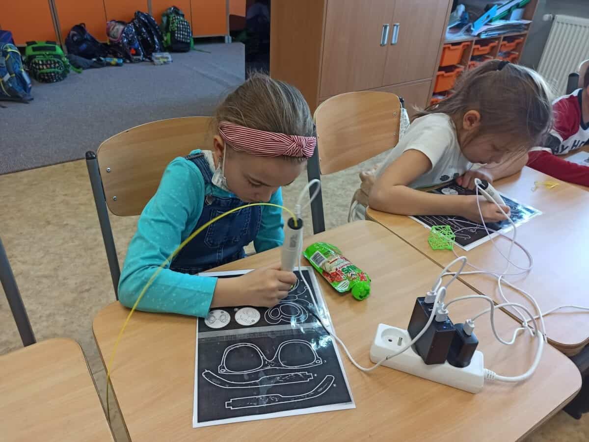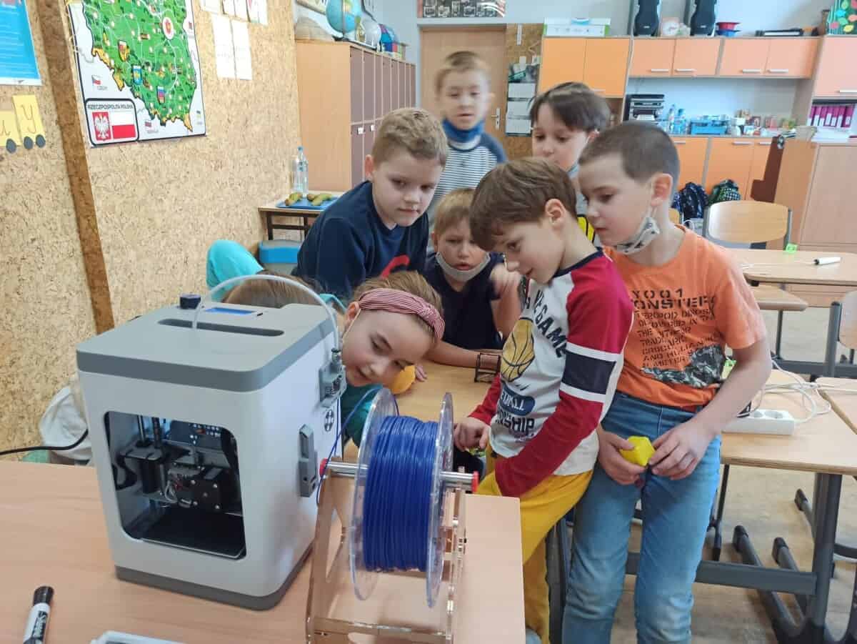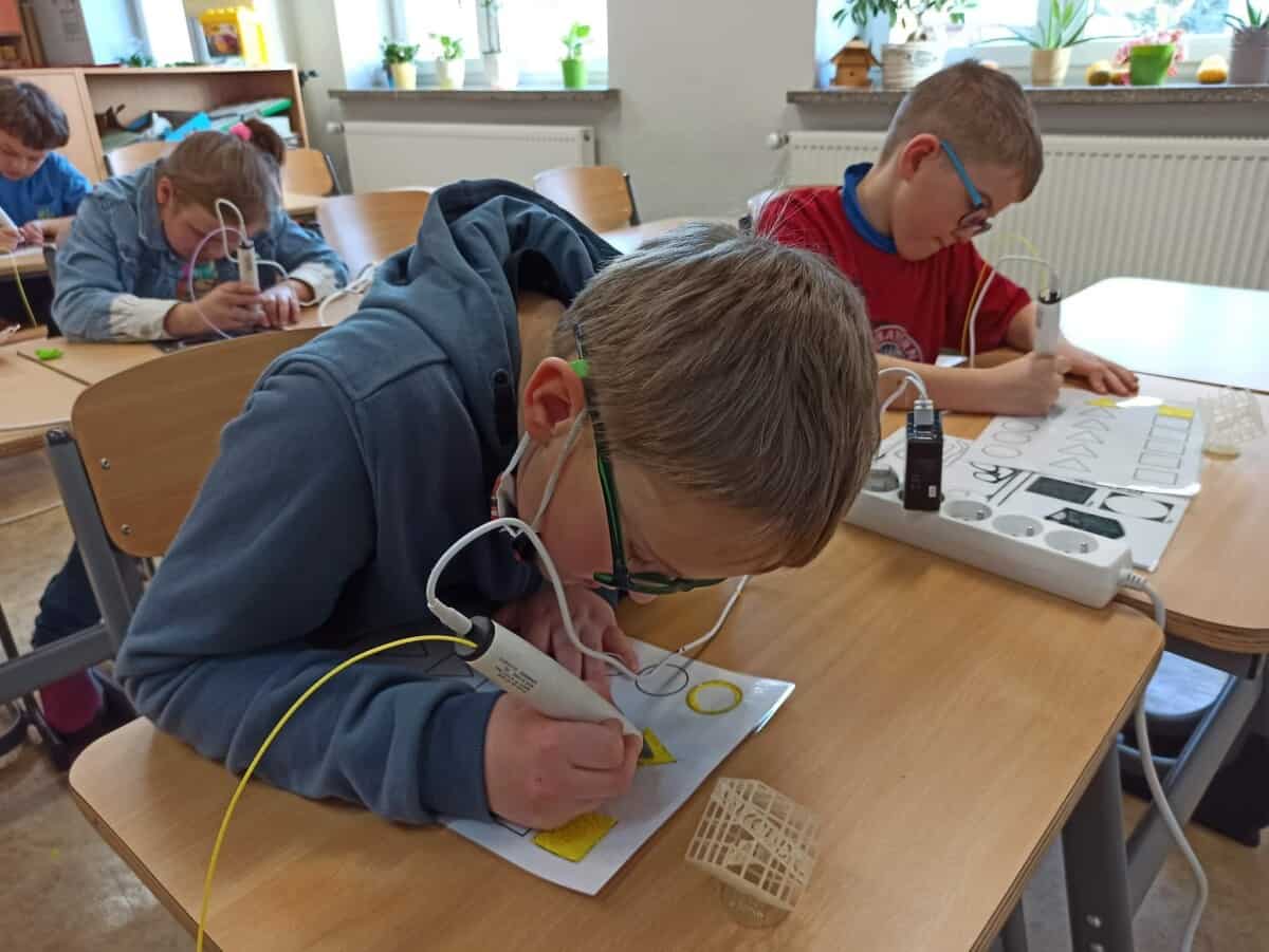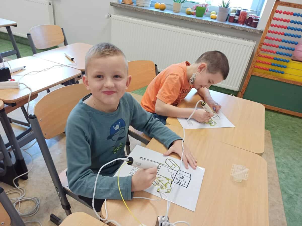 Dziś na zajęciach uczyliśmy się jak działa drukarka 3D oraz jak powstaje wydruk. Dzieciaki pracowały indywidualnie nad swoim drukiem wykonanym także długopisami 3D sprawdzając jednocześnie czy mogą zrobić takie same elementy jak drukarka. Sprawdziliśmy na czym polega precyzja ramion drukarki a naszych ramion tworząc figury geometryczne w przestrzeni 3D. Uczyliśmy się także czym się różni wkład do zwykłego długopisu od filamentu oraz jakie są rodzaje i przy jakich temperaturach się rozpuszcza. Rozwiązywaliśmy problemu jakie mogą nas spotkać przy obsłudze drukarki rozmyślając czego nie jesteśmy w stanie wydrukować.