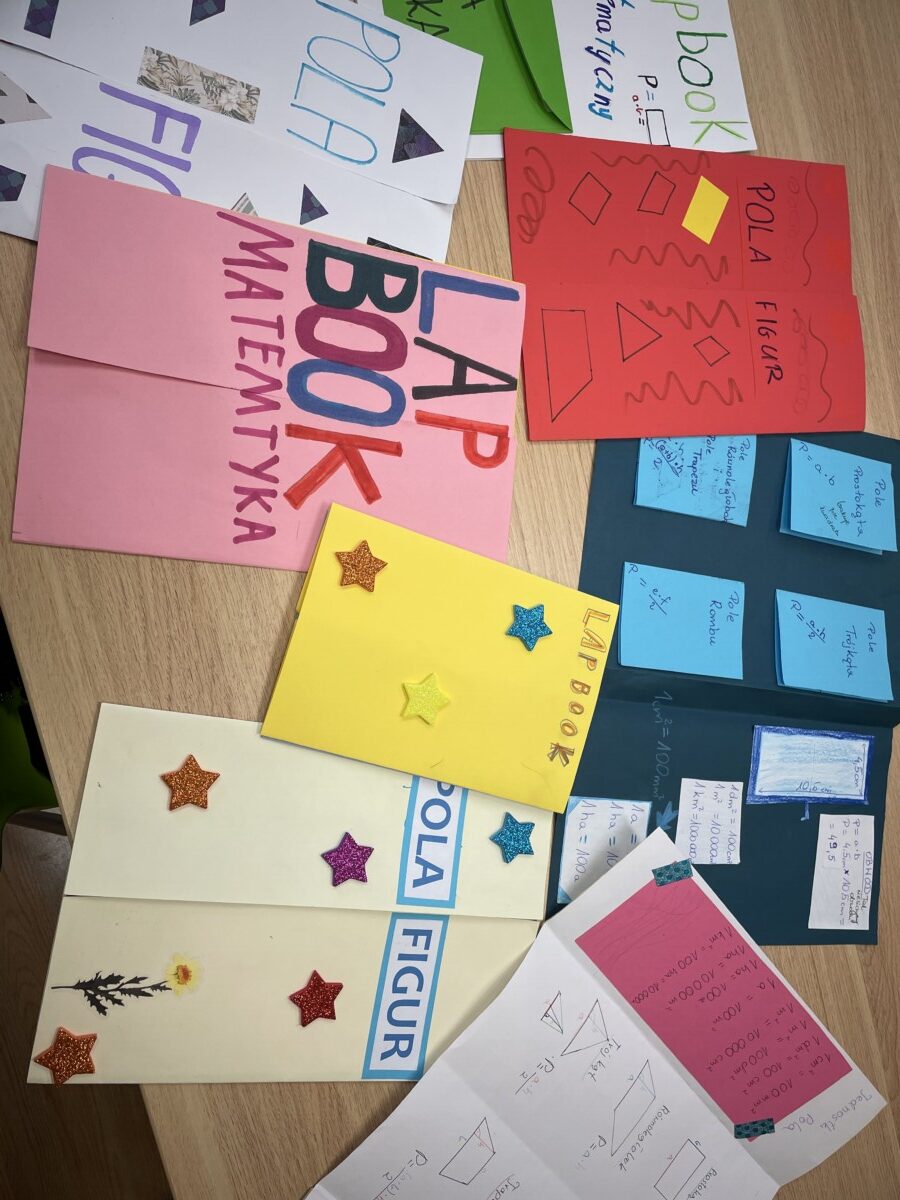 , z wielkim zaangażowaniem zagrali w grę karcianą „ Jakie masz pole?” oraz wykonali lapbooki ze wszystkimi poznanymi wzorami, co to jest obwód figury oraz zamianę jednostek pól.