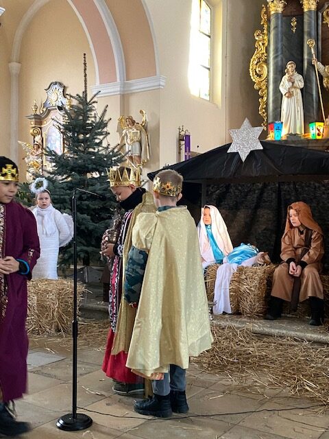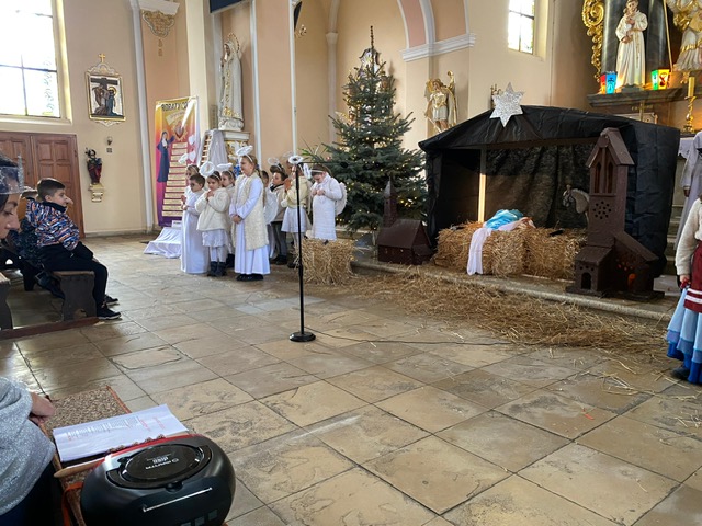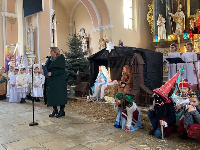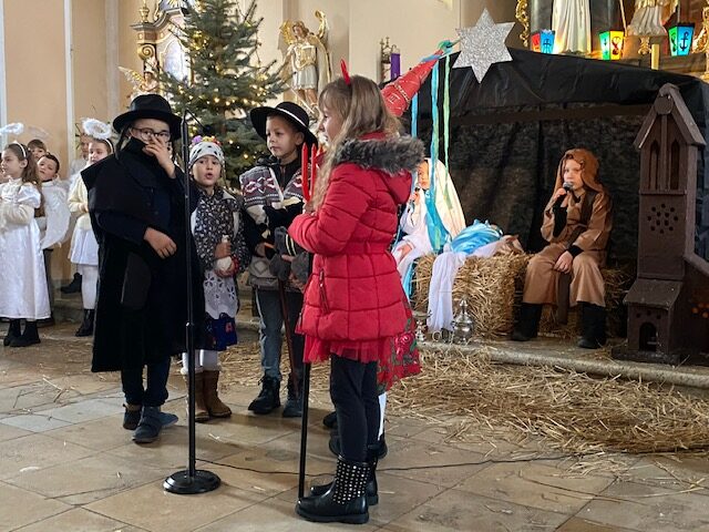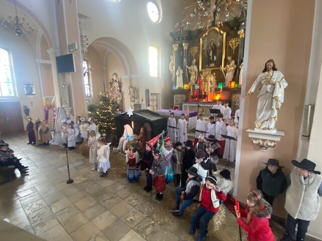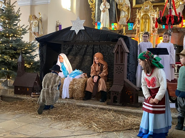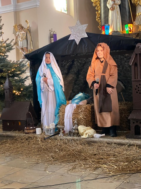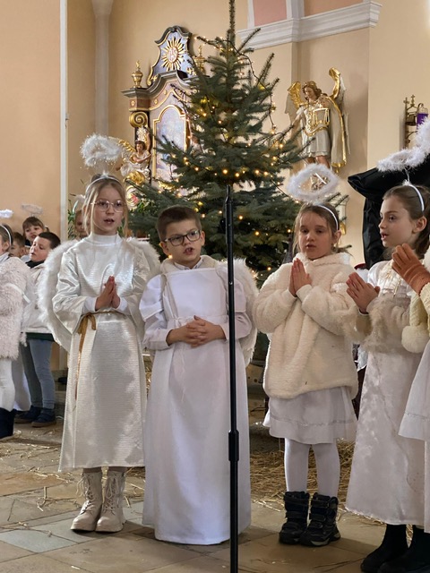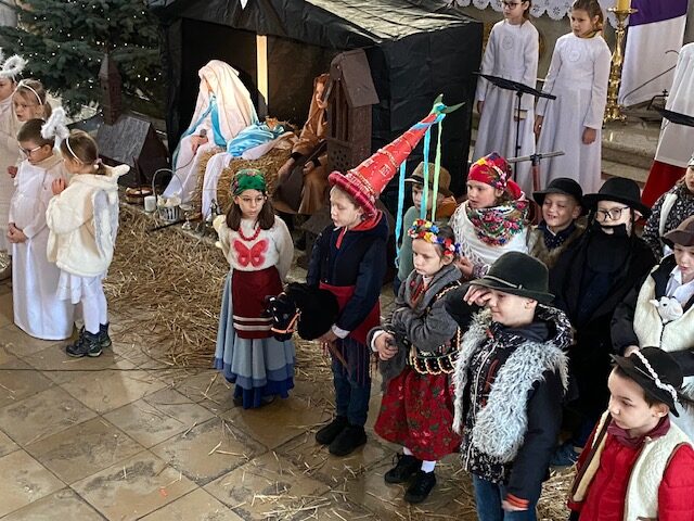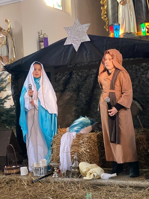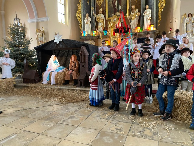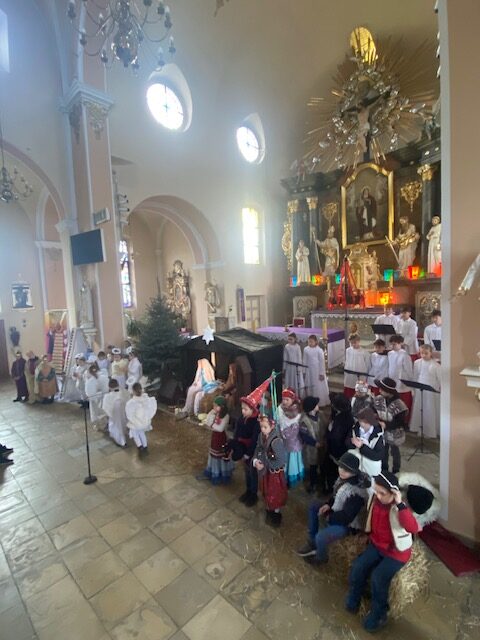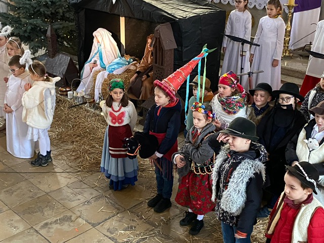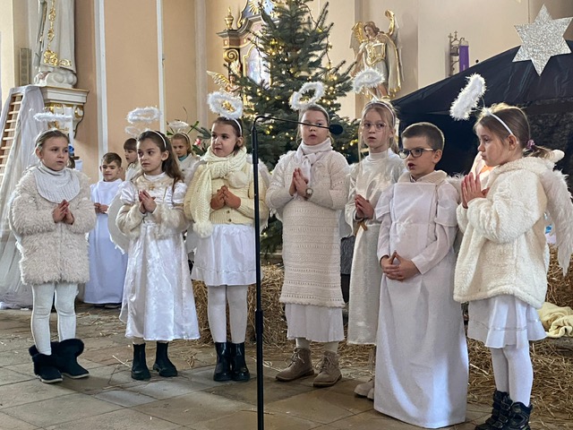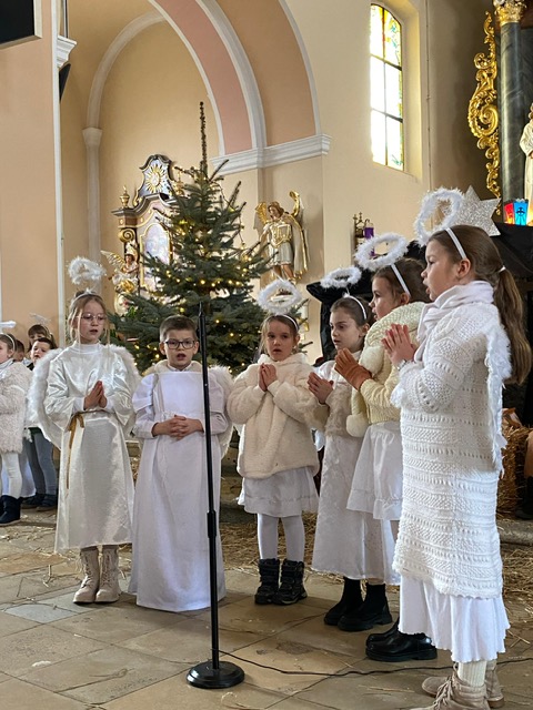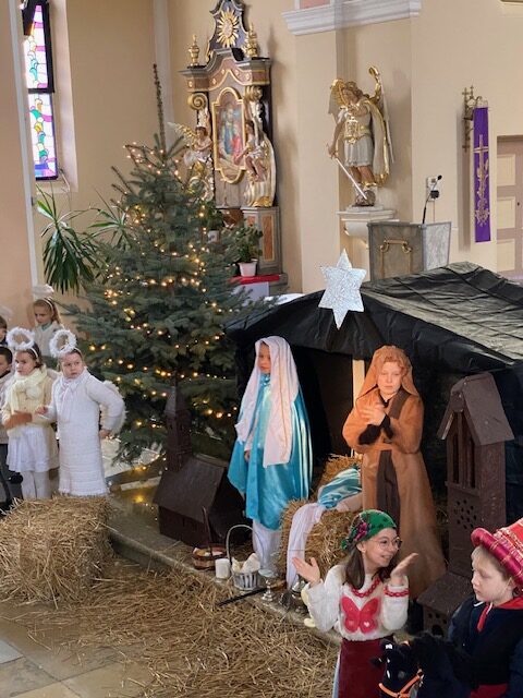 Te grudniowe święta sprawiają, że cały świat chociaż na chwilę się zatrzymuje. Każdy z nas z niecierpliwością czeka na ubieranie choinki, wigilijny stół, śpiewanie kolęd, łamanie się opłatkiem, czy na możliwość spotkania się z rodziną. Święta Bożego Narodzenia to dla nas wszystkich szczególny czas, przepełniony chwilami wielkiej radości, wzruszeń i niespodzianek. Czas, kiedy odnajdujemy spokój, moment wytchnienia od codziennych trosk. W oczekiwaniu na te magiczne dni, 19 grudnia, uczniowie klas 1a, 2a a także uczniowie klasy 4 i 7 (zespół wokalny) przygotowali jasełka bożonarodzeniowe. Mali aktorzy przenieśli widzów do ubogiej stajenki w Betlejem. W specjalnie przygotowanych strojach oraz w otoczeniu pięknej scenografii Kościoła przedstawili narodziny Jezusa. Klasyczne sceny biblijne przeplatały się ze wspólnym śpiewaniem kolęd i pastorałek. Występ wprowadził całą społeczność szkolną w świąteczny nastrój.