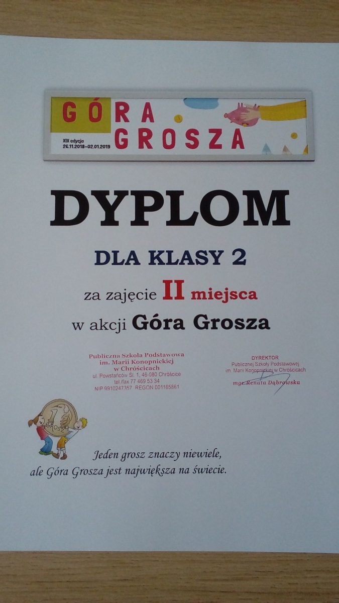 działanie edukacyjne – pokazanie najmłodszym, jaką siłę stanowić może niewielka pomoc wielu ludzi i wspólne działanie dla dobra potrzebujących. Uczniowie nie zawiedli, każdy przyniósł tyle, ile mógł – w myśl zasady: Jeden grosz znaczy niewiele, ale Góra Grosza jest największa na świecie. Nasza Góra Grosza to 794,88 zł.