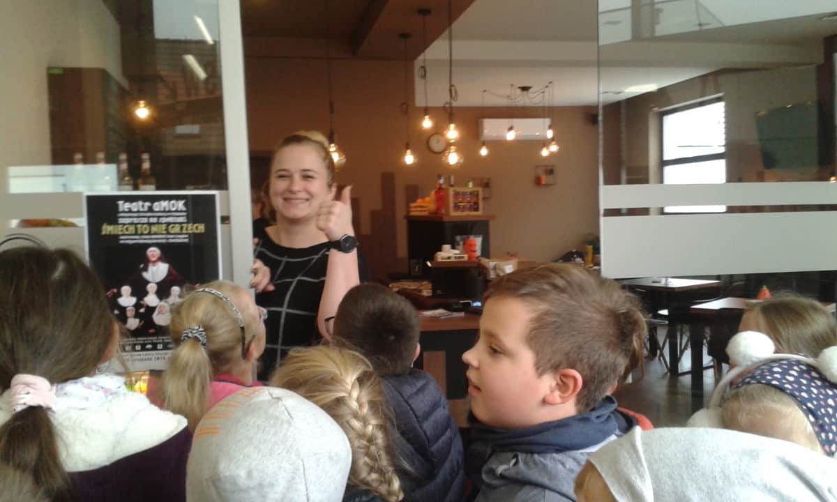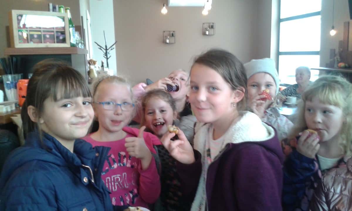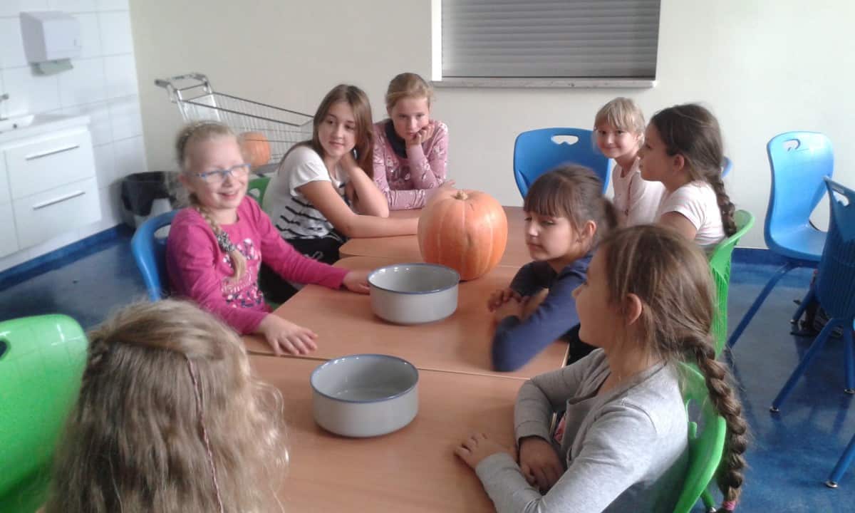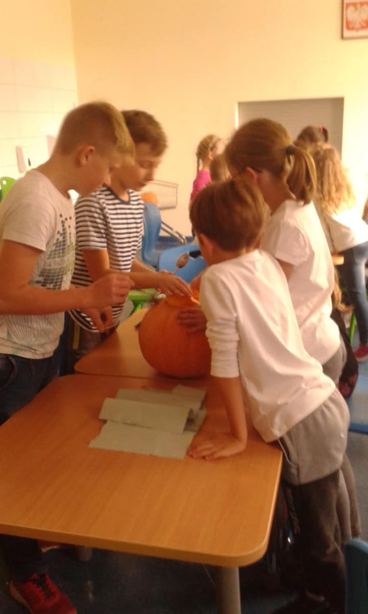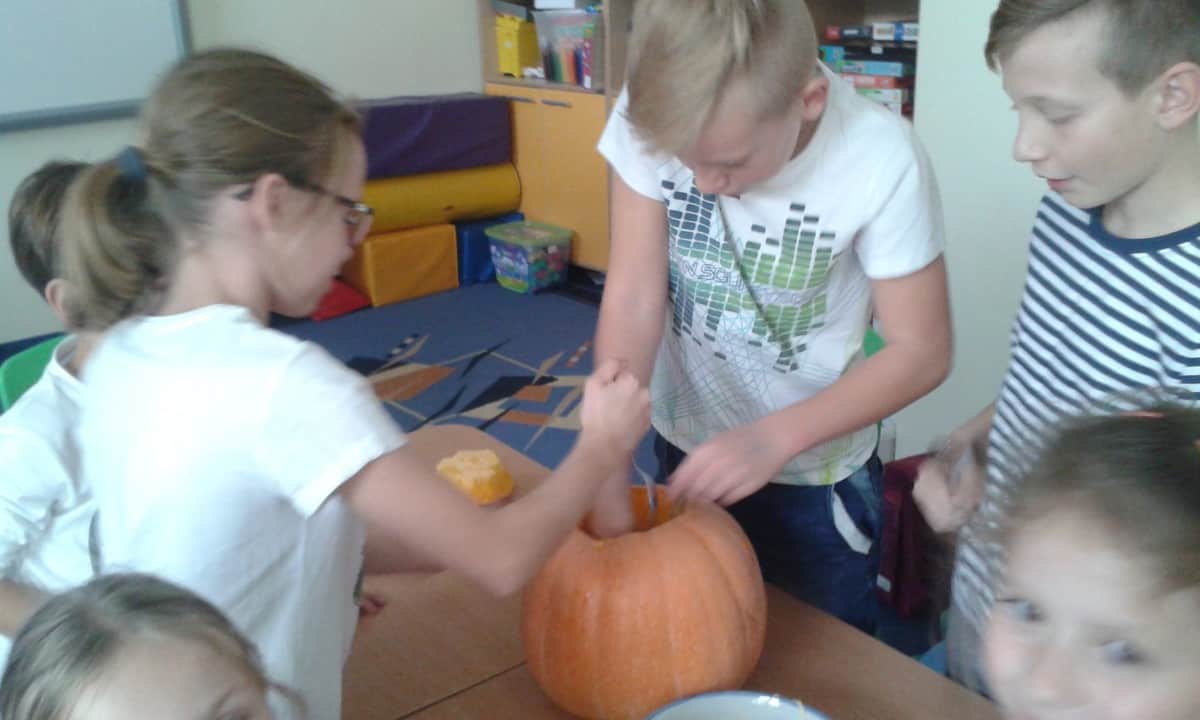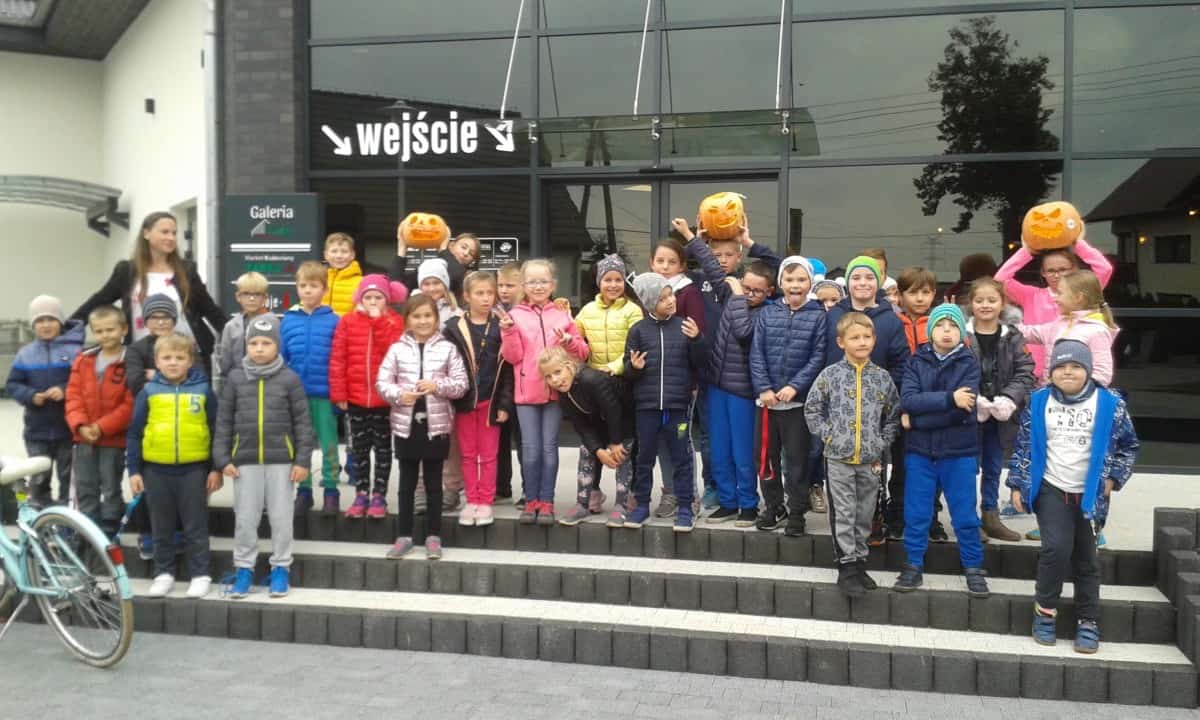 W ramach współpracy ze środowiskiem lokalnym uczniowie ze świetlicy oraz wolontariusze wykonali jesienne ozdoby z dyni. Dzieci wykonywały je na prośbę p. Anety Pawolek właścicielki „Tadej Kafeju”. W poniedziałek 28.10 uczniowie wybrali się na spacer do „Galerii Tadej” gdzie czekał na nich – dla zachęty – słodki poczęstunek. Po odbiorze dyń dzieci zabrały się z wielkim zaangażowaniem do pracy. Na początku trzeba było wyjąć pestki oraz miąższ. Później następowało szkicowanie wzorku na dyni oraz wycięcie przy pomocy nauczycieli elementów w dyni. Wszystko działo się pod czujnym okiem wychowawców świetlicy. Ozdabianie okazało się niezwykłą atrakcją. Następnie odbyła się dla chętnych sesja fotograficzna z dynią w roli głównej. Kolejnego dnia uczniowie przekazali swoje dzieła sztuki do „Tadej Kafeju”. Każdy z uczestników otrzymał coś słodkiego. Liczymy na dalszą miłą współpracę.