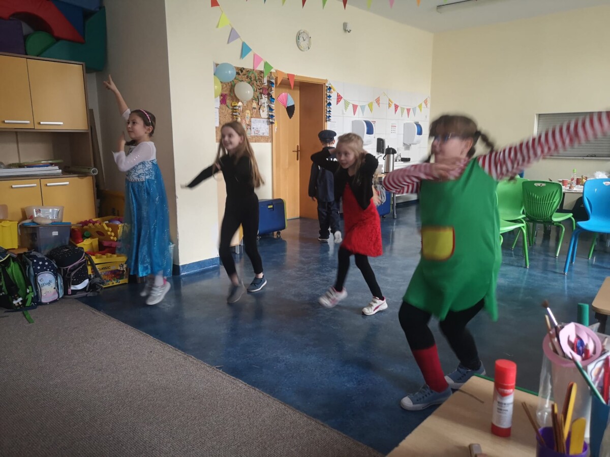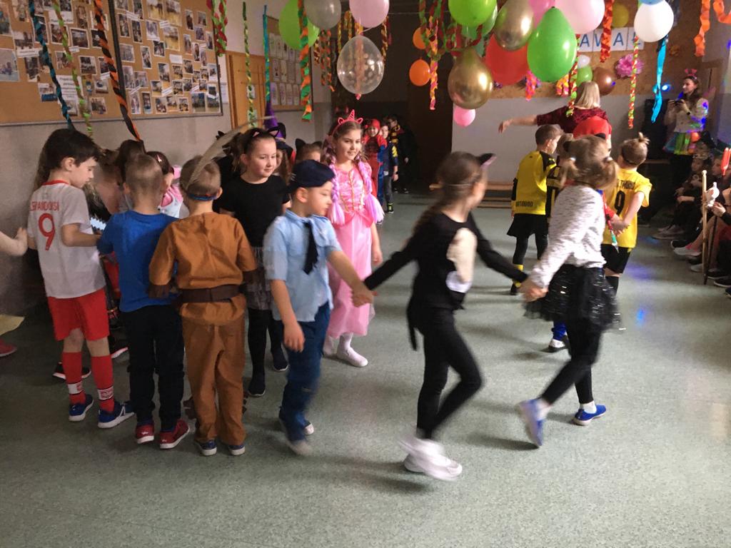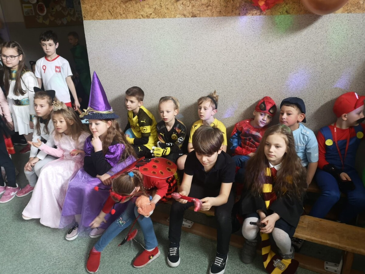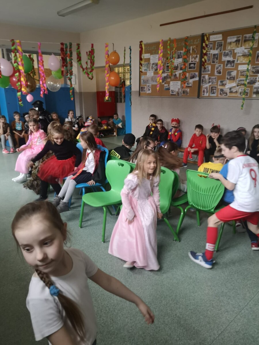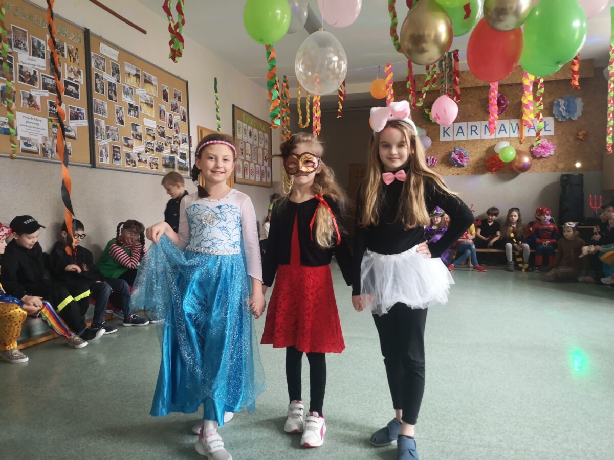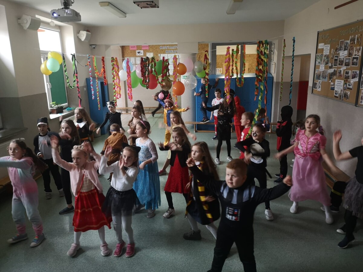 Przekonali się o tym uczniowie klas 1-3. W piątek, 10 lutego, na dzieci czekały pięknie udekorowane klasy oraz korytarz, na którym odbył się pokaz karnawałowych strojów. Nie zabrakło księżniczek, wróżek, superbohaterów, kolorowych zwierzątek i innych bajkowych postaci. Podczas wspólnych chwil nikogo nie opuszczał dobry humor! Były tańce, zabawy w “gorące krzesła” oraz pociąg, do którego chętnie dołączali przebierańcy. Po pląsach na korytarzu, który