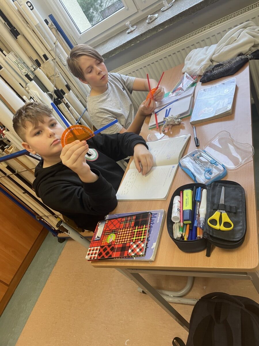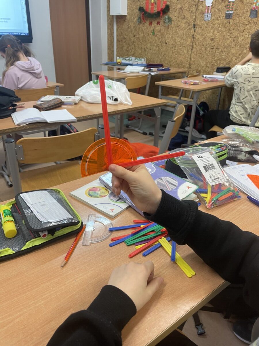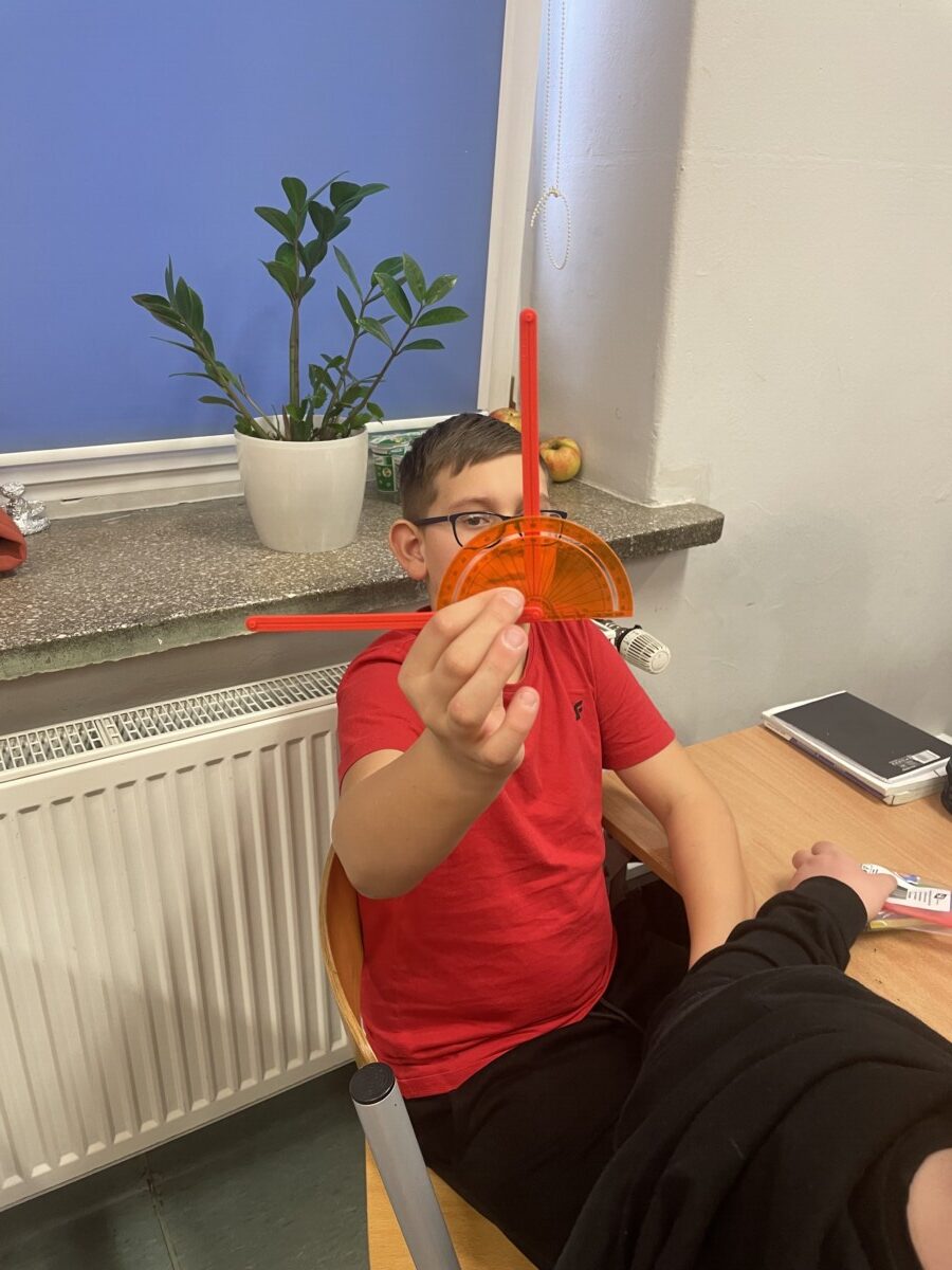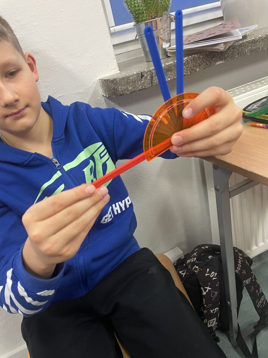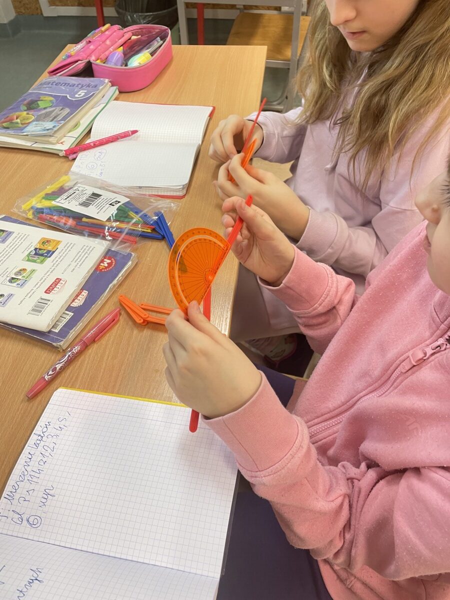 Tak o to klasa 5 po dziale ułamków zwykłych wkroczyła pewnym krokiem w dział geometrii . Na ostatniej lekcji, z wielkim zaanagażowanie uczniowie przypominali sobie  i pokazywali budowę, rodzaje  oraz mierzenie kątów z pomocą takich o to kolorowych pomocy dydaktycznych