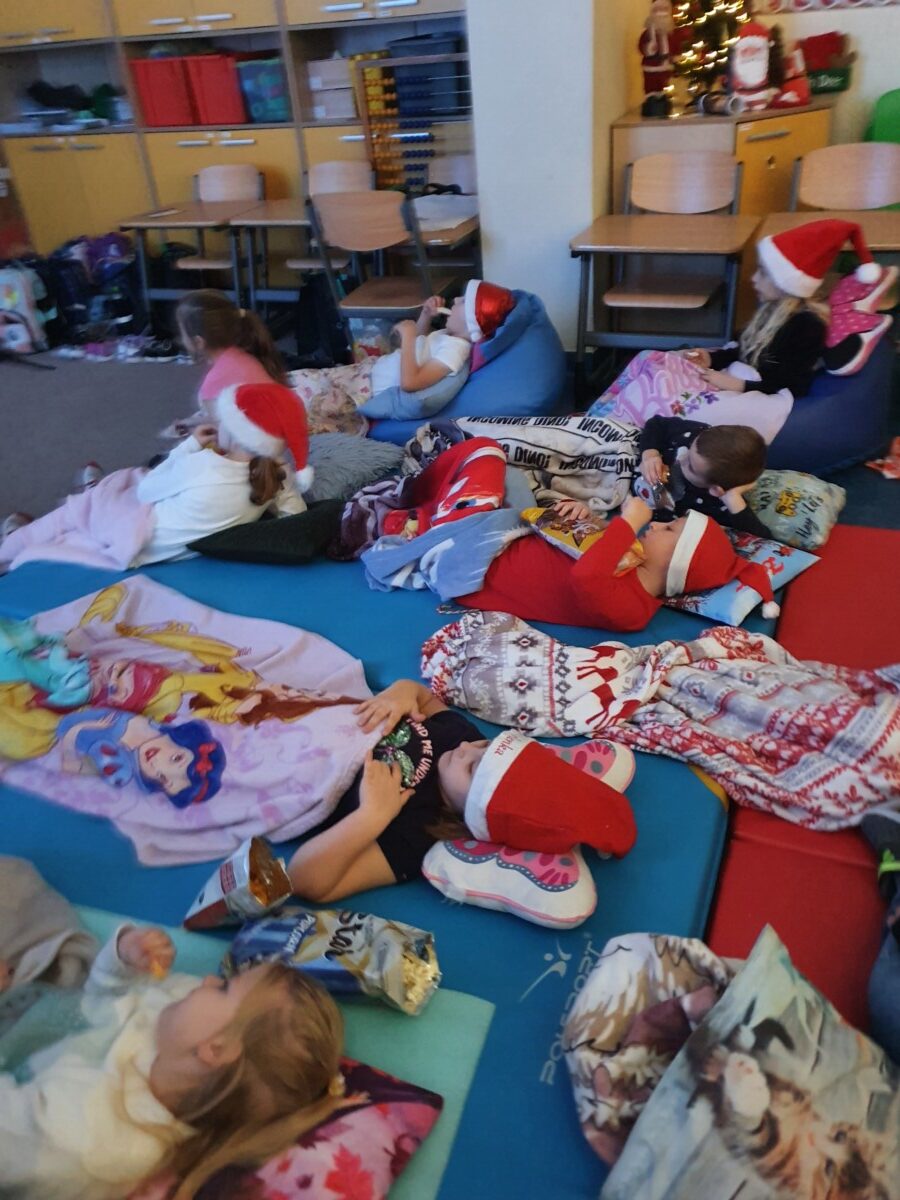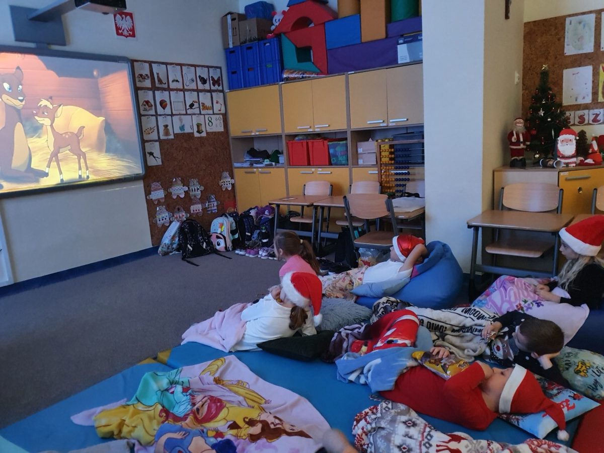 Uczniowie klasy 1b podczas mikołajek zamienili swoją klasę w KINO. Wspólnie oglądali bajkę o czerwononosym reniferze i śpiewali piosenki. Oczywiście były