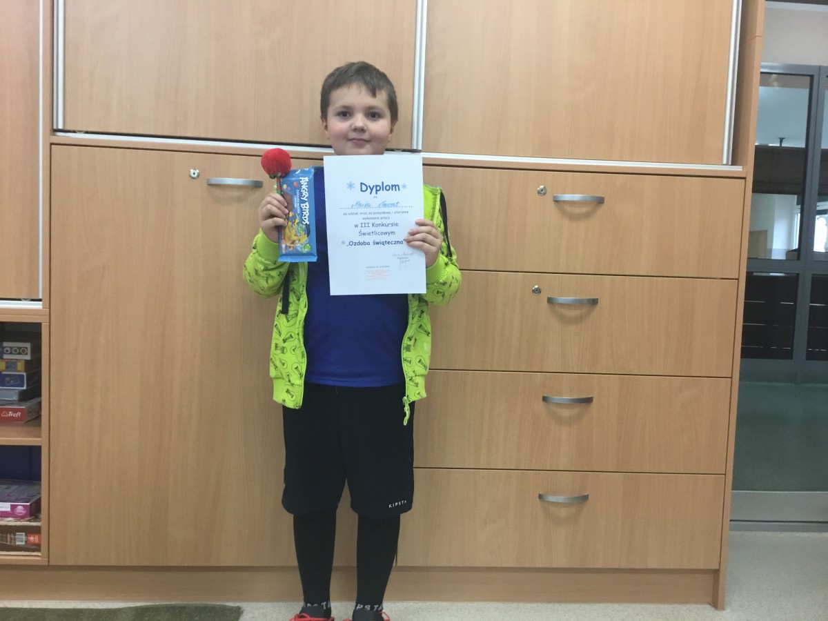 Rozstrzygnięto kolejny konkurs świetlicowy pod hasłem „Ozdoba świąteczna”. Nagrody otrzymali Eliza z klasy I oraz Emili i Maik z klasy II.Tym razem dzieci do wykonania prac musiały wykorzystać jesienne liście, a dodatkowo wykazać się pomysłowością. Dzieci otrzymały dyplomy oraz upominki.