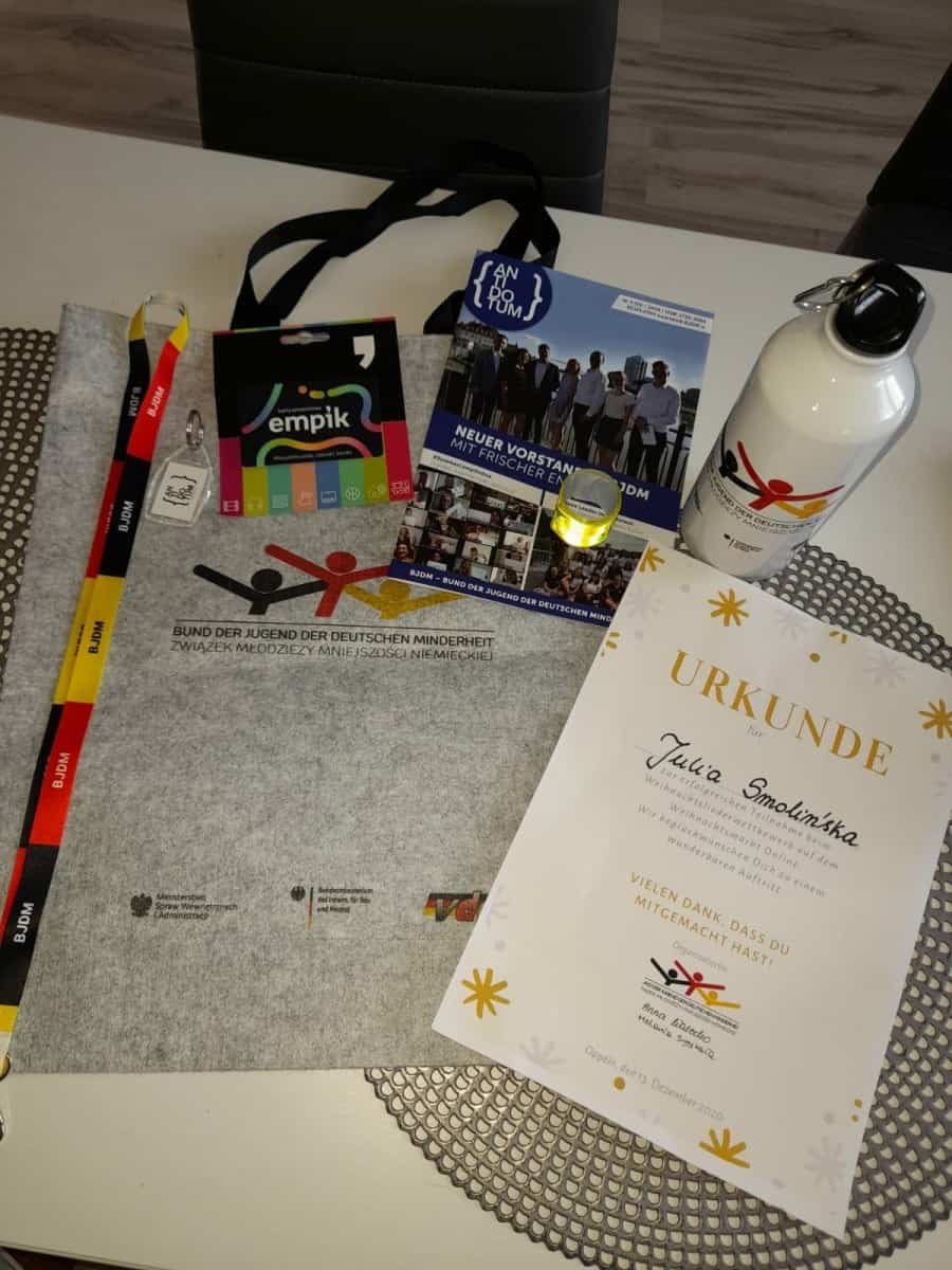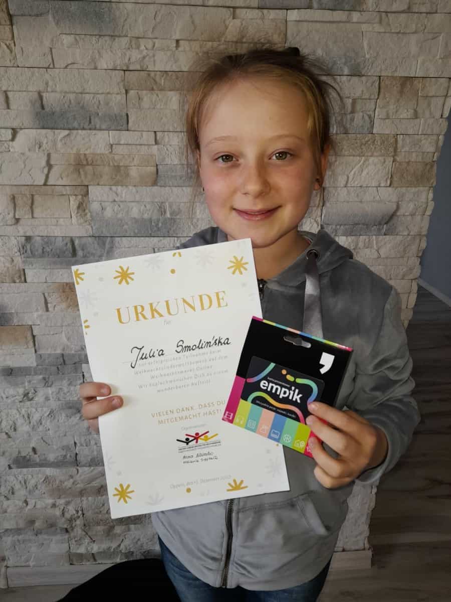 Związek Młodzieży Mniejszości Niemieckiej w Opolu ogłosił konkurs, którego przedmiotem było przedstawienie niemieckojęzycznych kolęd. Uczennica naszej szkoły Julia Smolińska – klasa VI b wzięła udział w konkursie on-line, nagrywając wykonanie kolędy „Kling Glöckchen, klingelingekling”. podczas transmisji jarmarku on-line.