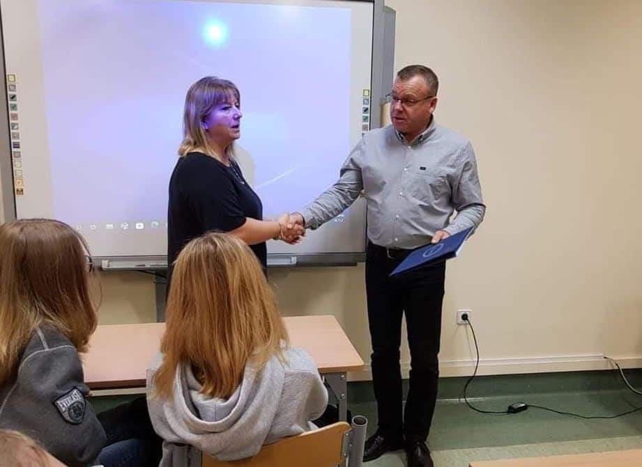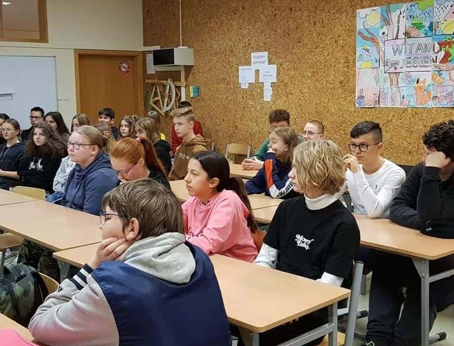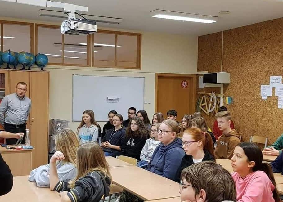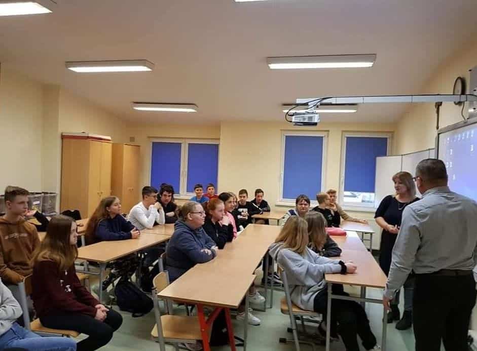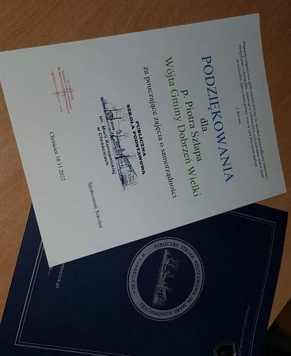 W piątek , 18.11.2022 r. w naszej szkole gościliśmy Wójta Gminy Dobrzeń Wielki- p. Piotra Szlapę, który spotkał się z młodzieżą klas ósmych. Przybliżył uczniom bardzo ważne treści dotyczące roli samorządu terytorialnego, działań podejmowanych przez władzę uchwałodawczą i wykonawczą. Przypomniał postacie Radnych z terenu naszej gminy. Na koniec zachęcał młodzież do działań na rzecz swojego środowiska lokalnego. Uczniowie wyrazili swoje zadowolenie i wdzięczność za spotkanie nagradzając Wójta gromkimi brawami i zapraszając na kolejne spotkania. P. dyrektor Dorota Lewandowska-Jaroń podziękowała w imieniu Społeczności Szkolnej wręczają c pamiątkowy dyplom a Pan Wójt obdarował wszystkich uczestników spotkania miłymi niespodziankami.
