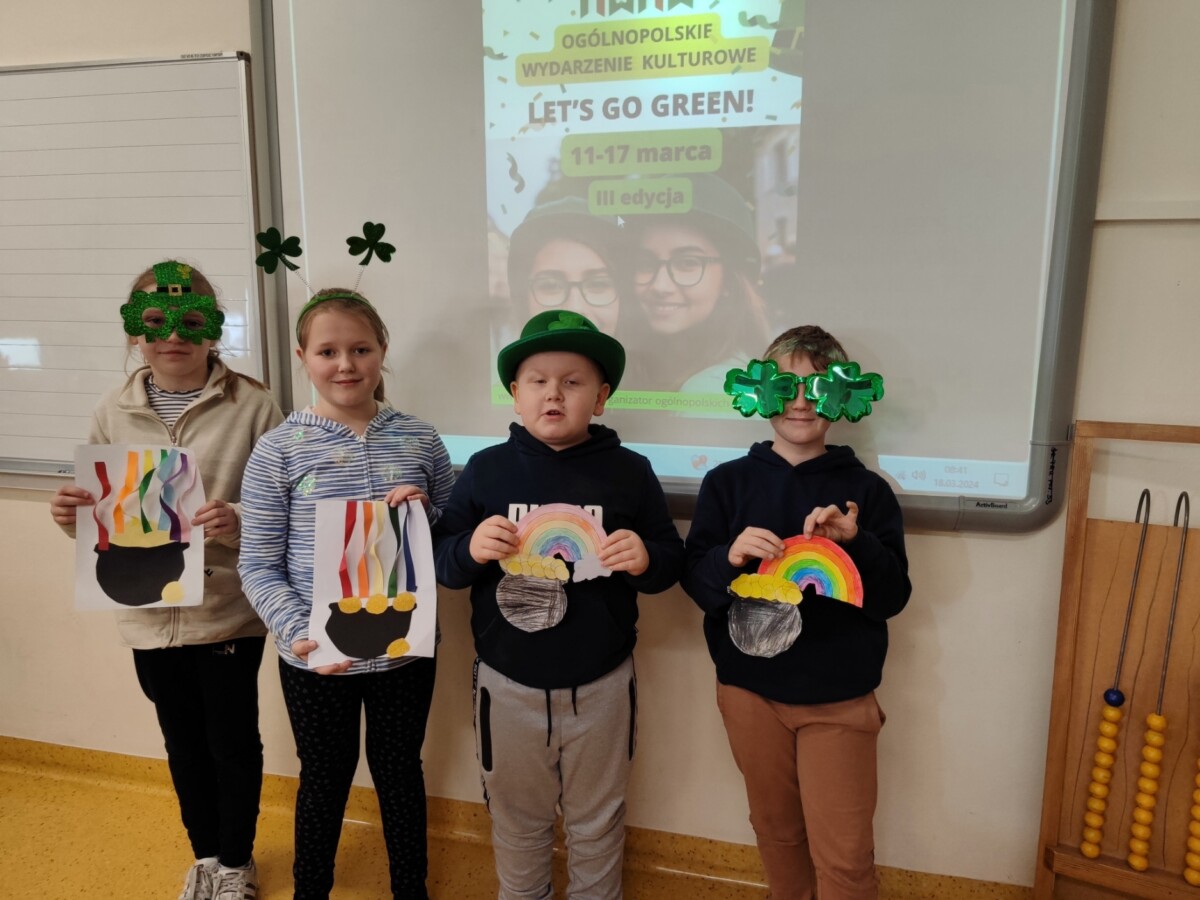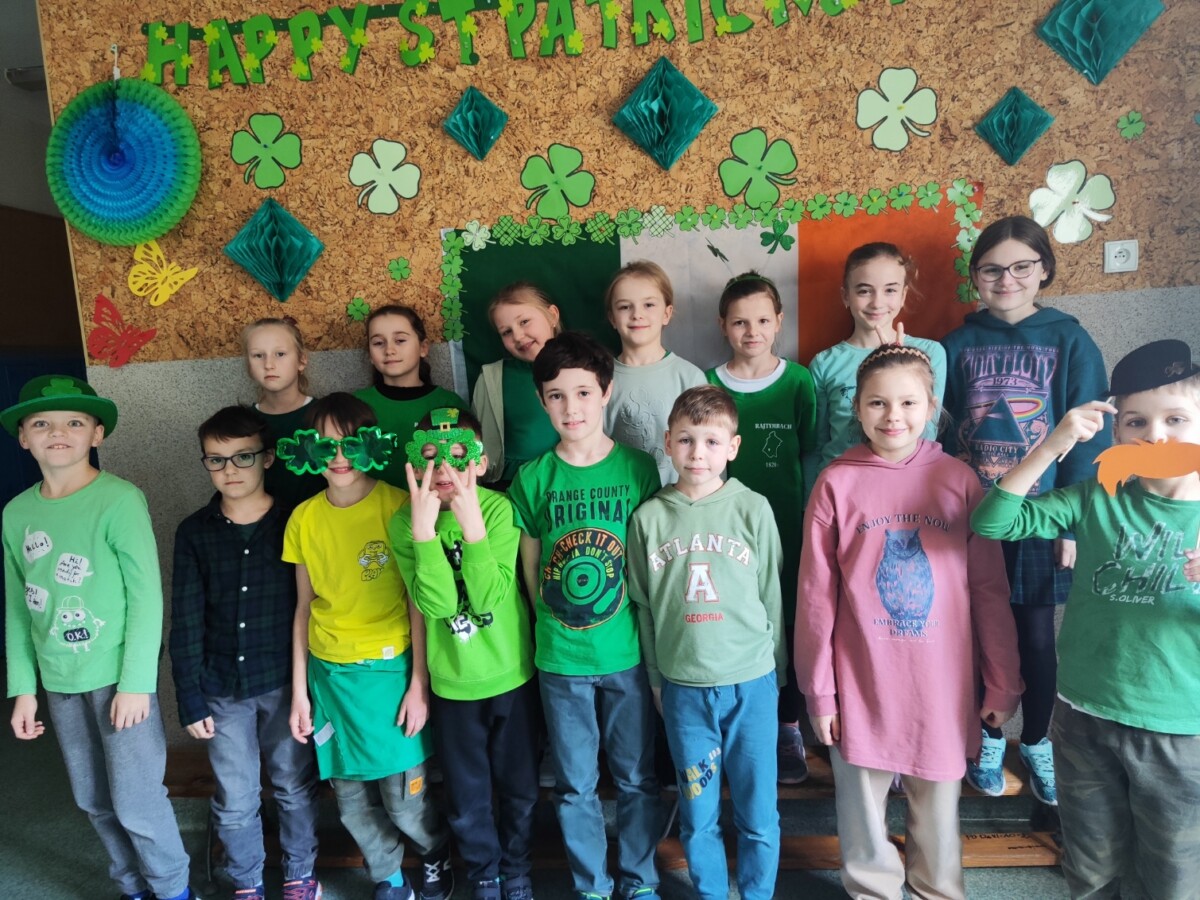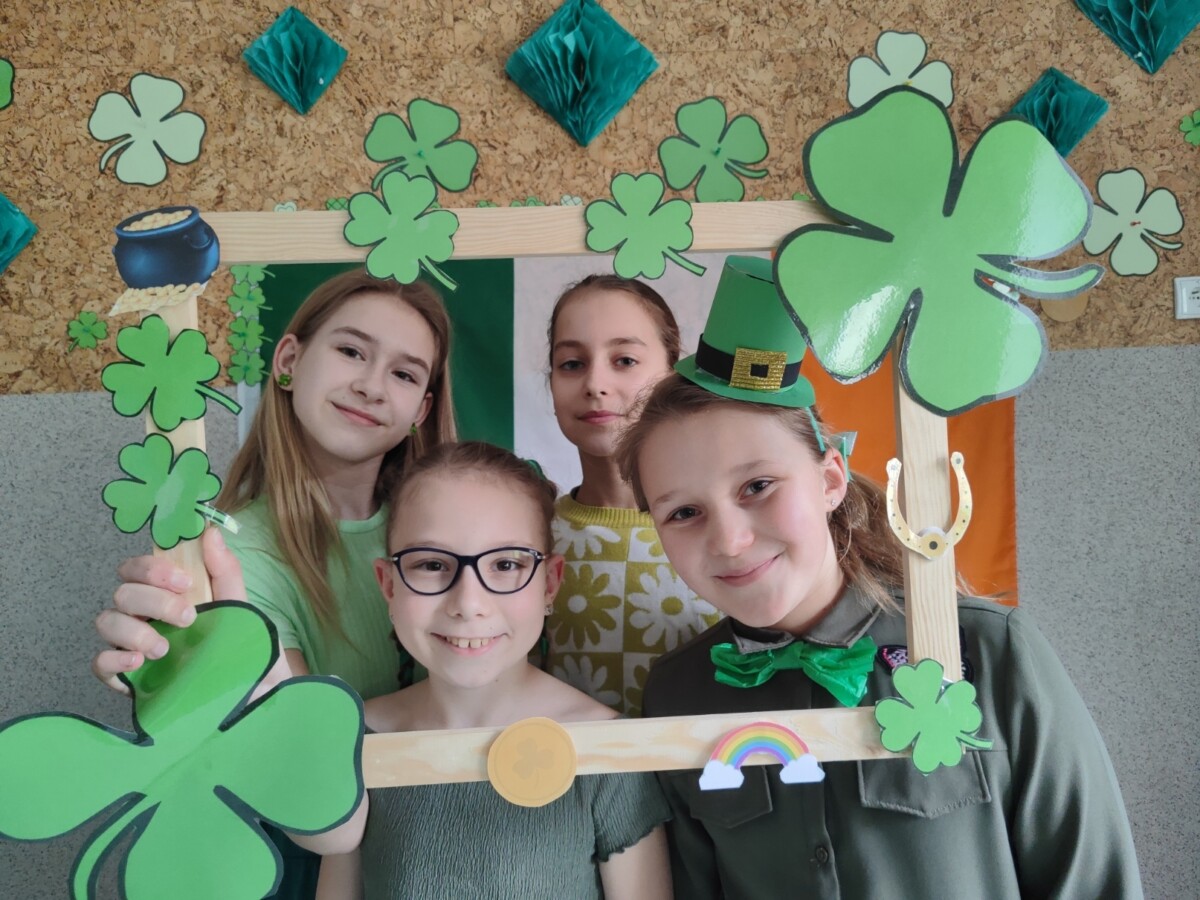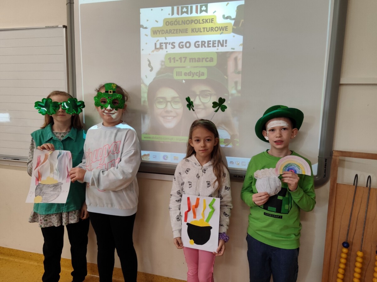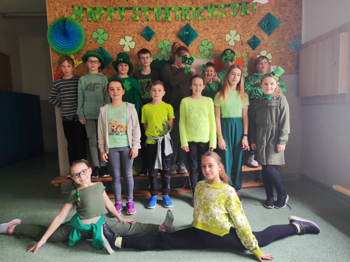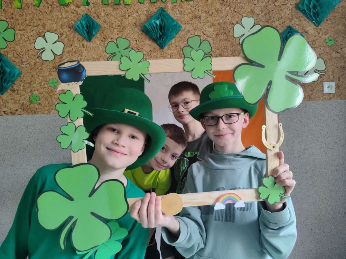 W dniach 13-19 marca uczniowie naszej szkoły wzięli udział w ogólnopolskim wydarzeniu kulturowym „Let’s Go Green” zorganizowanym z okazji Dnia Świętego Patryka. Na lekcjach języka angielskiego klasy poznały bliżej biografię Świętego Patryka oraz kulturę i tradycję Irlandii. Na uczniów czekało wiele wyzwań, takich jak liczenie do 10 po irlandzku oraz odtańczenie Irish Jig Dance. Uczniowie przygotowali także dekoracje, lapbooki i plakaty prezentujące ciekawostki związane z Zielonym Świętem. Starsze klasy wzięły również udział w grze terenowej, w której poszukiwali ciekawostek o Irlandii rozmieszczonych na szkolnym korytarzu. W ramach podsumowania wydarzenia uczniowie całej szkoły ubrali się na zielono, a w nagrodę czekała na nich mini fotobudka i słodkie poczęstunki. Wybrane zespoły z klas 4-7 wzięły udział w szkolnym konkursie „Let’s go green”, który sprawdził ich wiedzę na temat Zielonej Wyspy oraz Świętym Patryku. Najlepiej poradzili sobie przedstawiciele klasy 5: Paweł Kossak, Maksymilian Ledwolorz i Kuba Śmiarowski.