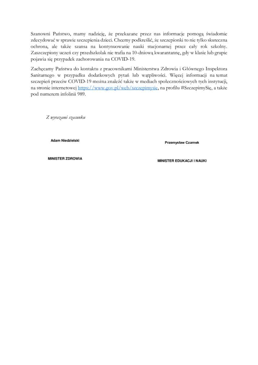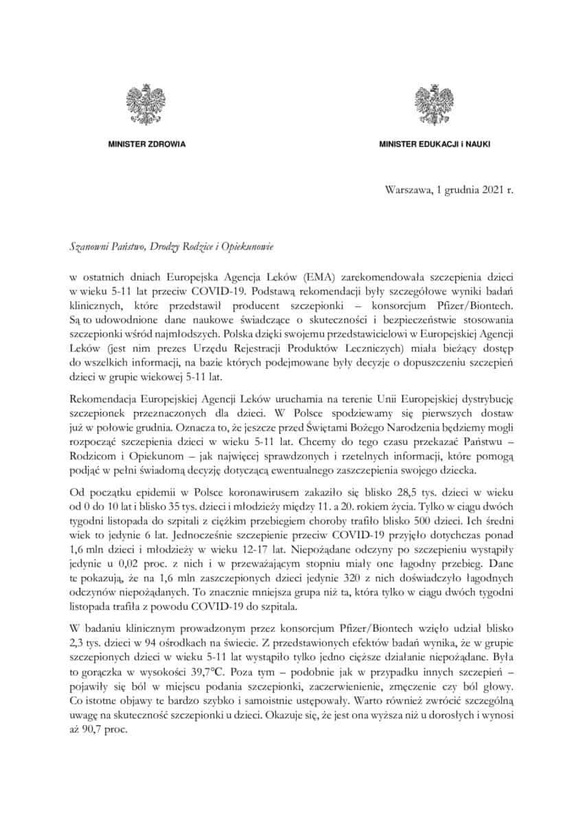List Ministra Edukacji i Nauki oraz Ministra Zdrowia w sprawie szczepień dzieci w wieku 5-11 lat