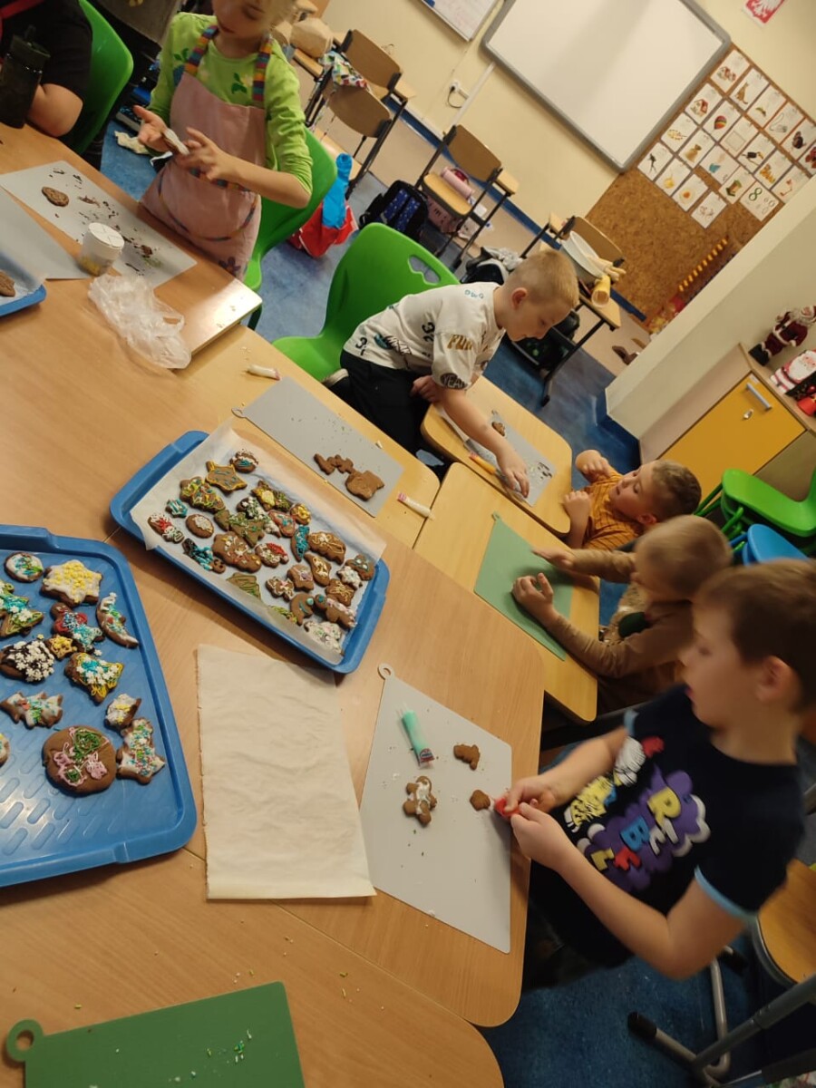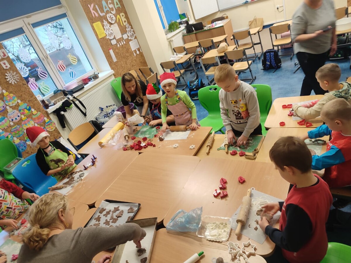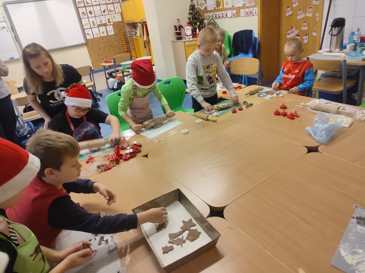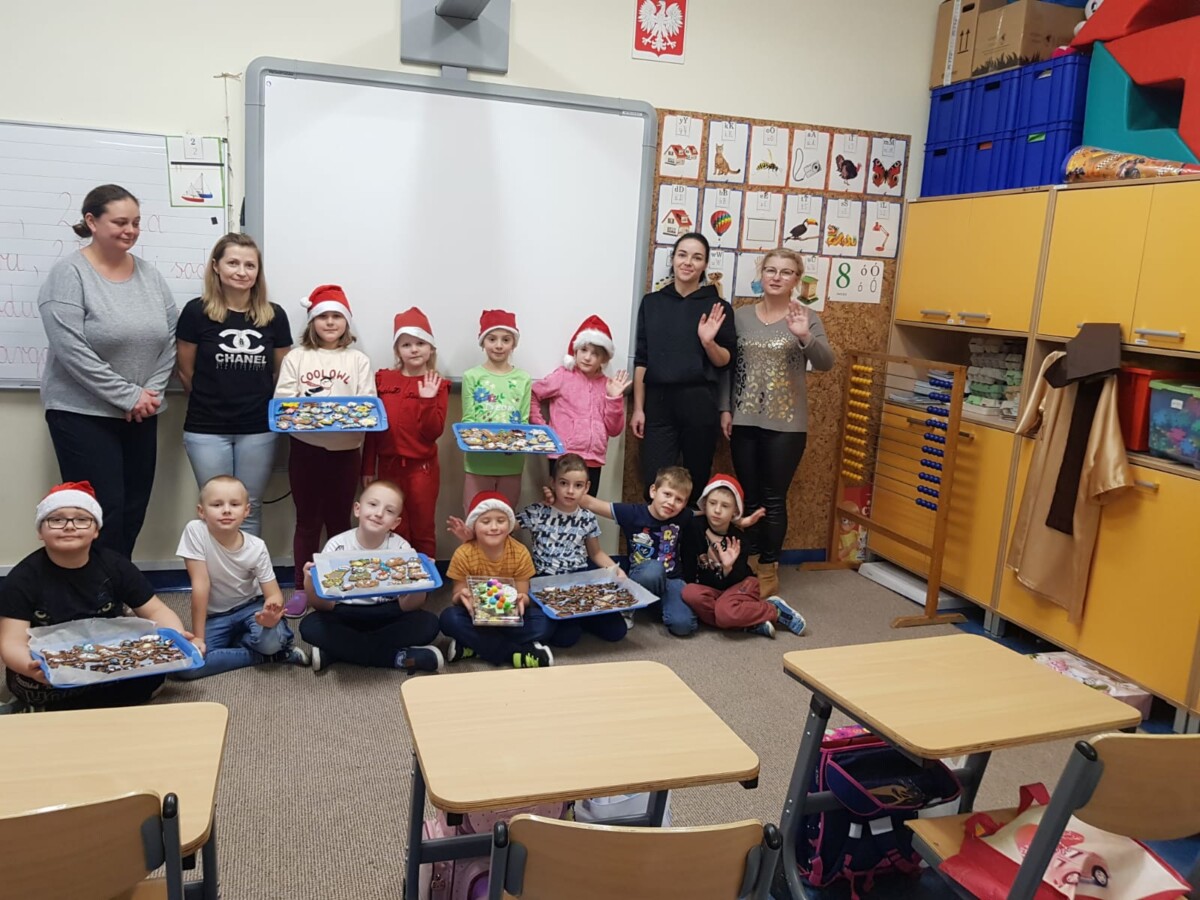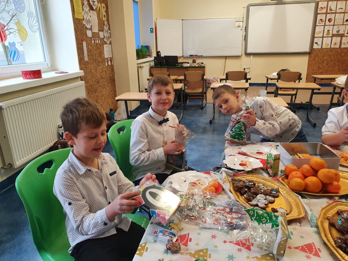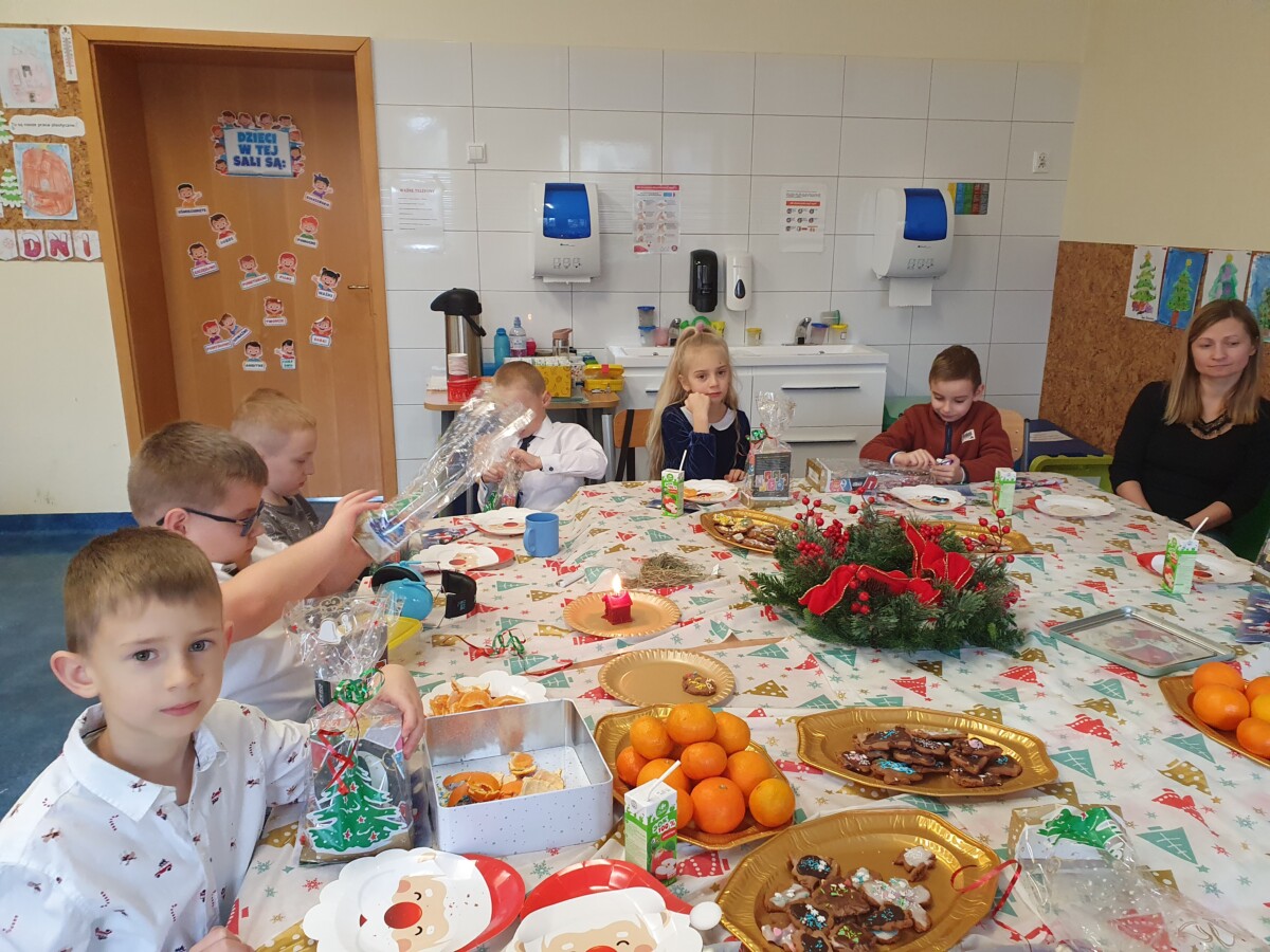 Uczniowie klasy 1 b po raz pierwszy obchodzili klasową wigilię w murach naszej szkoły. Dzień przed wigilią wspólnie upiekli pierniczki. Śpiewali kolędy. Składali sobie życzenie, dzieląc się opłatkiem. A za dobre uczynki otrzymali prezenty od Dzieciątka. Każdy przy klasowym wigilijnym stole opowiadał o smacznych potrawach przygotowywanych tradycyjnie przez swoje mamy i babcie. W tym dniu wszyscy byli dla siebie mili i życzliwi. Magia świąt….