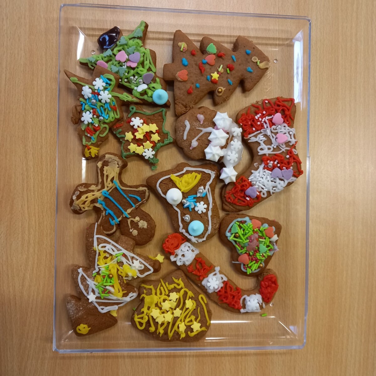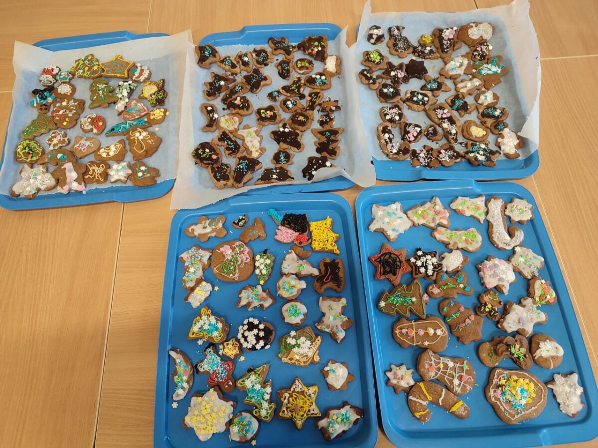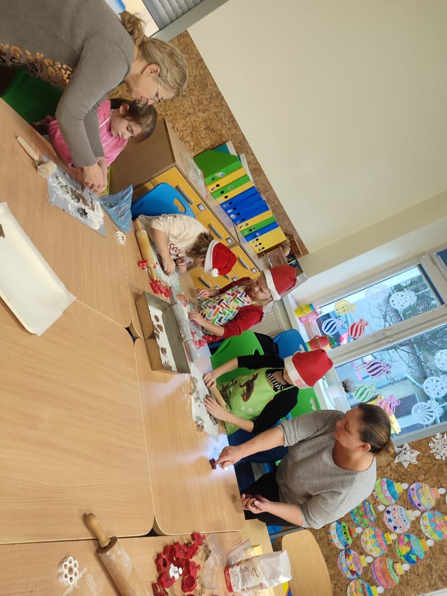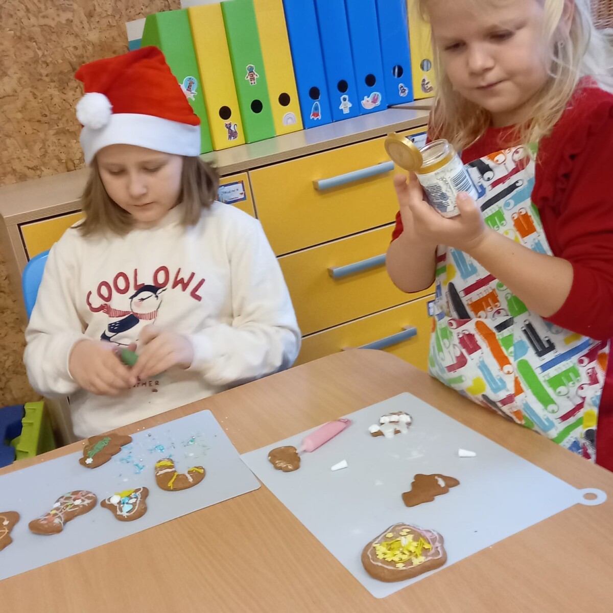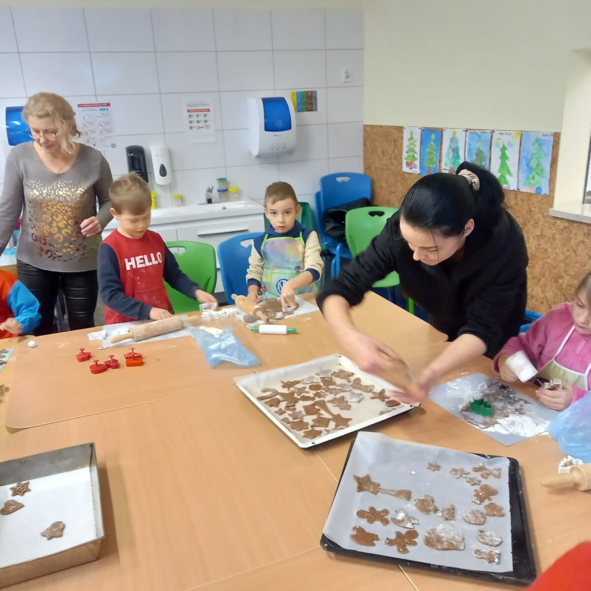 Uczniowie klasy 1 b po raz pierwszy obchodzili klasową wigilię w murach naszej szkoły. Dzień przed wigilią wspólnie upiekli pierniczki. Śpiewali kolędy. Składali sobie życzenie, dzieląc się opłatkiem. A za dobre uczynki otrzymali prezenty od Dzieciątka. Każdy przy klasowym wigilijnym stole opowiadał o smacznych potrawach przygotowywanych tradycyjnie przez swoje mamy i babcie. W tym dniu wszyscy byli dla siebie mili i życzliwi. Magia świąt….